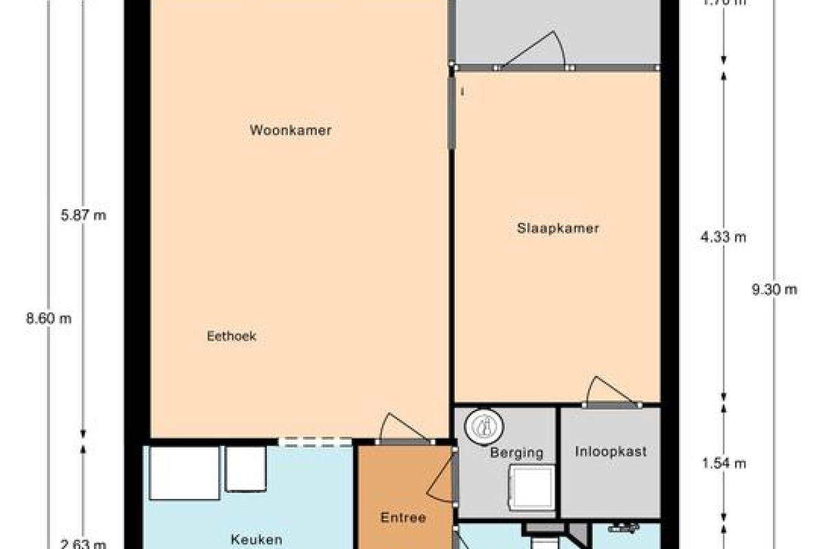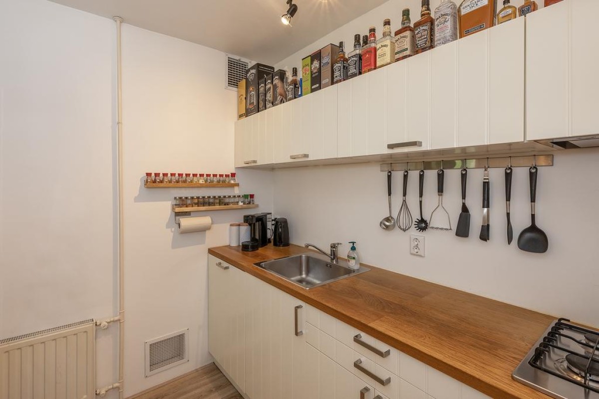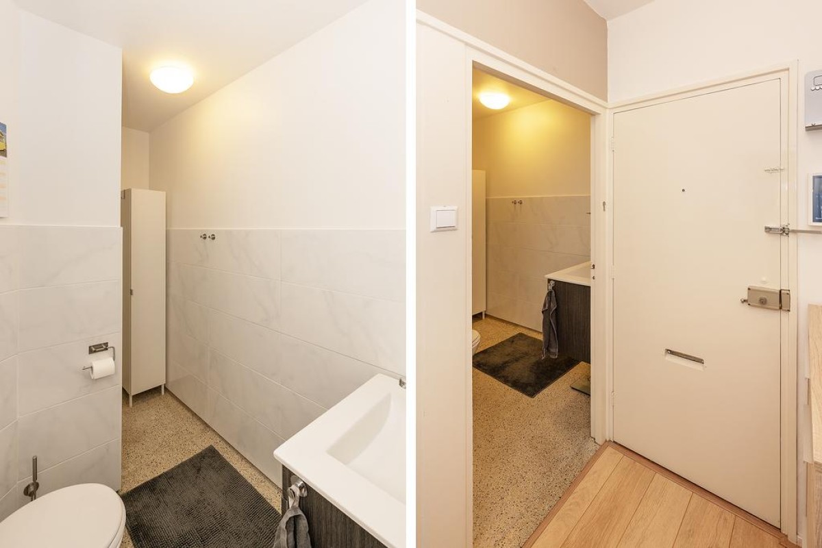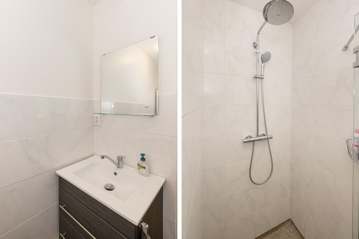 Middengang, portaaltje met (nieuwe) meterkast, entree, berging met wasmachineaansluiting en boiler ( eigendom), badkamer met vaste wastafel, toilet en een douche met thermostaatkraan.