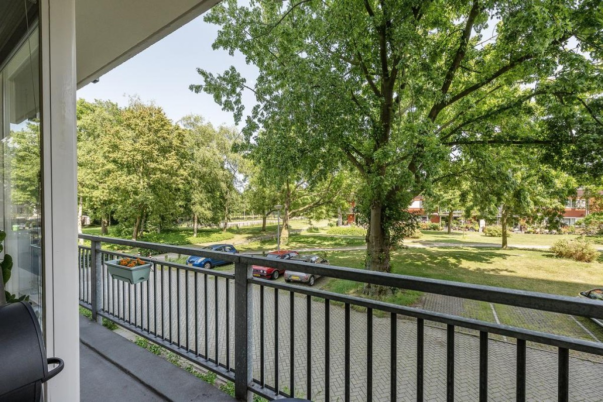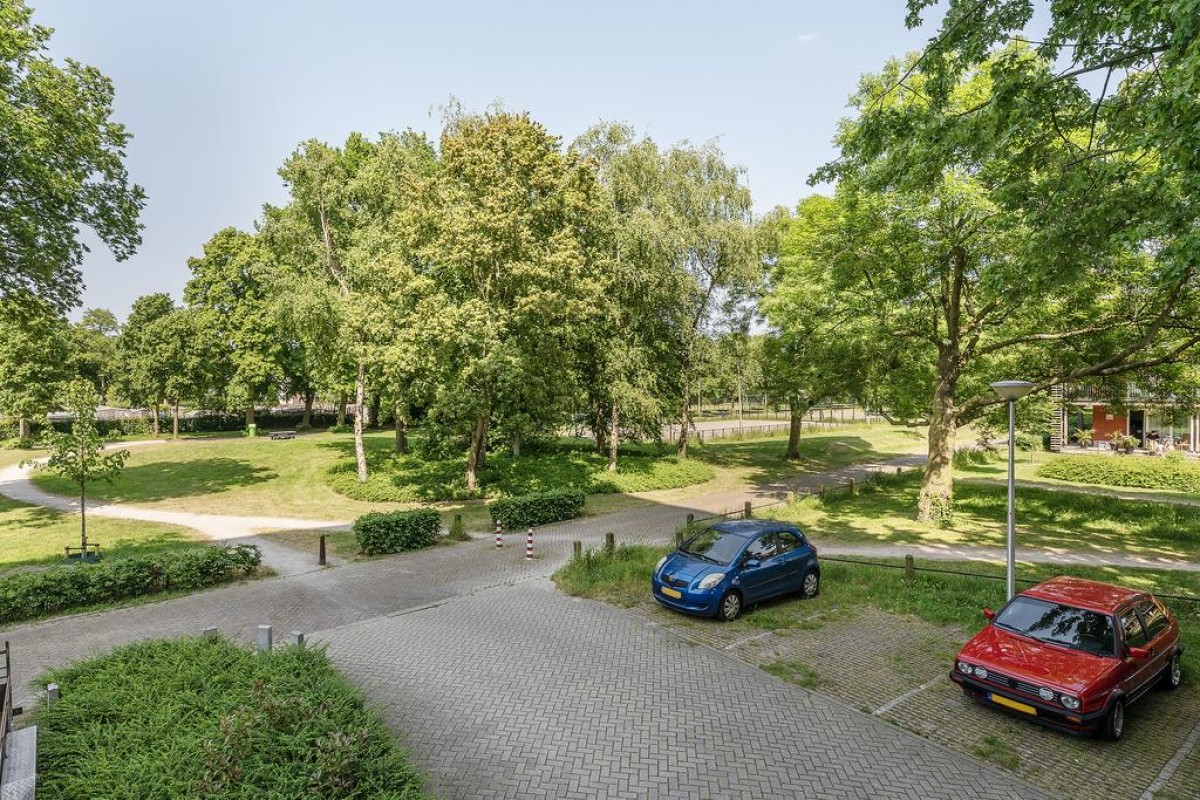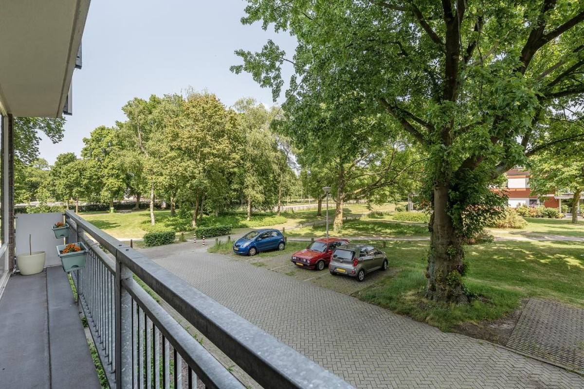 Aan de woonkamer grenst de ruime slaapkamer met laminaatvloer en grote inloopkast. Het balkon is over de volle breedte en ligt op het oosten en kijkt fraai uit op de parkachtige omgeving.