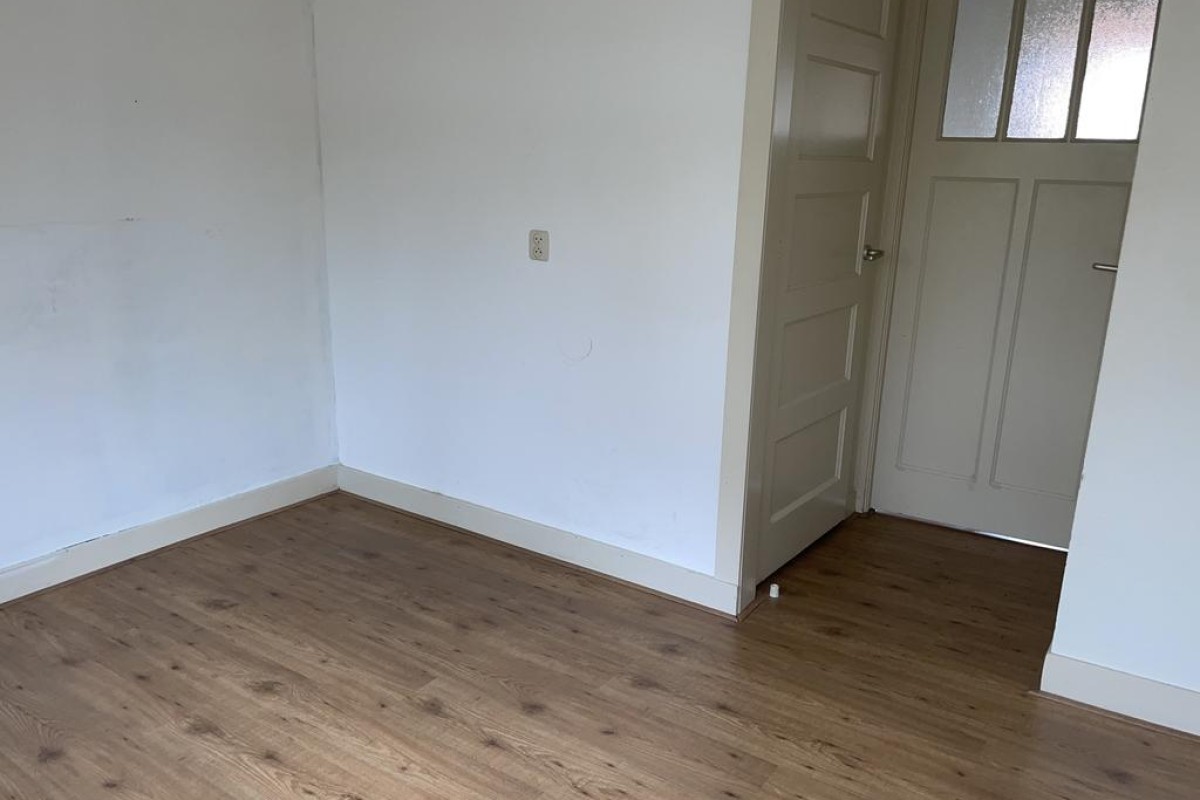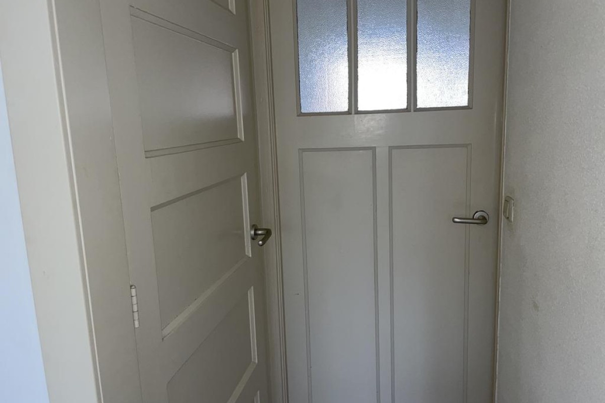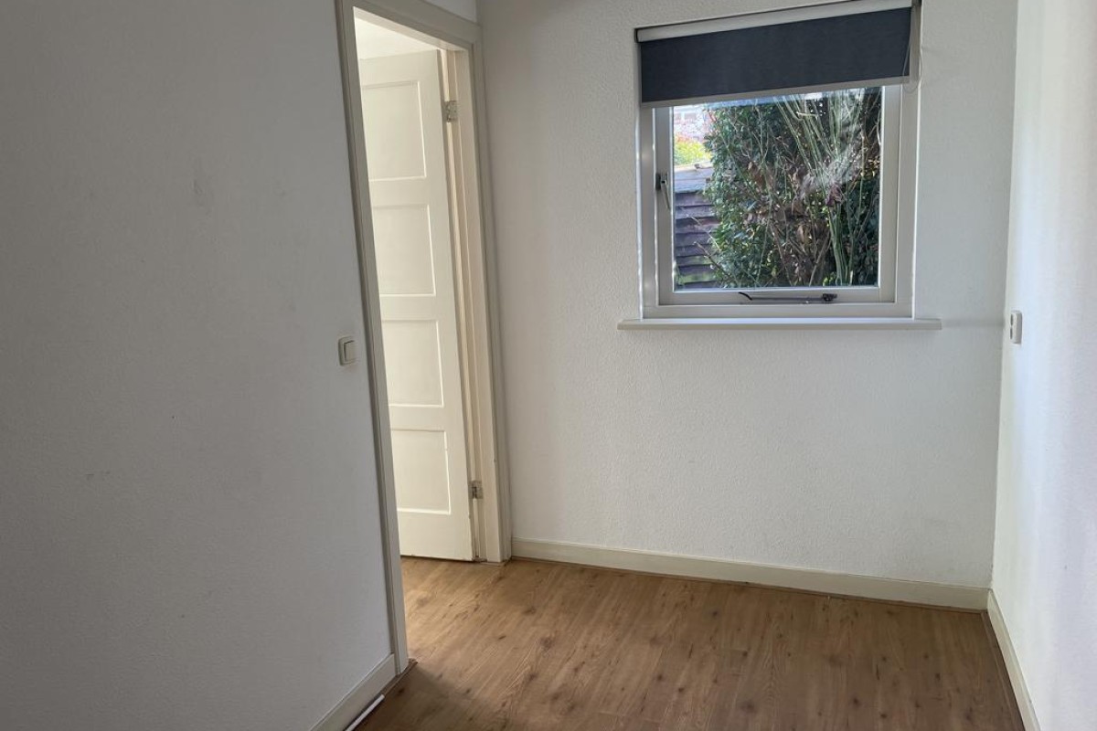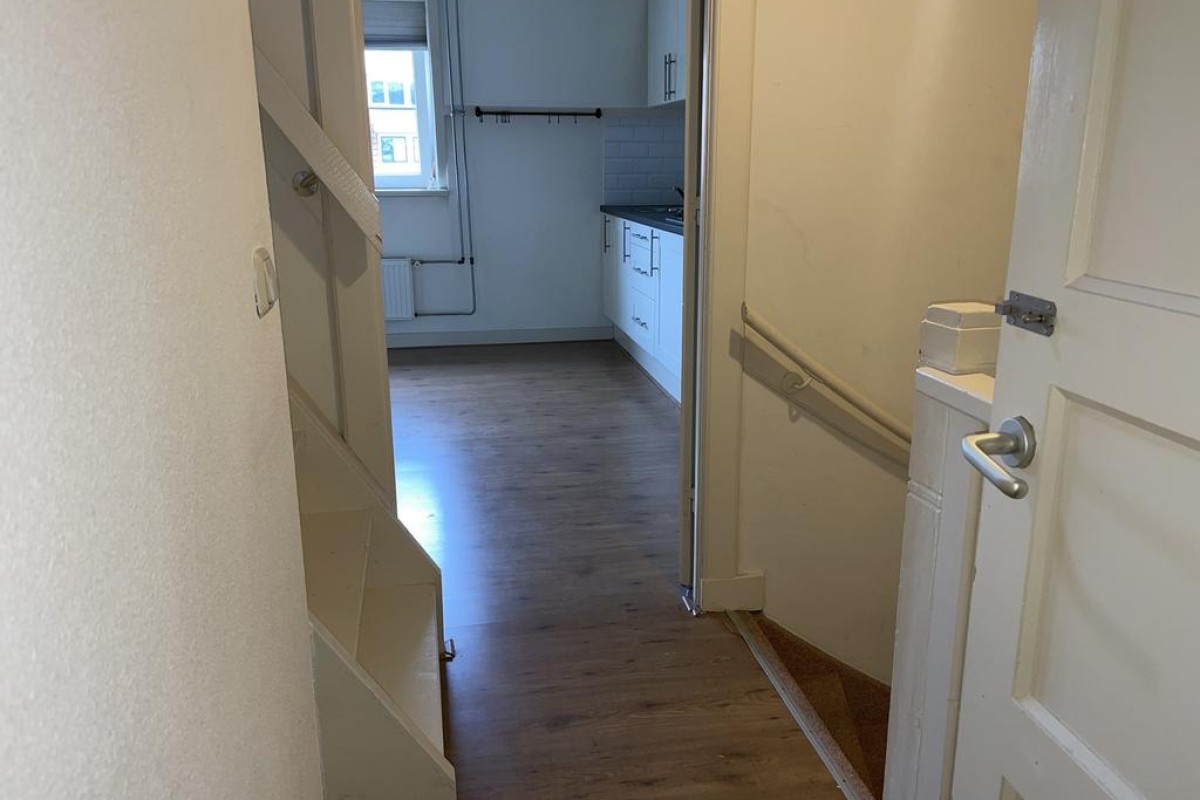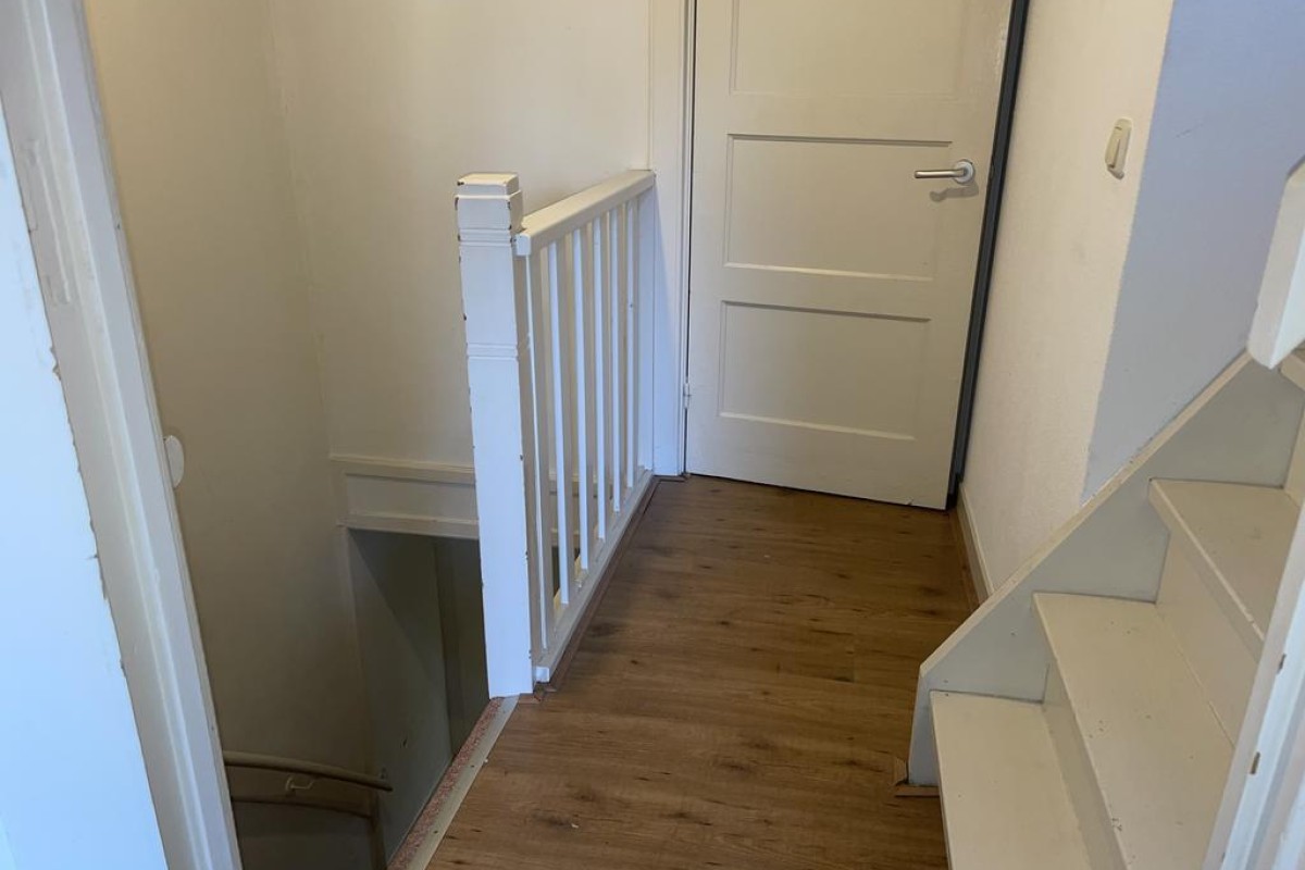 Entree en achter de voordeur de hal met trapopgang naar de verdieping, toegang tot de kelder, het toilet (uitgevoerd met vrij hangend wandcloset), badkamer voorzien van douche, wastafel en aansluiting voor de wasmachine is ook heel fraai als bijkeuken te gebruiken en doorgang naar de woonkamer. De beganegrond is in 2011 over de volledige breedte van de woning 2,50 meter uitgebouwd. Momenteel treft u op deze woonlaag twee slaapkamers en een openkeuken in de woonkamer. Op eenvoudige wijze is de indeling te wijzigen in één grote royale woonkamer.