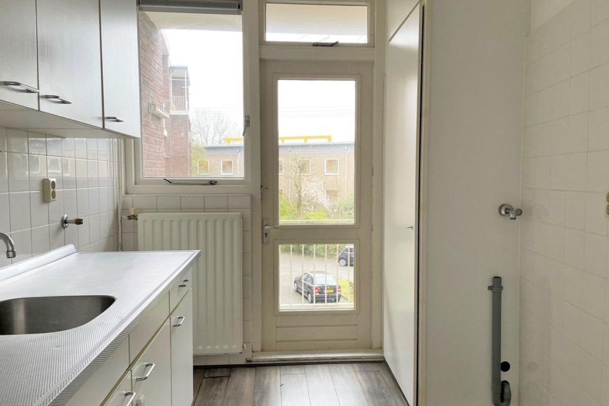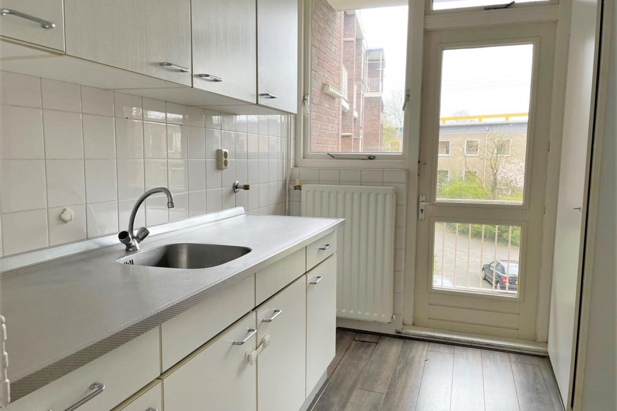 De keuken is gelegen aan de achterzijde van het appartement en voorzien van een eenvoudig keukenblok en geeft toegang tot een klein balkon.