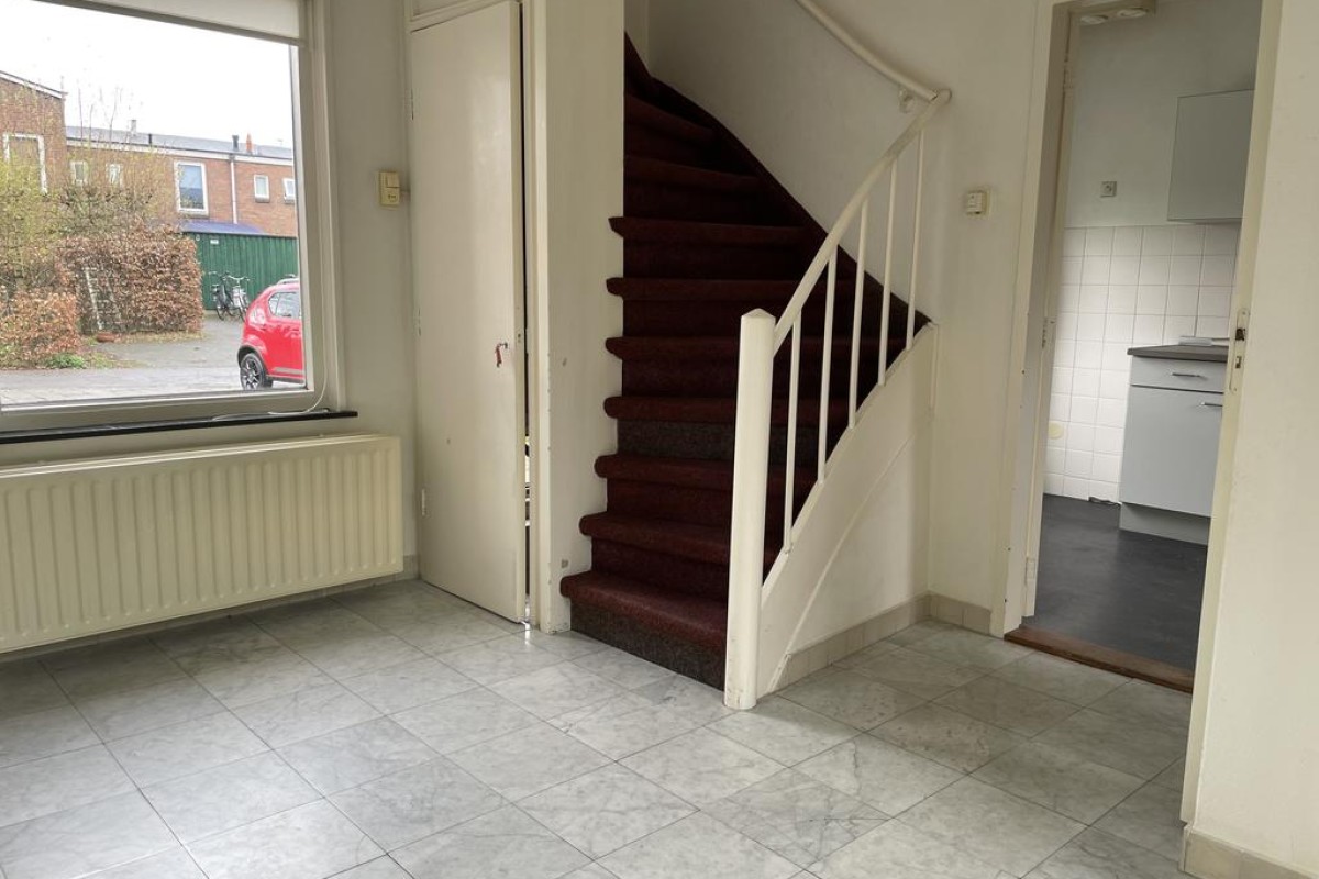 Ruime hal met trapopgang, toegang tot de kelder van circa 12m2, het toilet, de ruime woonkamer en de dichte keuken. De woonkamer heeft veel lichtinval door de grote raampartij aan de achterzijde. De afgesloten keuken beschikt over een doorgang die toegang biedt naar binnenplaats en berging.