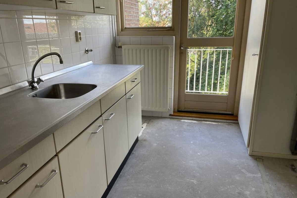 De keuken is gelegen aan de achterzijde van het appartement en voorzien van een eenvoudig keukenblok en geeft toegang tot een klein balkon.