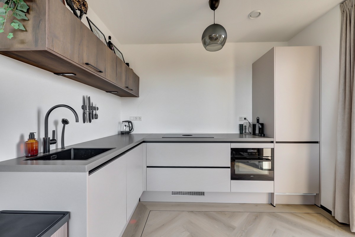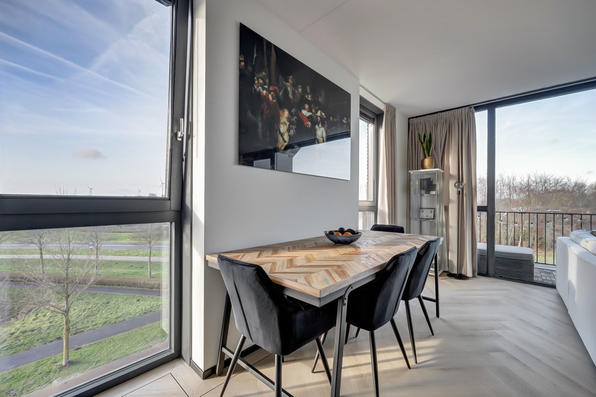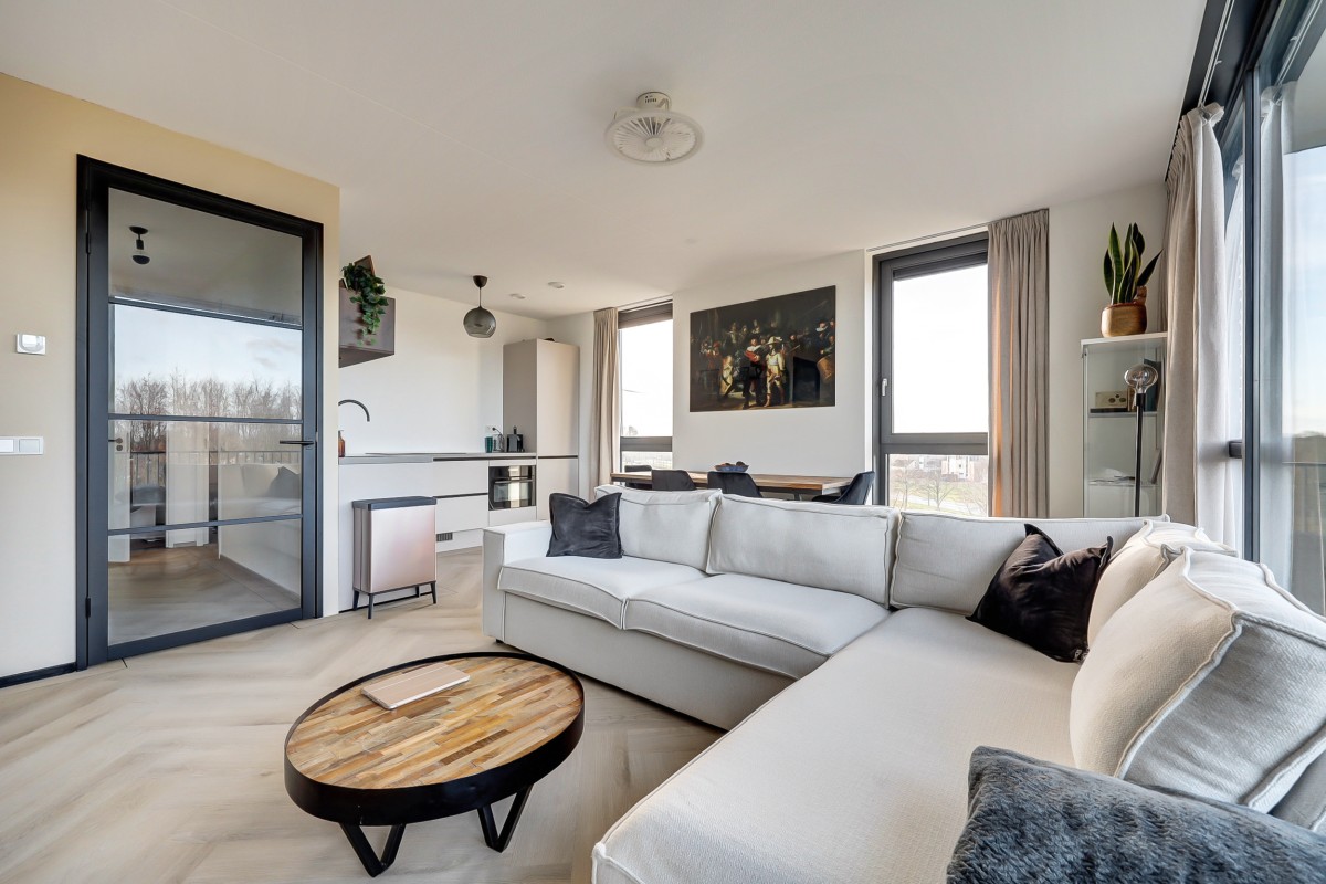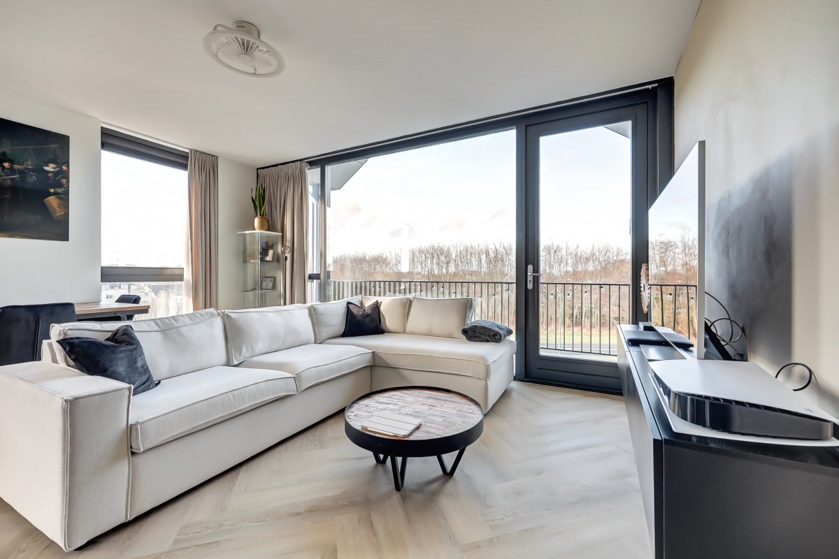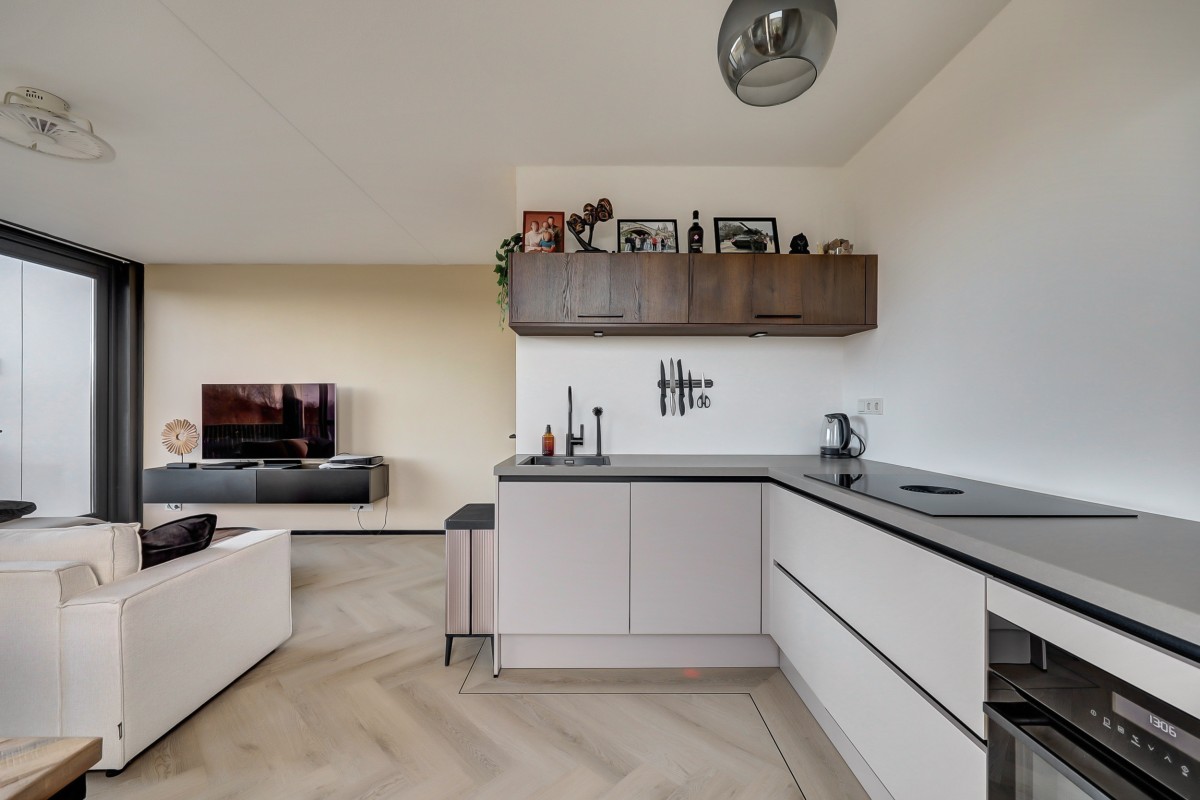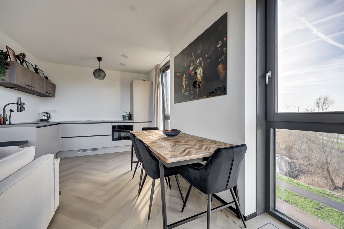 Entree, hal met meterkast (3-fase), een praktische bergkast en toegang tot de moderne badkamer en de slaapkamer. Middels een fraaie glasdeur is er toegang tot de lichte keuken en de woonkamer. De woonkamer is voorzien van grote raampartijen die zorgen voor veel natuurlijk licht en voorzien van een fraaie pvc visgraat vloer. De luxe keuken is uitgevoerd in een lichte taupe kleurstelling en voorzien van diverse inbouwapparatuur waaronder een inductie kookplaat met downdraft afzuiging, een koel-vriescombinatie, een oven en een vaatwasser. Middels een loopdeur in de woonkamer is het ruime balkon te bereiken. Het balkon is overdekt, voorzien van terrastegels en heeft een fantastisch uitzicht!