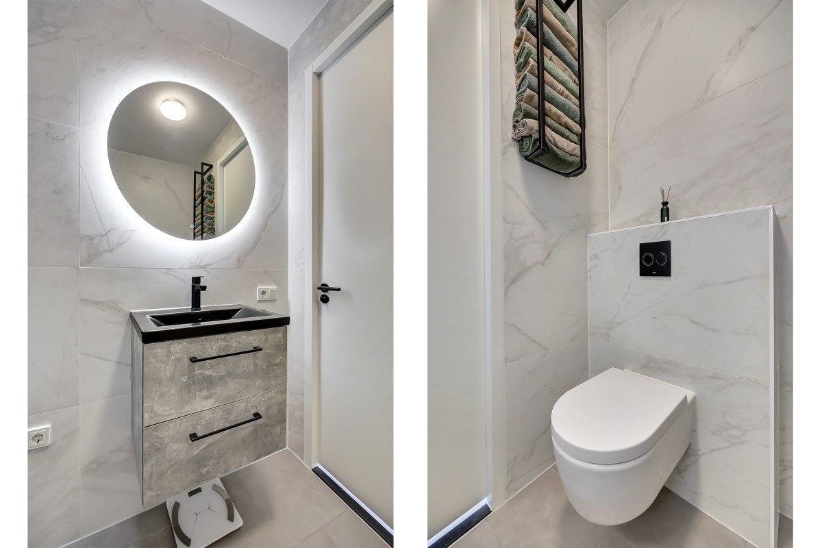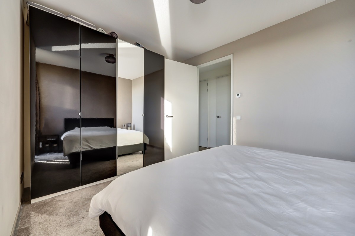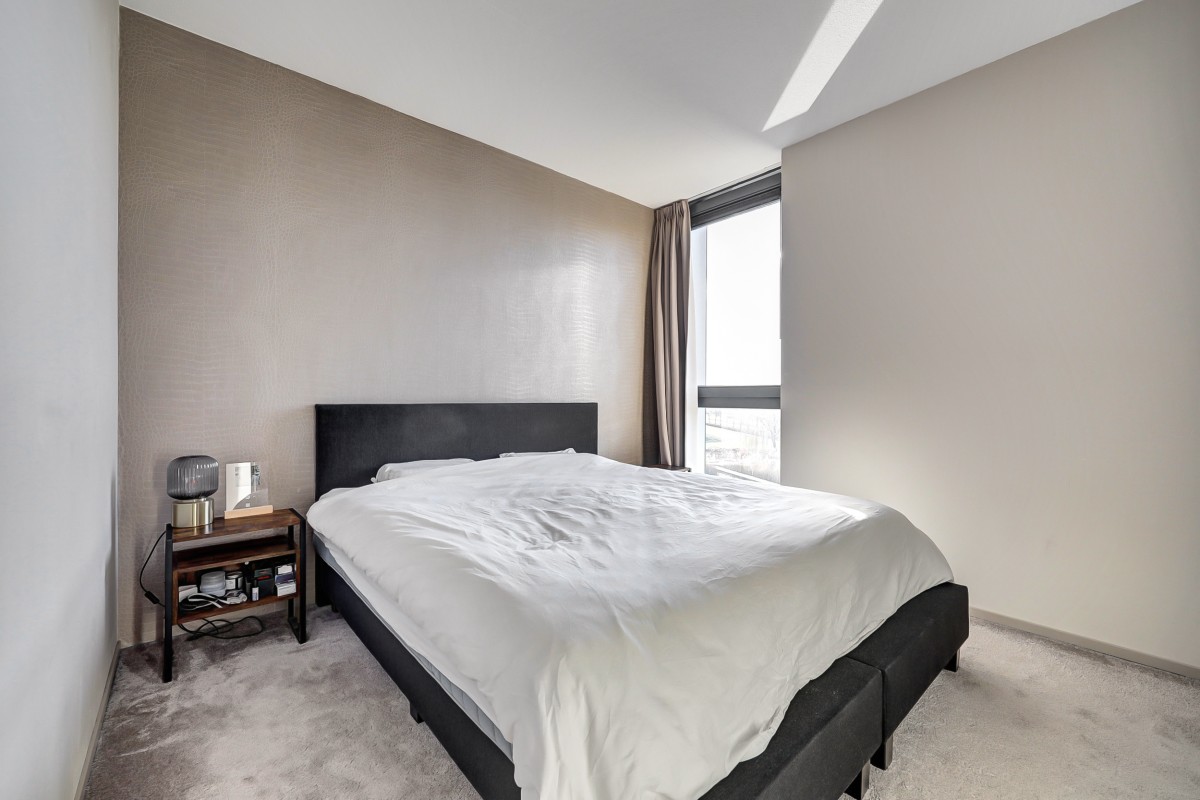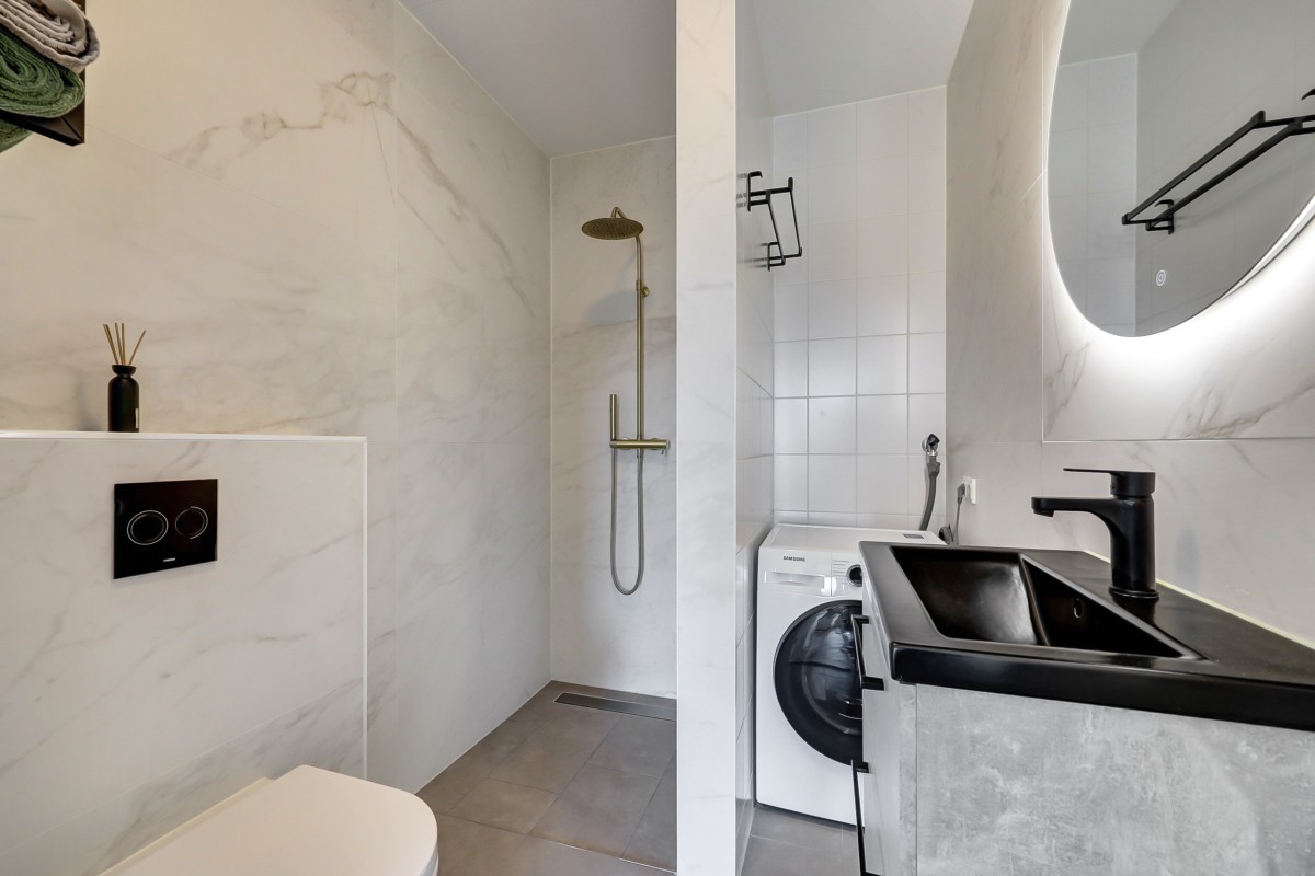De slaapkamer heeft een prettig formaat en is afgewerkt met een comfortabele tapijtvloer, is verder praktisch ingedeeld en biedt ruimte voor een tweepersoonsbed en een kledingkast. De luxe badkamer is uitgevoerd in een witte marmerlook en beschikt over een inloopdouche, een hangcloset, een wastafelmeubel en de aansluitingen voor de wasapparatuur.