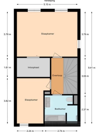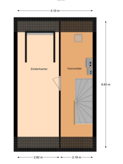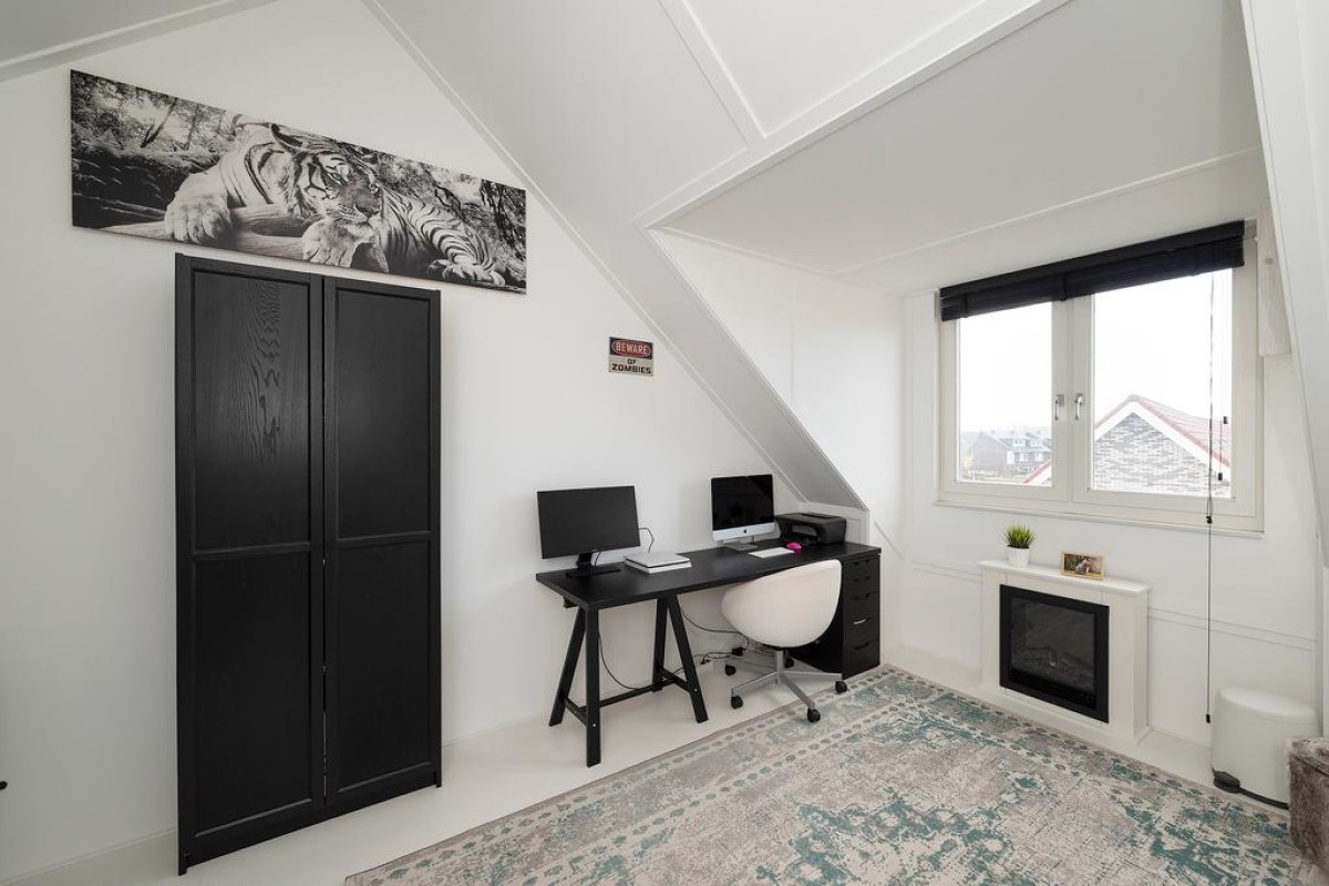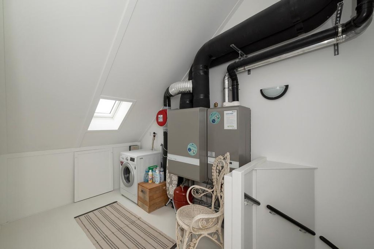 2e Verdieping: voorzolder met opstelling voor de hybride warmtepomp, wasmachineaansluiting en een bergkast en een derde slaapkamer met dakkapel en bergruimte achter de knieschotten.