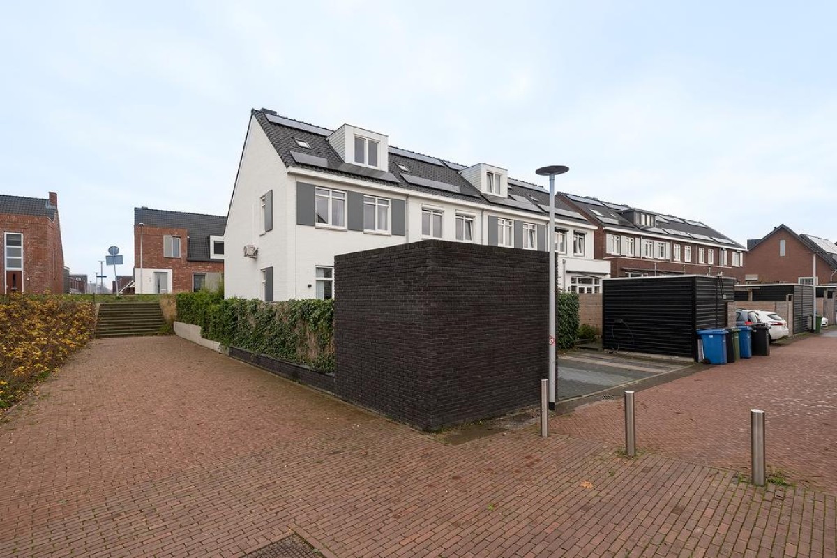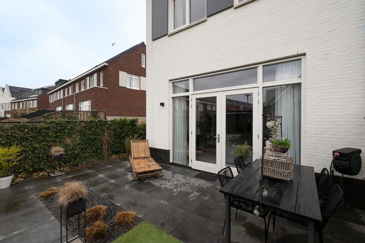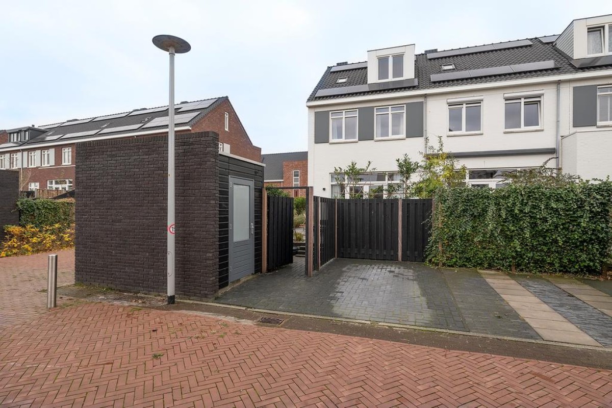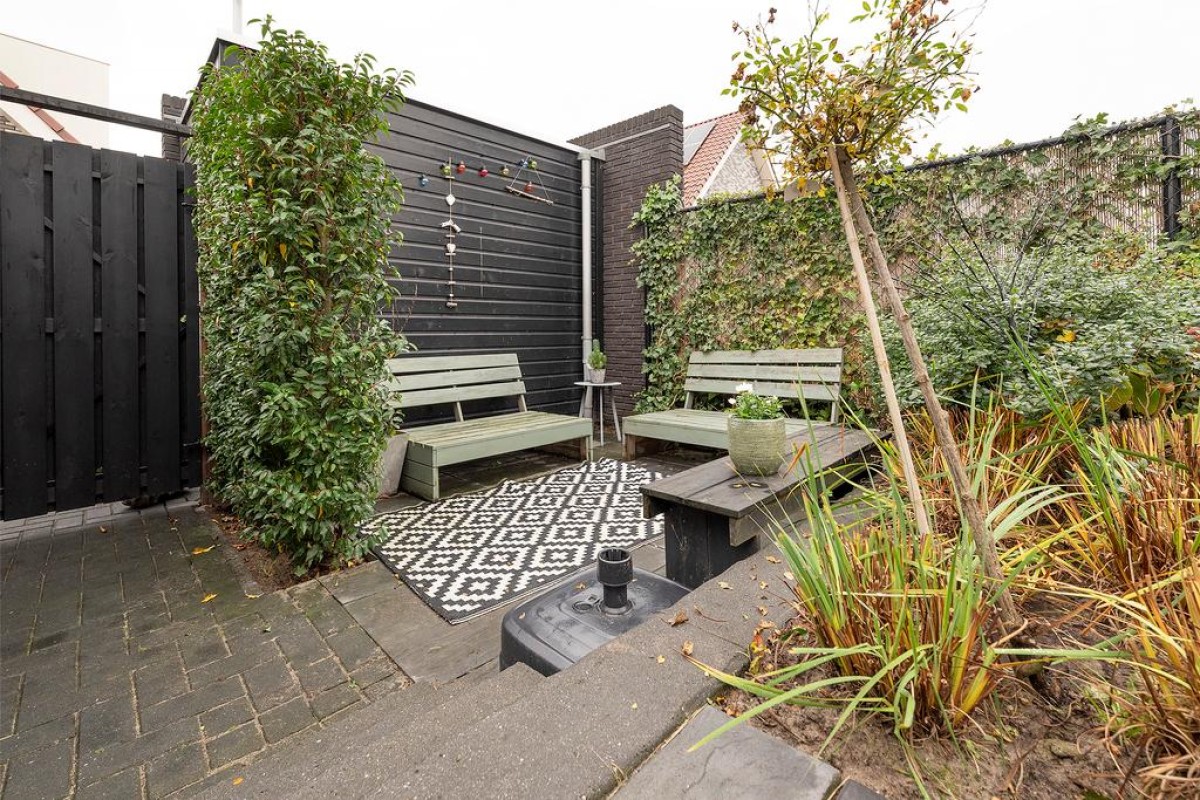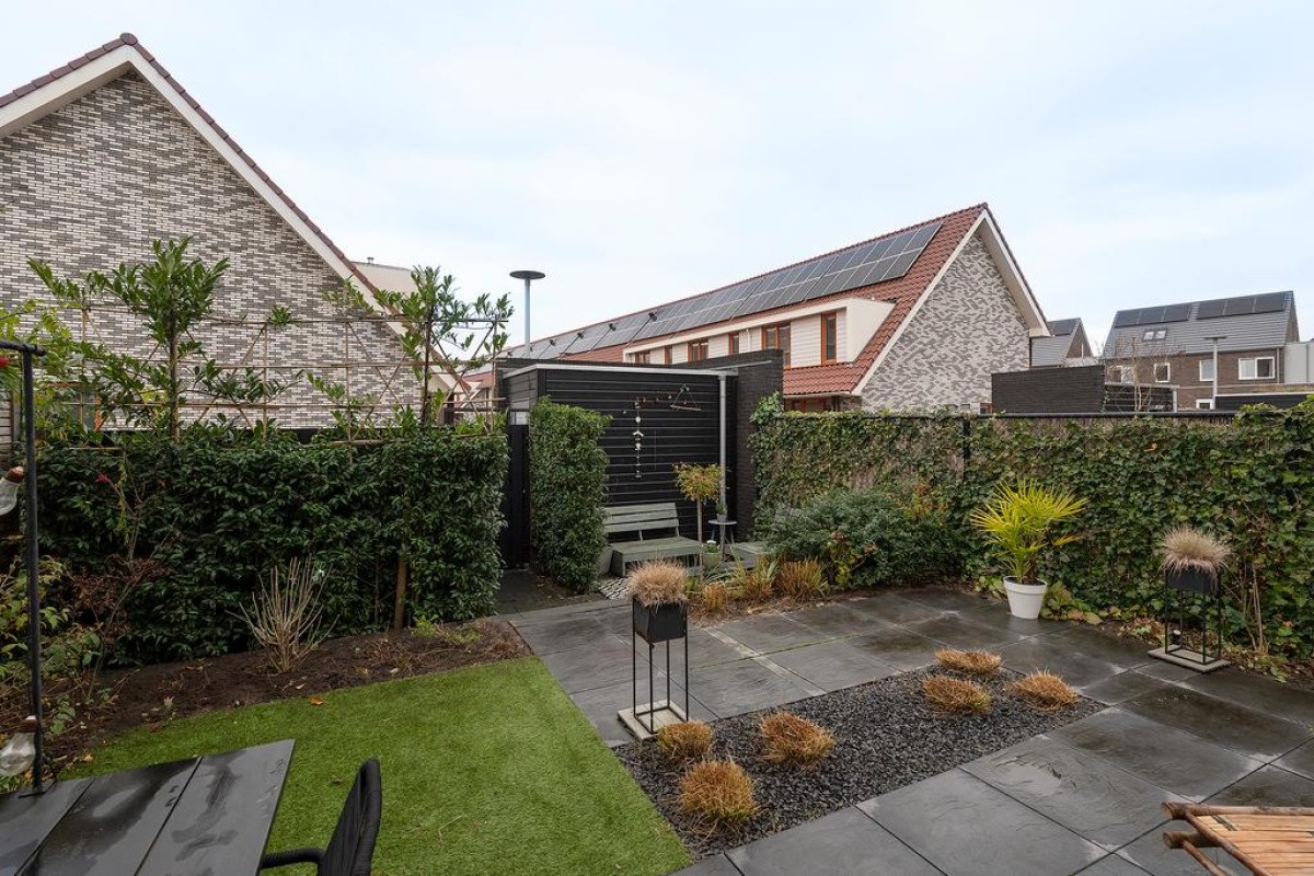 Aan de achterzijde bevindt zich de speels ingerichte achtertuin met afwisselend terrasjes en borders met groen. De berging en de eigen parkeerplaats bevinden zich achterin de tuin.