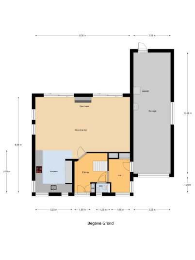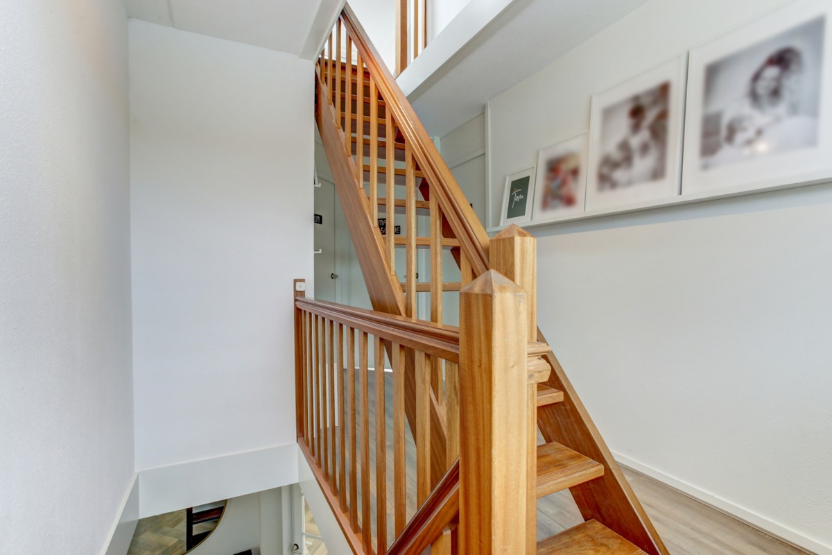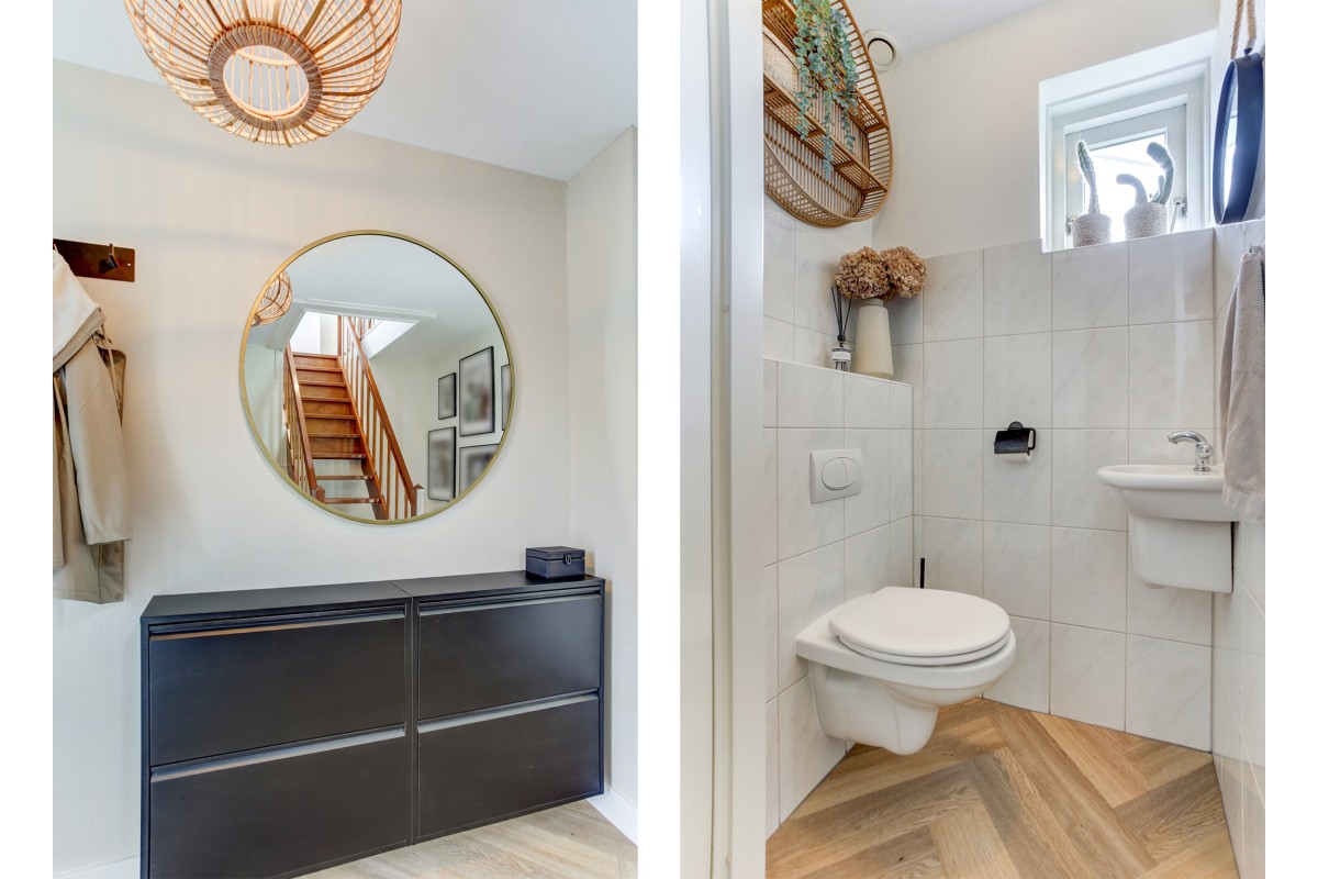 Begane grond: overdekte entree naar de royale hal met hardhouten trapopgang, uitgebreide meterkast, toiletruimte met hangcloset en fonteintje. Een glasdeur biedt toegang tot de ruime living.