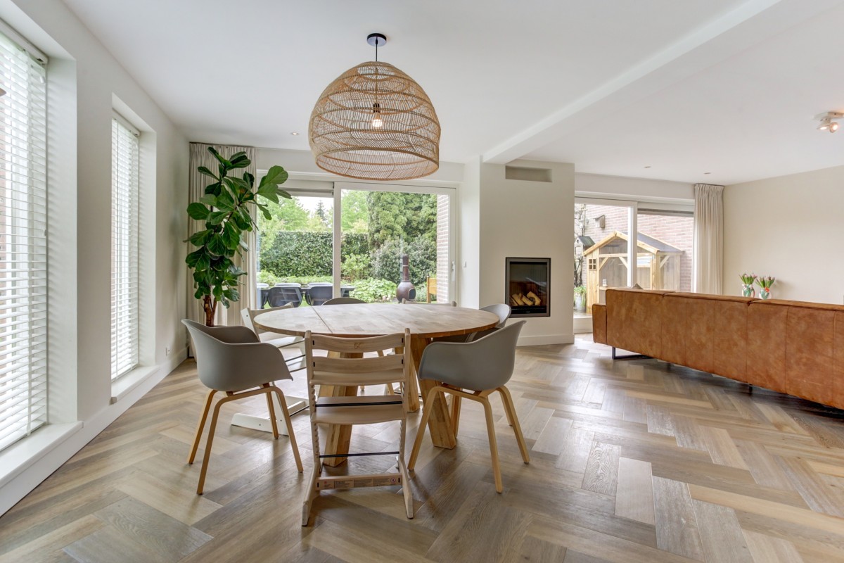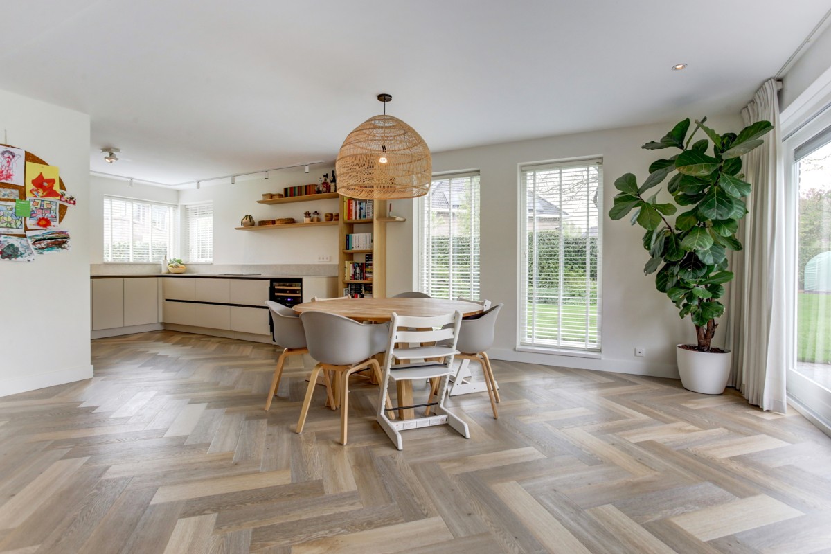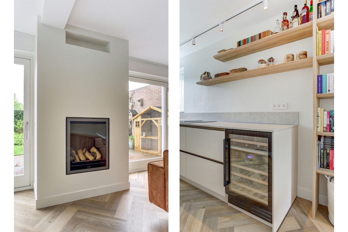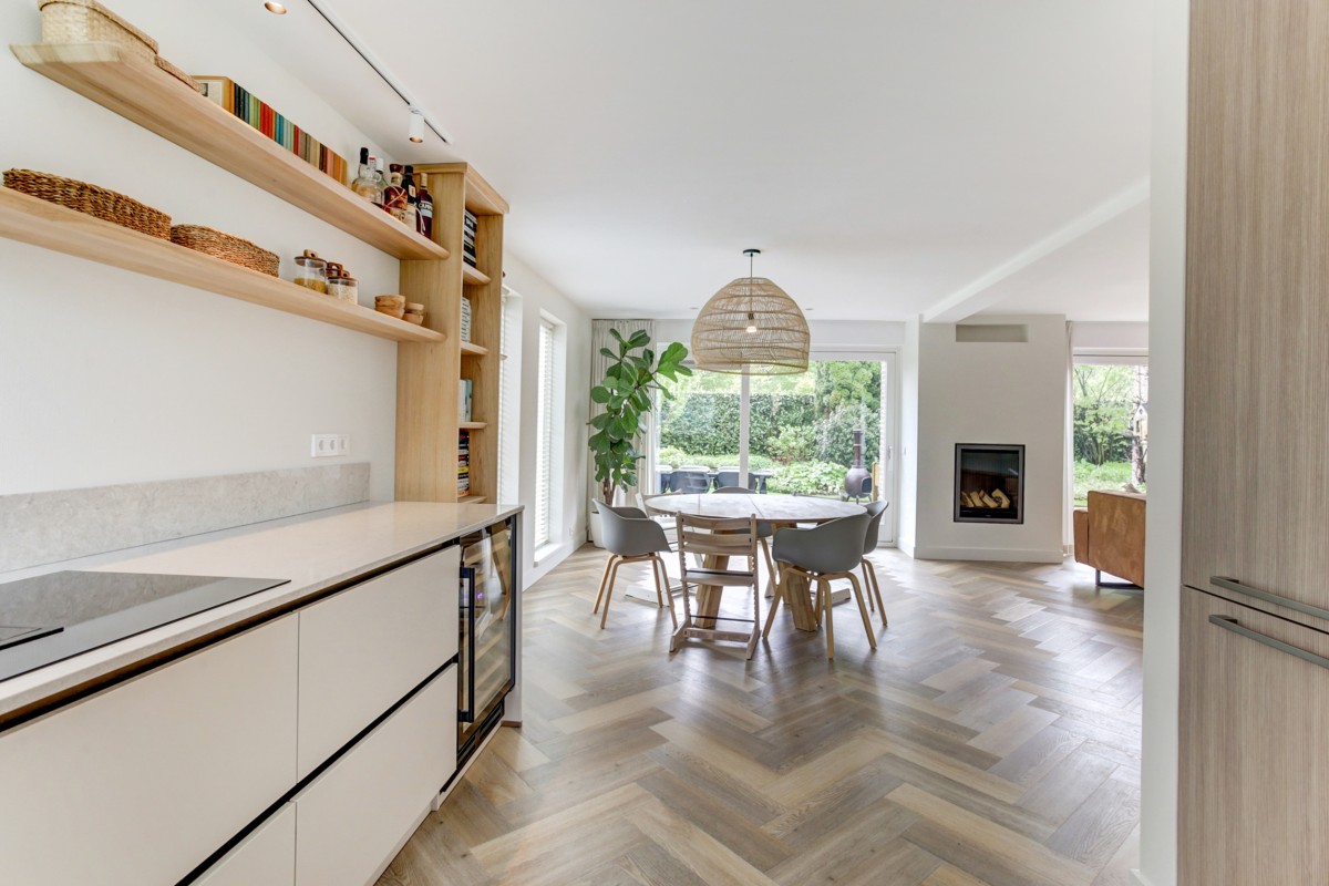 Lees verderDe living is net als de hal voorzien van een visgraat pvc-vloer met vloerverwarming, prachtige vlakke wand- en plafondafwerking gecombineerd met mooie gashaard. Aan de voorzijde is de prachtig nieuwe luxe keuken in een u-vorm opgesteld. De keuken is in warme kleuren uitgevoerd en voorzien van een kastenwand met brede koelkast en vrieskast, dubbele oven en vaatwasser. Leuke nissen en het grote werkblad bieden veel werkruimte en opbergruimte. Uiteraard is de keuken voorzien van een Quooker, een inductiekookplaat met down-draft afzuiging en een wijn-klimaatkast. De achterwand beschikt over een geïntegreerde spoelbak met Quooker, koelkast, vrieskast en combi-oven. De eethoek geeft overzicht over de tuin welke tevens middels een brede schuifpui te betreden is.