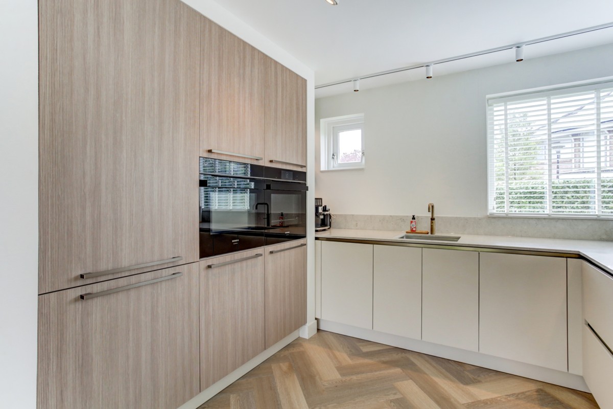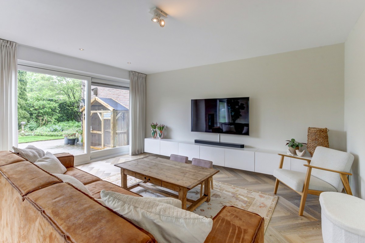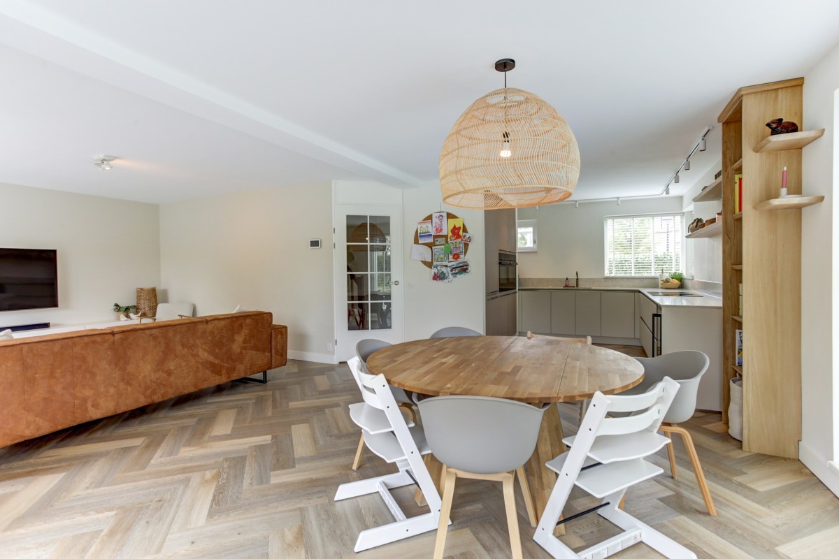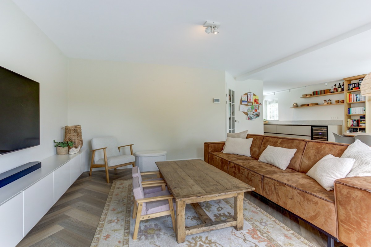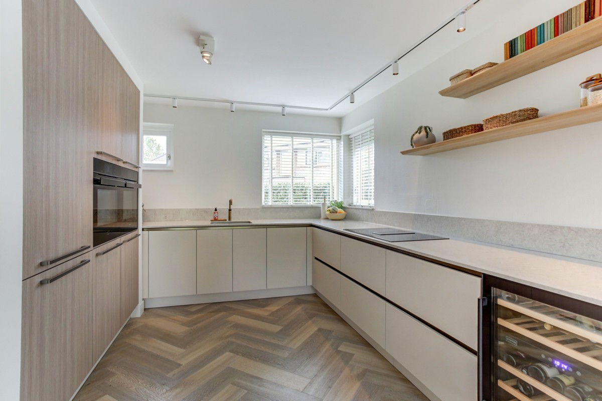 Lees verderDe living is net als de hal voorzien van een visgraat pvc-vloer met vloerverwarming, prachtige vlakke wand- en plafondafwerking gecombineerd met mooie gashaard. Aan de voorzijde is de prachtig nieuwe luxe keuken in een u-vorm opgesteld. De keuken is in warme kleuren uitgevoerd en voorzien van een kastenwand met brede koelkast en vrieskast, dubbele oven en vaatwasser. Leuke nissen en het grote werkblad bieden veel werkruimte en opbergruimte. Uiteraard is de keuken voorzien van een Quooker, een inductiekookplaat met down-draft afzuiging en een wijn-klimaatkast. De achterwand beschikt over een geïntegreerde spoelbak met Quooker, koelkast, vrieskast en combi-oven. De eethoek geeft overzicht over de tuin welke tevens middels een brede schuifpui te betreden is.
