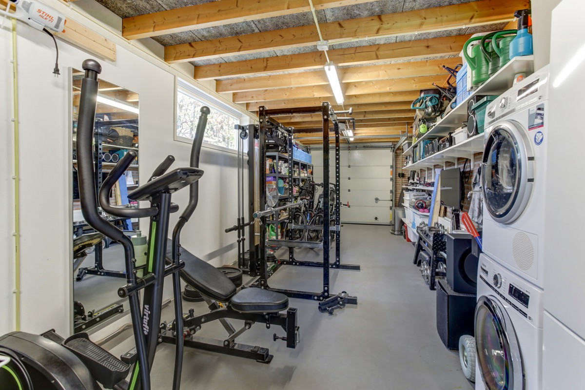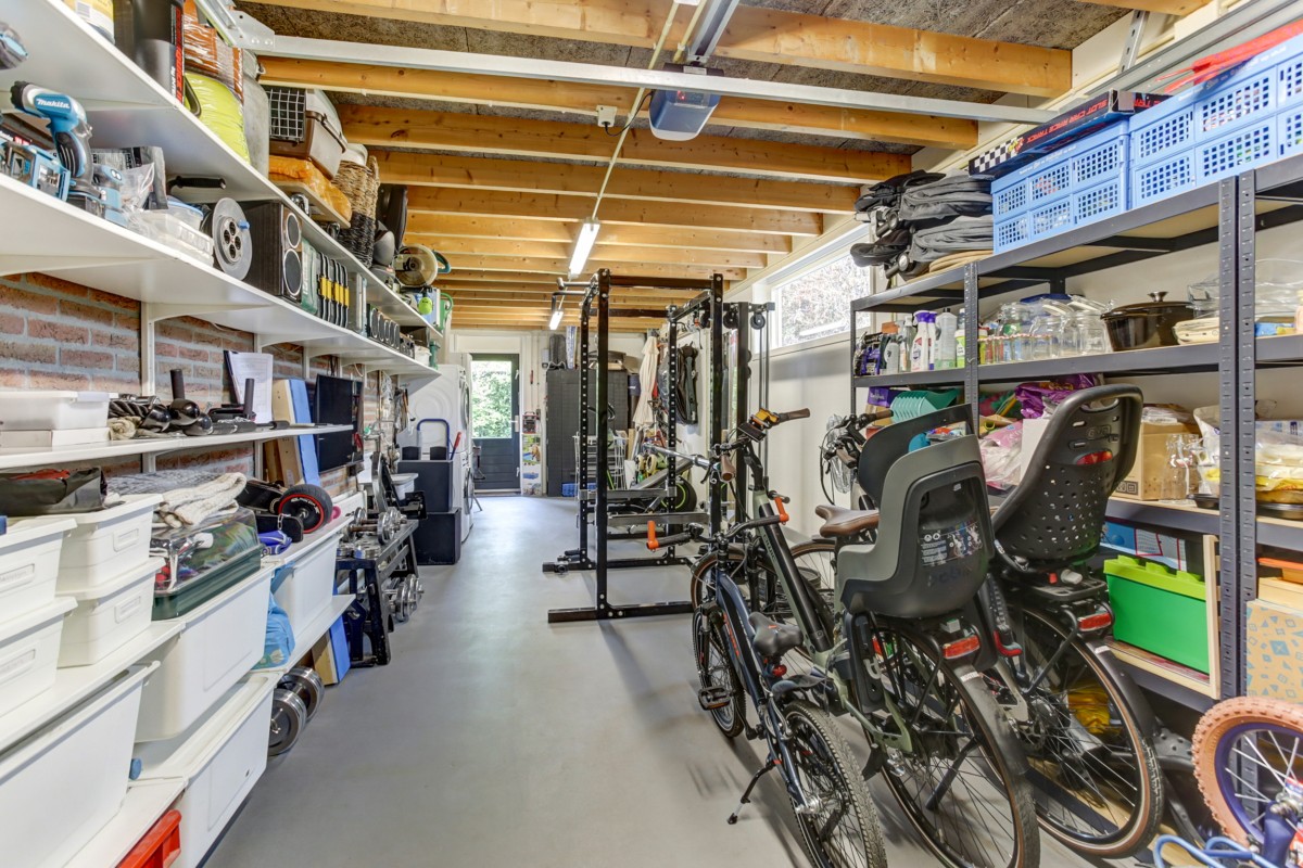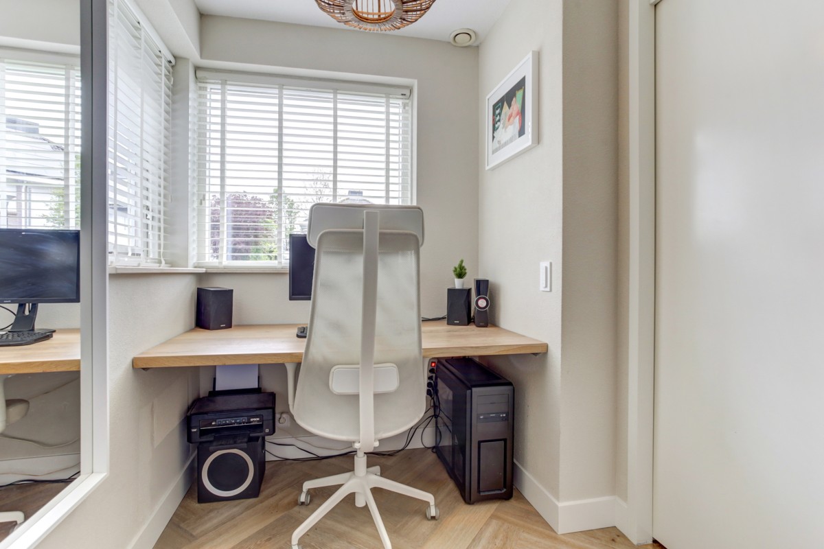 Een loopdeur vanuit de ontvangsthal geeft toegang tot de werkkamer op de begane grond. De werkkamer heeft een brede kastenwand met schuifdeuren en uitzicht op de voortuin. De aangebouwde verlengde stenen garage is geïsoleerd en bereikbaar vanuit de werkkamer. De verwarmde garage is in gebruik als sportruimte met was-voorziening. Voor de liefhebber kan de garage mede door de elektrische sectionaaldeur gebruikt worden voor het stallen van 2 auto's.