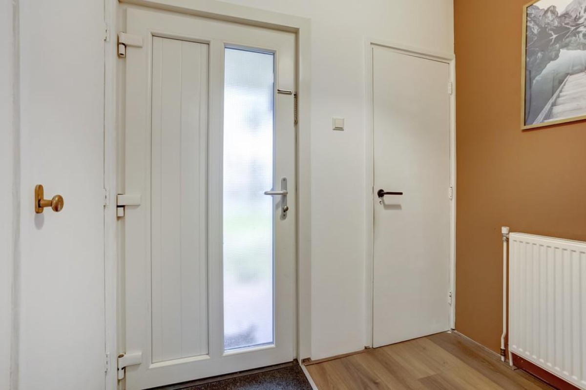 Begane grond: overdekt portaal/entree naar royale hal met garderobe, meterkast (deels vernieuwd) en toiletruimte met closet en fonteintje, 2e hal met trapopgang en riante kelderkast, doorgang naar de woonkamer welke beschikt over vrij uitzicht over openbaar groen en de straat.
