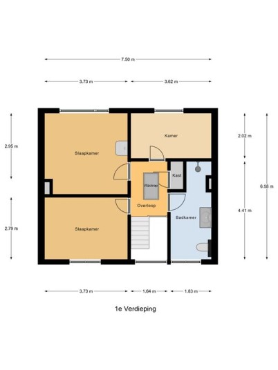 Eerste verdieping: overloop met aangrenzend 3 slaapkamers, een praktische kast en de badkamer. De badkamer biedt een inloopdouche en wastafel met meubel, een radiator, een hangcloset en is voorzien van vloerverwarming. De overloop en slaapkamers zijn voorzien van een tapijtvloer.
