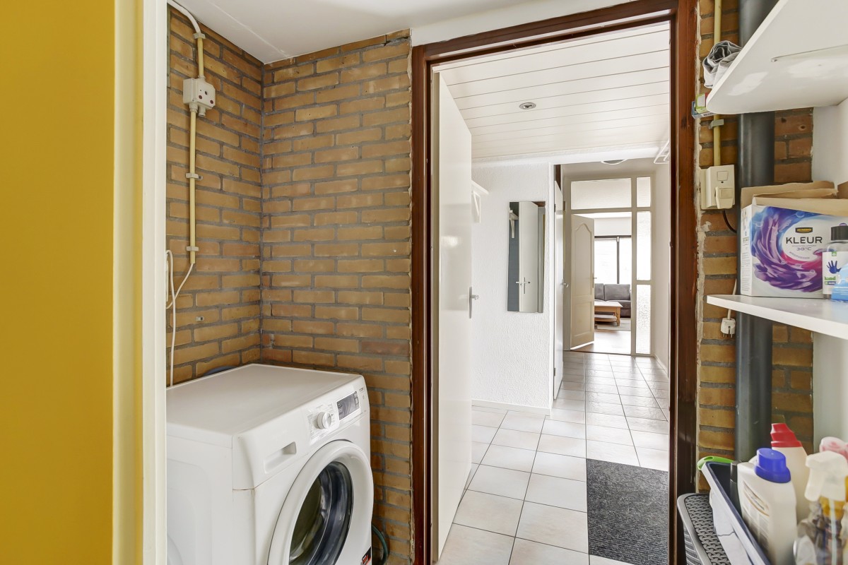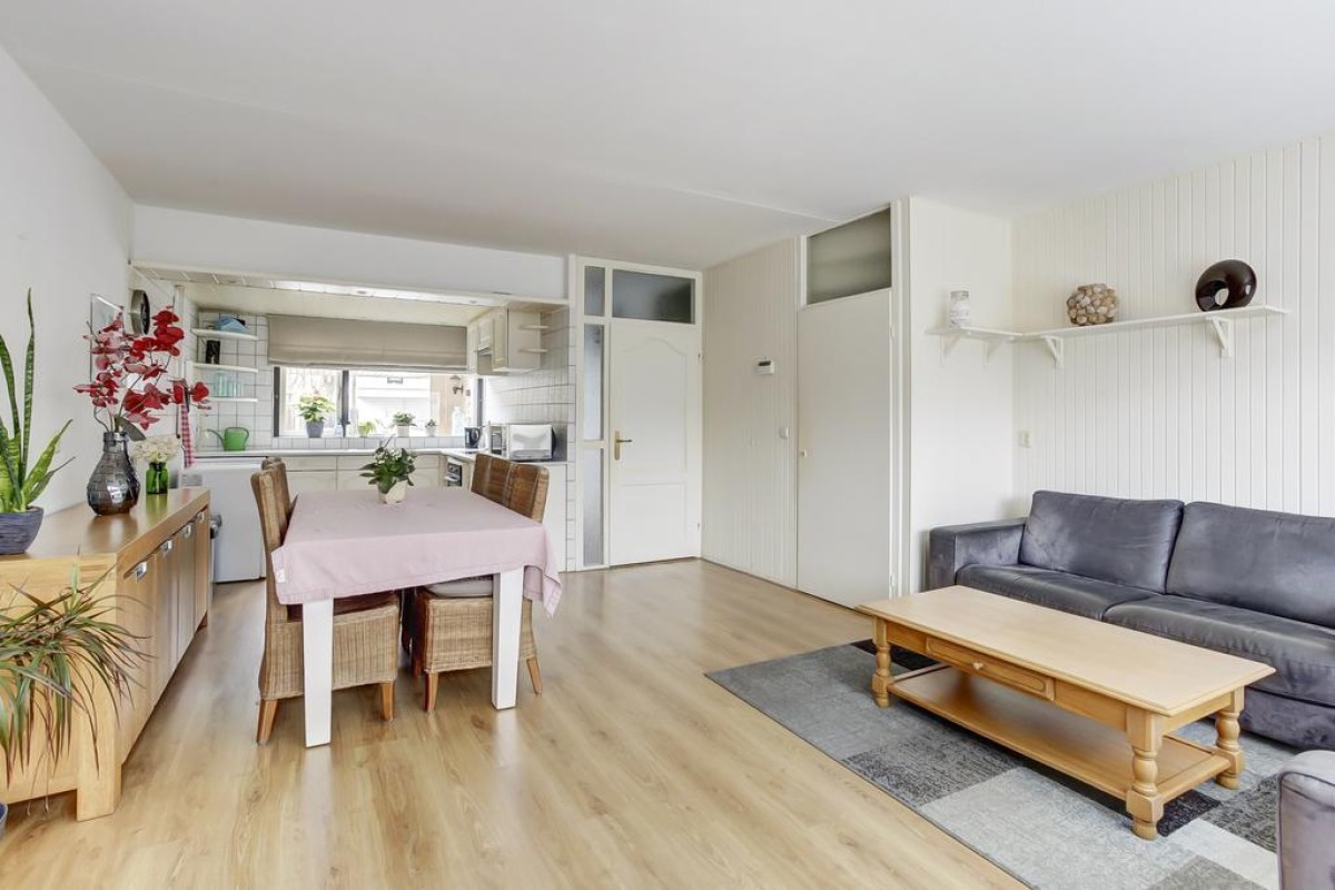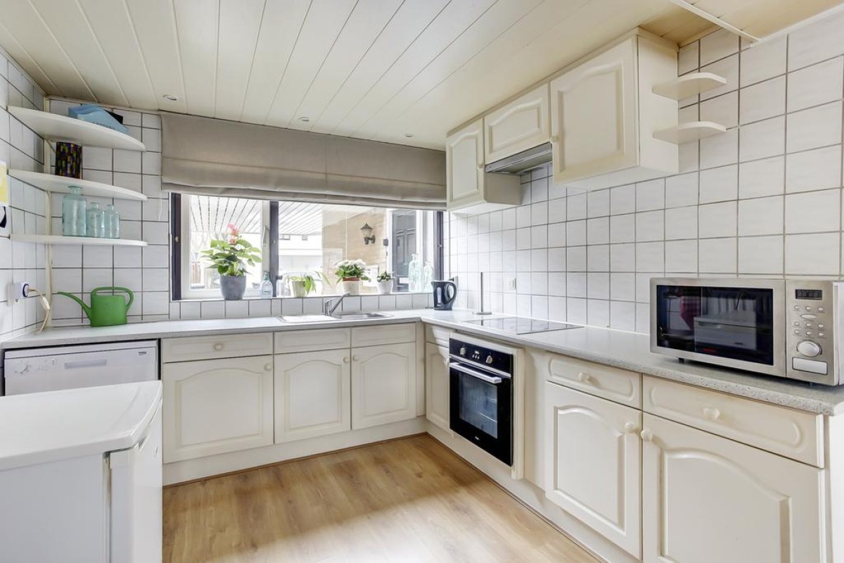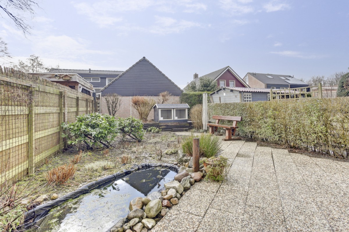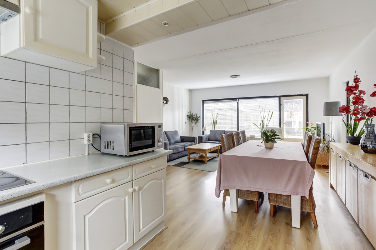 Lees verderDe tuingerichte woonkamer beschikt over een trapkast en tuindeur naar het zonneterras. De lichte hoek opgestelde keuken is aan de voorzijde van de woning gesitueerd en voorzien van ingebouwde gaskookplaat, afzuigkap en oven. De tuin is op het westen gesitueerd, verzorgd aangelegd en voorzien van een achterom en houten berging.