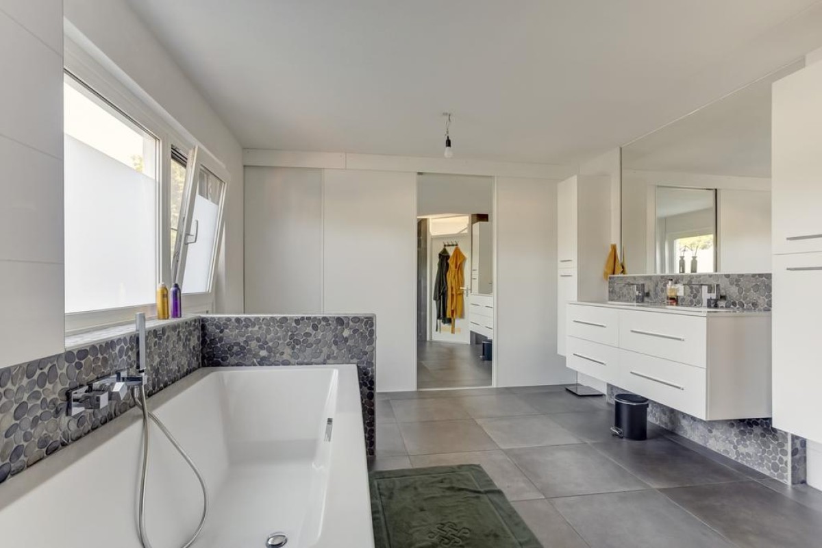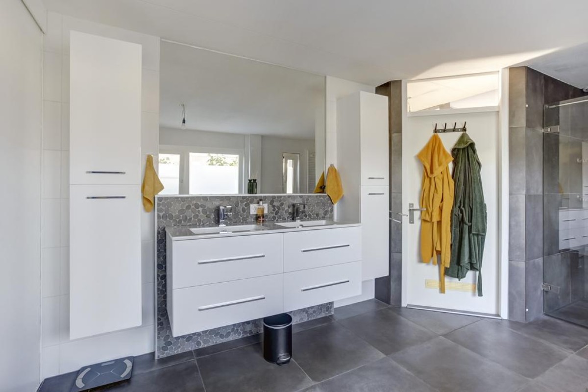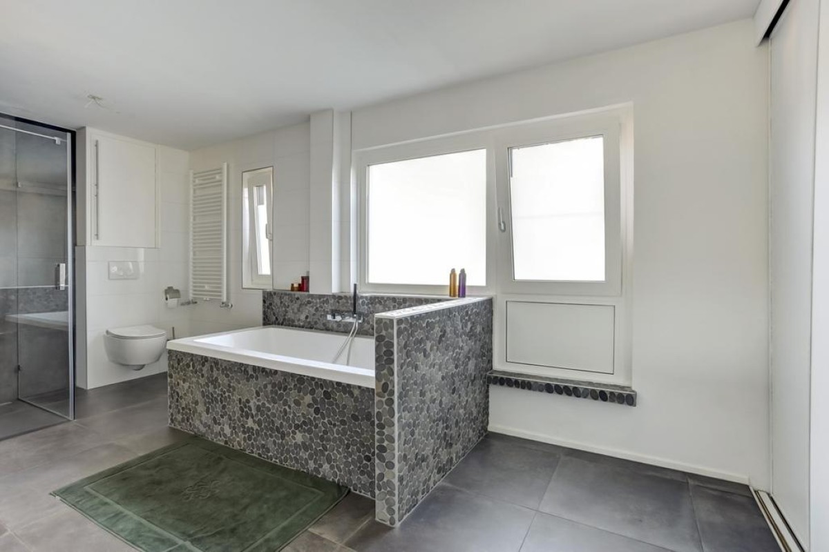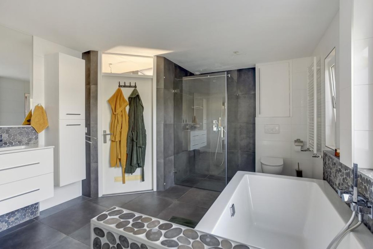 Eerste verdieping: overloop met aangrenzend 2 ruime slaapkamers voorzien van laminaat vloeren en een zeer ruime luxe badkamer (2017) voorzien van een ruime inloopdouche, ligbad, vloerverwarming, een praktische vaste kastenwand, 2e hangcloset, designradiator en dubbele wastafel met meubel.
