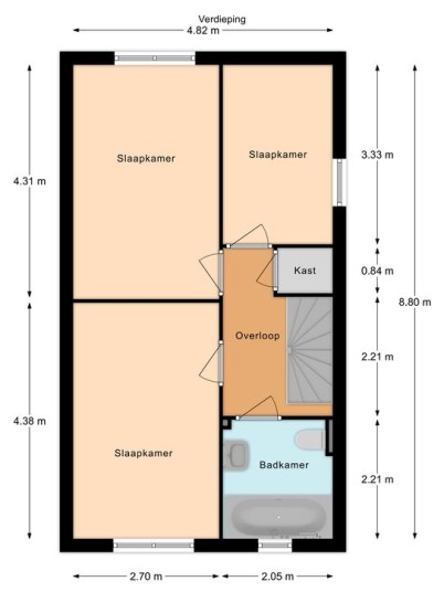 Overloop, 3 ruime slaapkamers en een badkamer voorzien van een whirlpool, wastafelmeubel en toilet.