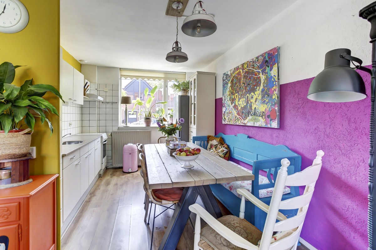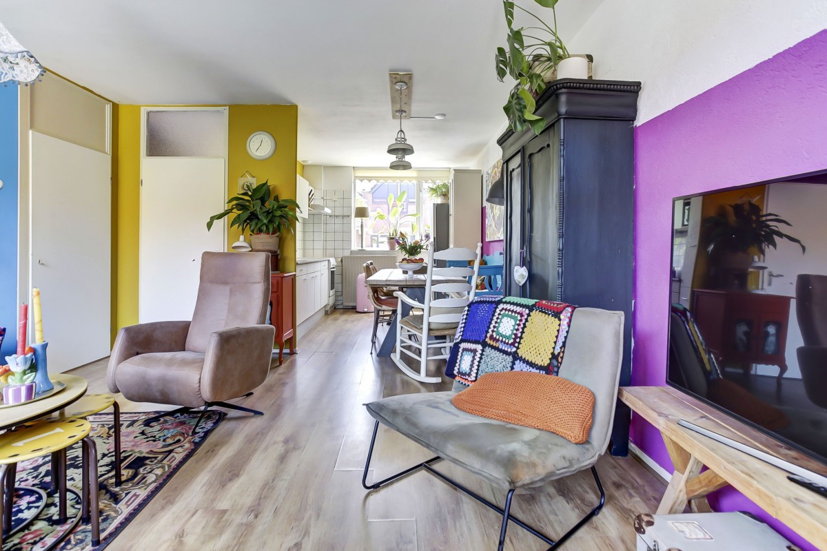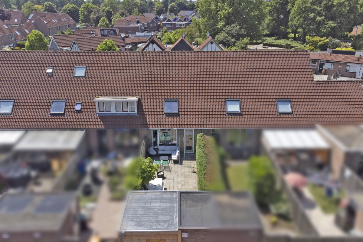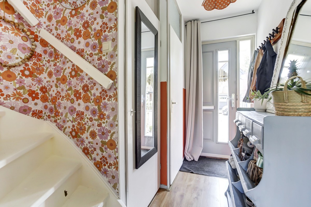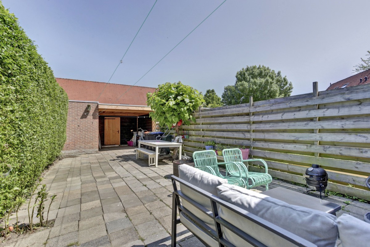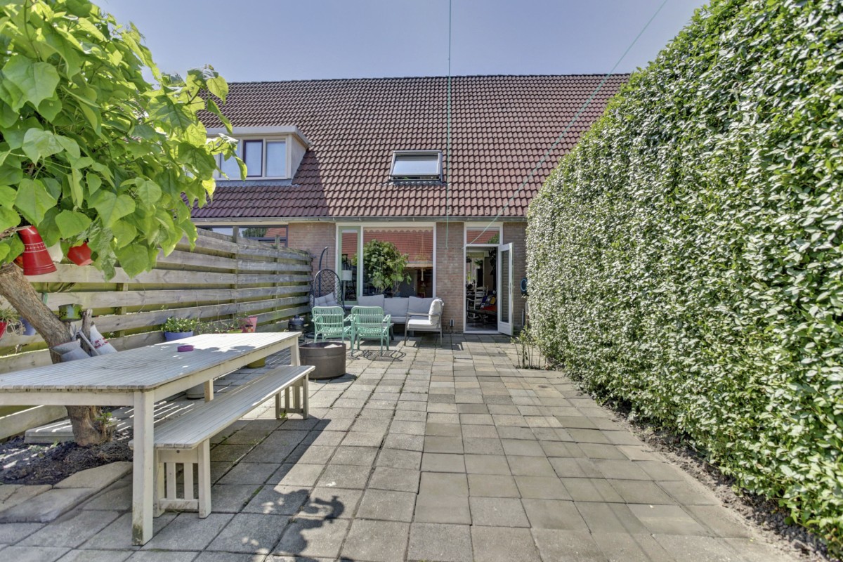 Begane grond: overdekt entree, vernieuwde toiletruimte met hangcloset en fonteintje, meterkast, garderobe en trapopgang. De open keuken is aan de voorzijde van de woning gelegen en is voorzien van veel kastruimte en een vrijstaande koel-/vriescombinatie, een gasfornuis met 4-pits gaskookplaat een afzuigkap. De tuingerichte woonkamer is voorzien van een praktische provisieruimte onder de trap en een nieuwe loopdeur biedt toegang tot de zonnige tuin welke voorzien is van een terras, borders met vaste beplanting, een vrijstaande stenen schuur en een prachtige grote overkapping met achterom.
