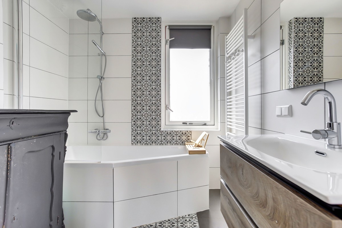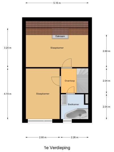 Eerste verdieping: overloop voorzien van een laminaatvloer met aansluitend 2 ruime slaapkamers en de badkamer. De ruime slaapkamer aan de achterzijde van de woning biedt een nieuw dakraam veel licht. Deze kamer is wellicht op te delen in 2 kamers. Aan de voorzijde van de woning is de tweede slaapkamer gesitueerd en beide slaapkamers zijn voorzien van een laminaatvloer. De vernieuwde badkamer is volledig voorzien van een lichte betegeling en heeft een ligbad met douche, een wastafel met meubel en een designradiator.