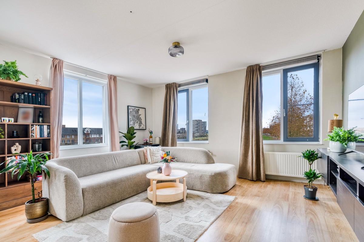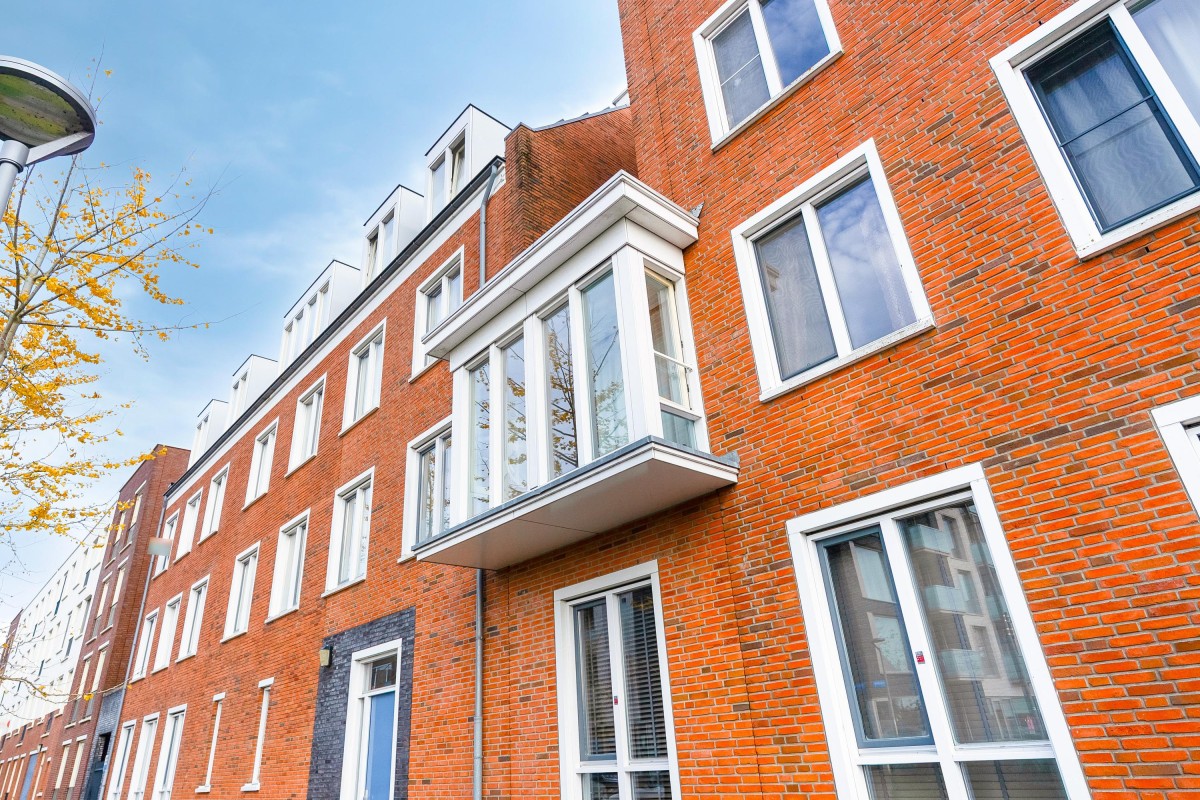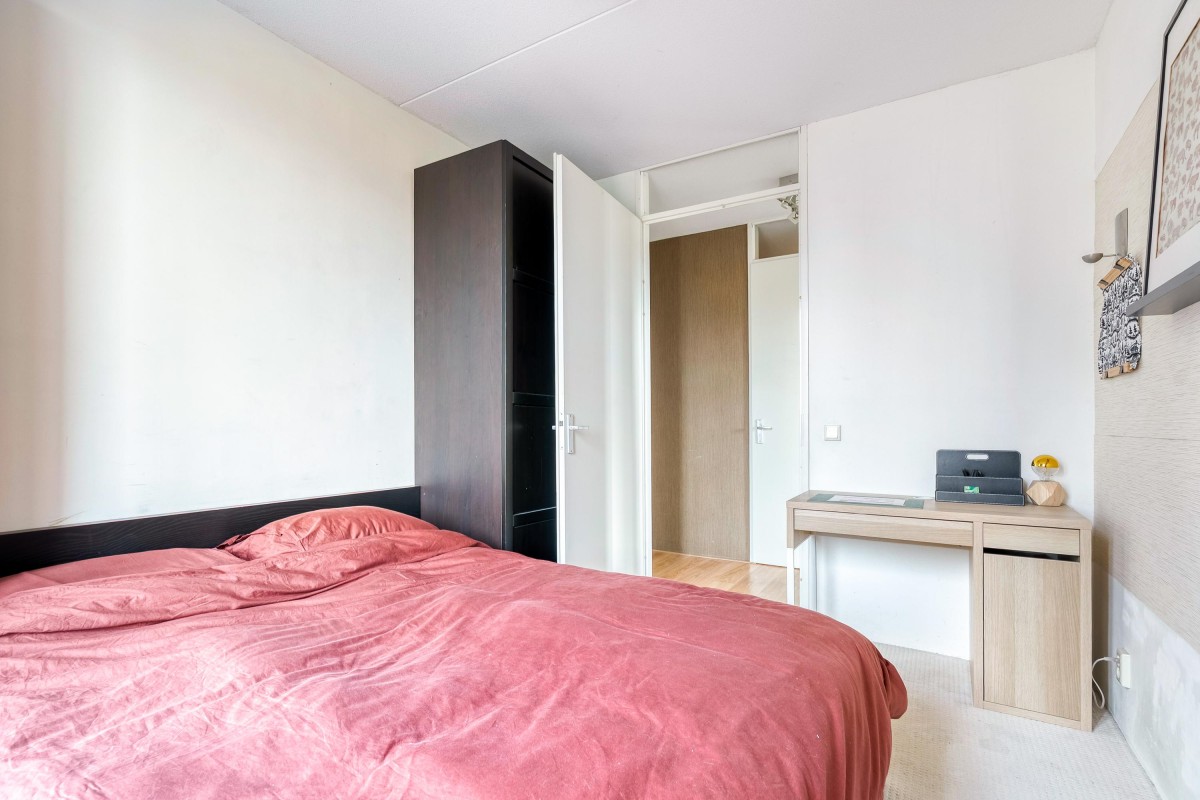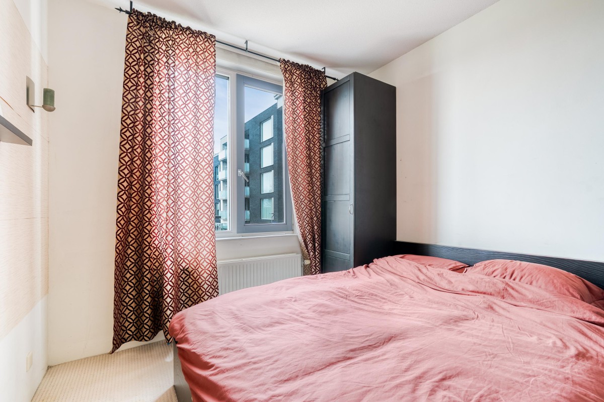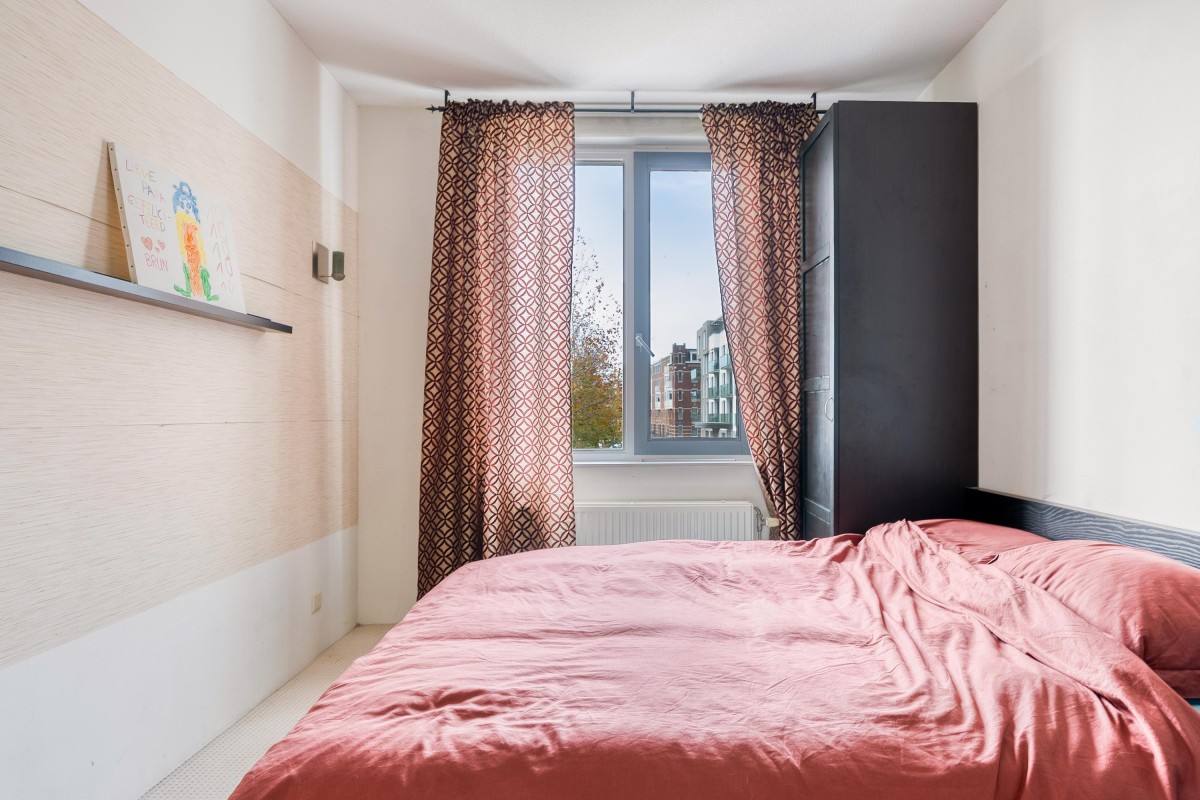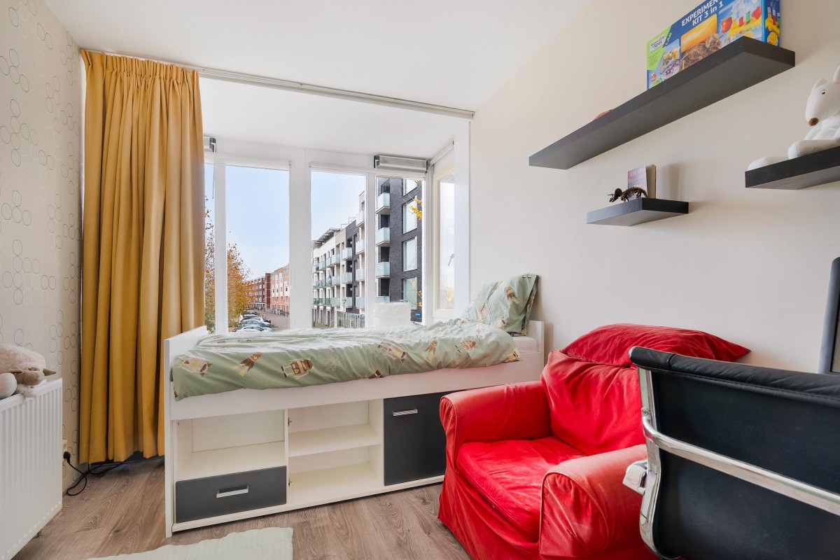 De eerste slaapkamer beschikt over een leuke erker met uitzicht op de Frankrijkkade, wat zorgt voor veel natuurlijk