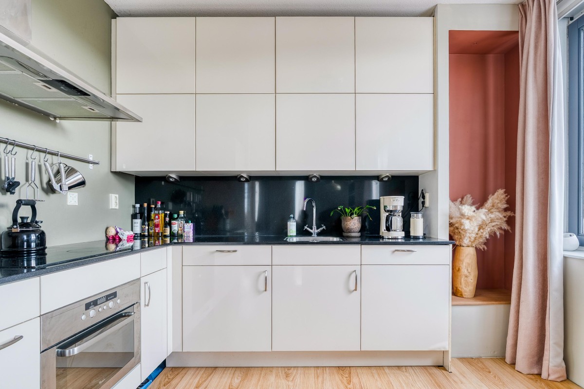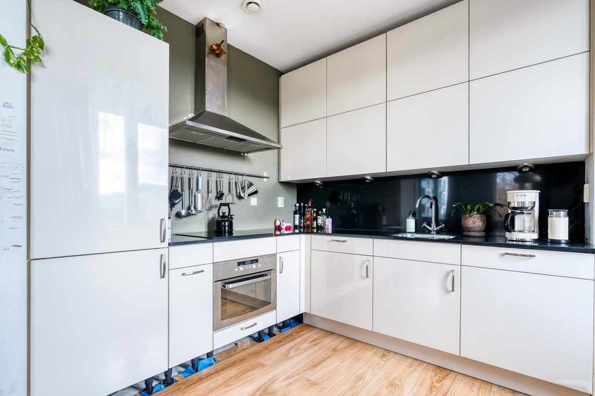 De keuken is uitgevoerd in een L-opstelling en voorzien van veel opbergruimte en diverse inbouwapparatuur, zoals een vaatwasser, combi-oven/magnetron, koelkast, vriezer, 4-pits kookplaat en een afzuigkap.