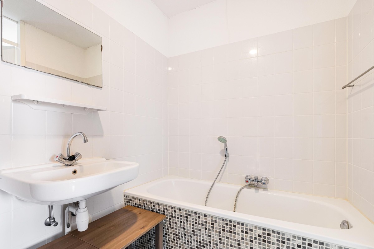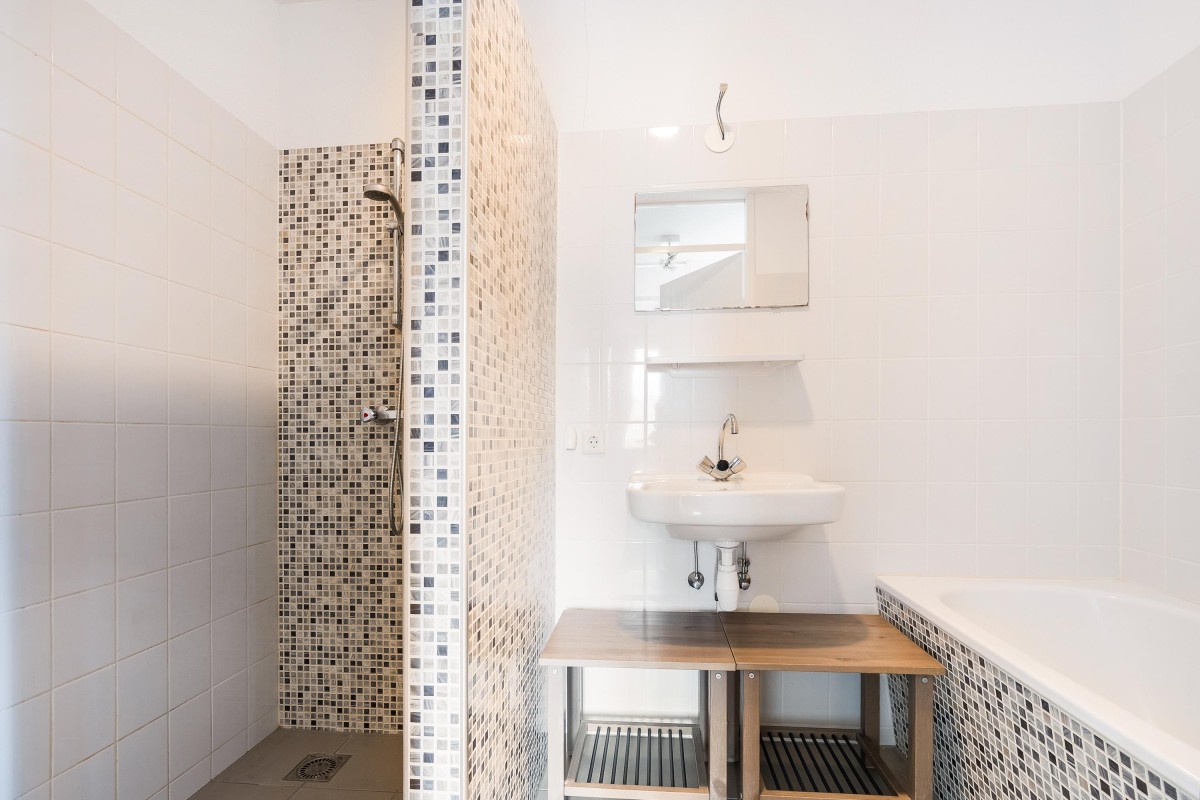 De vloer in het appartement is afgewerkt met een nette laminaat en de wanden en het plafond zijn netjes afgewerkt. De badkamer is voorzien van een ruime inloopdouche, een ligbad en een wastafel.