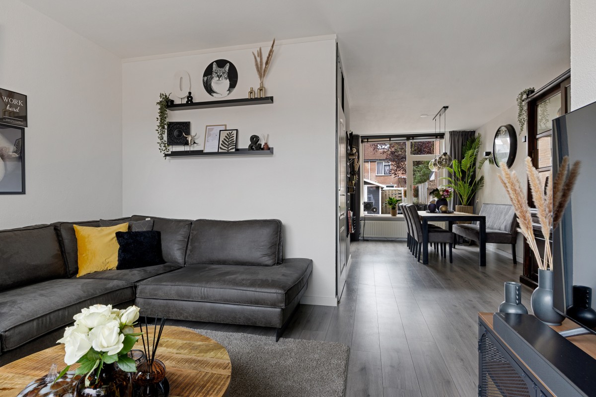 Gezellige woonkamer met veel daglicht. Er is voldoende ruimte voor een heerlijke zithoek en een ruime eethoek.
