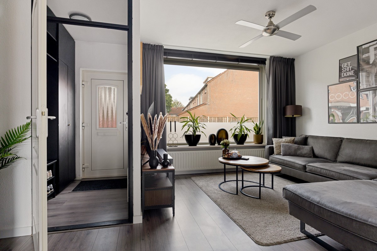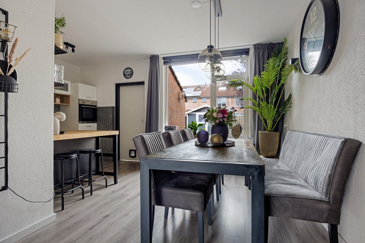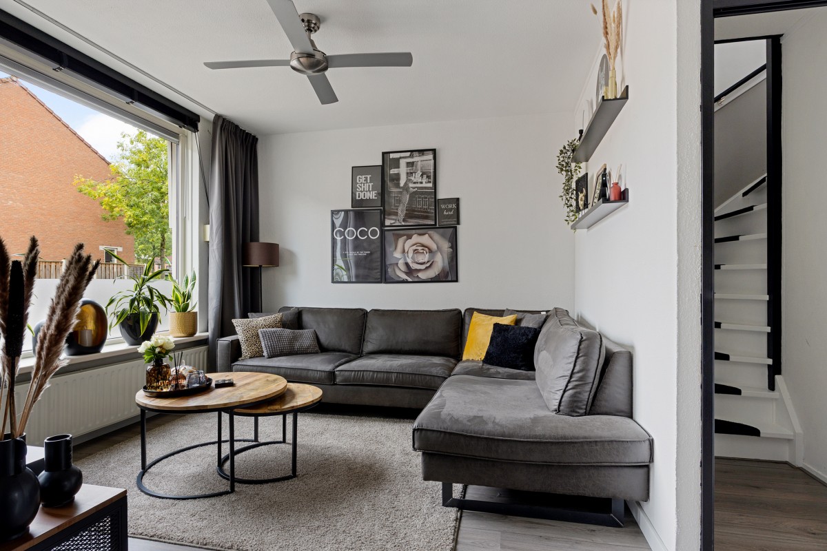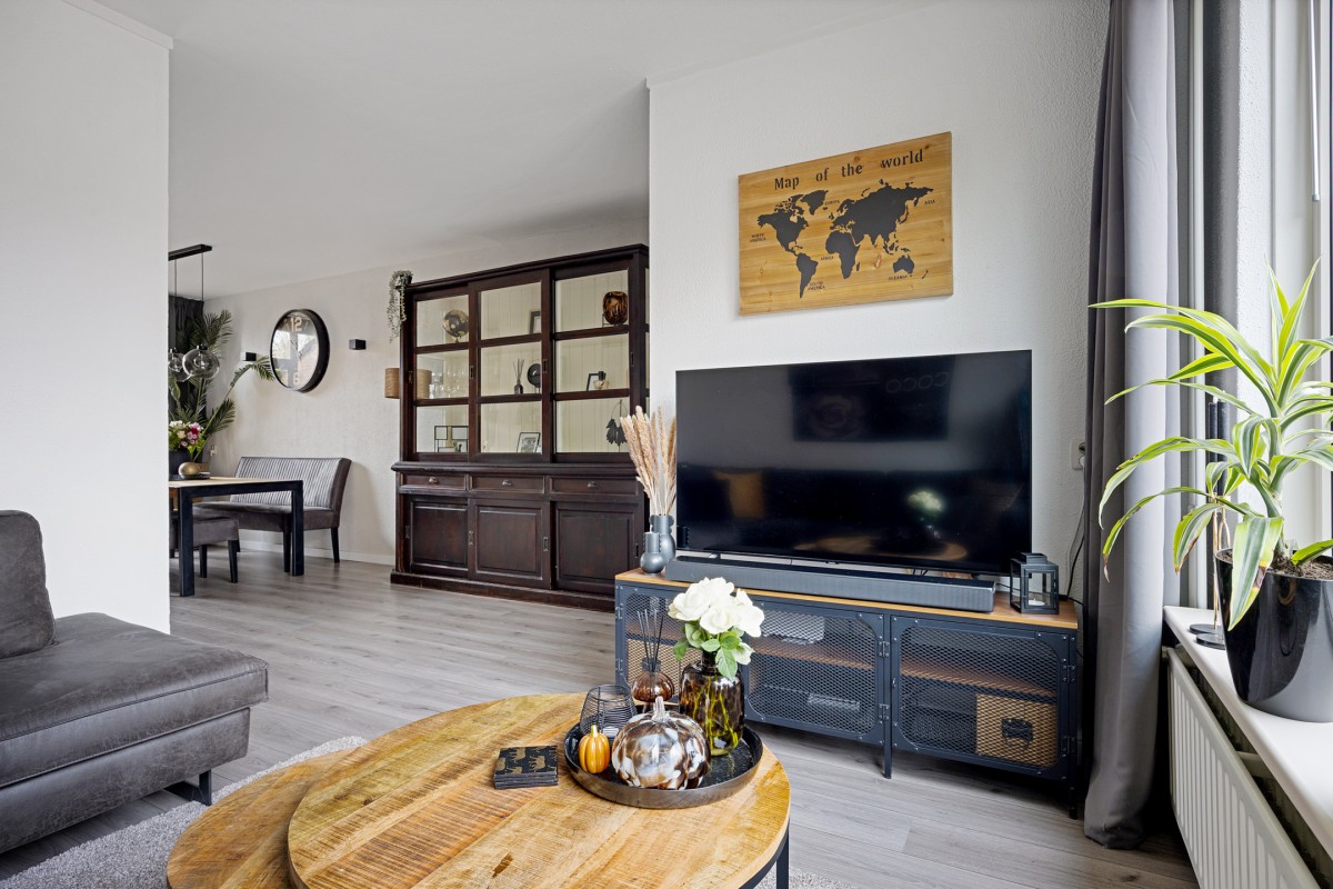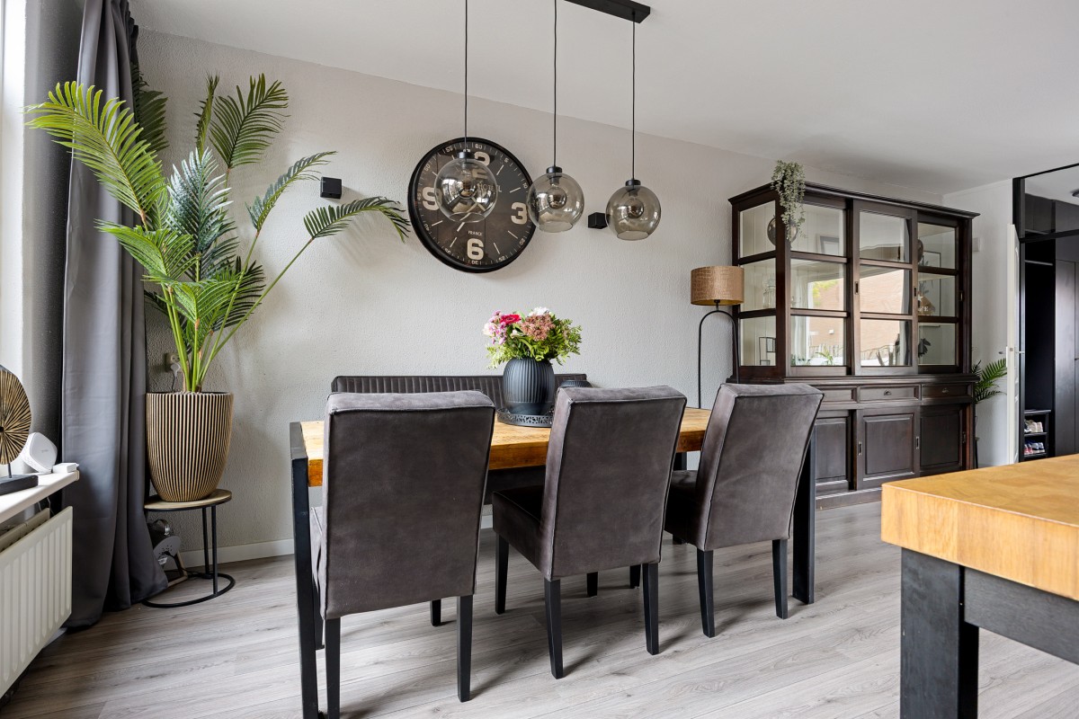 Gezellige woonkamer met veel daglicht. Er is voldoende ruimte voor een heerlijke zithoek en een ruime eethoek.
