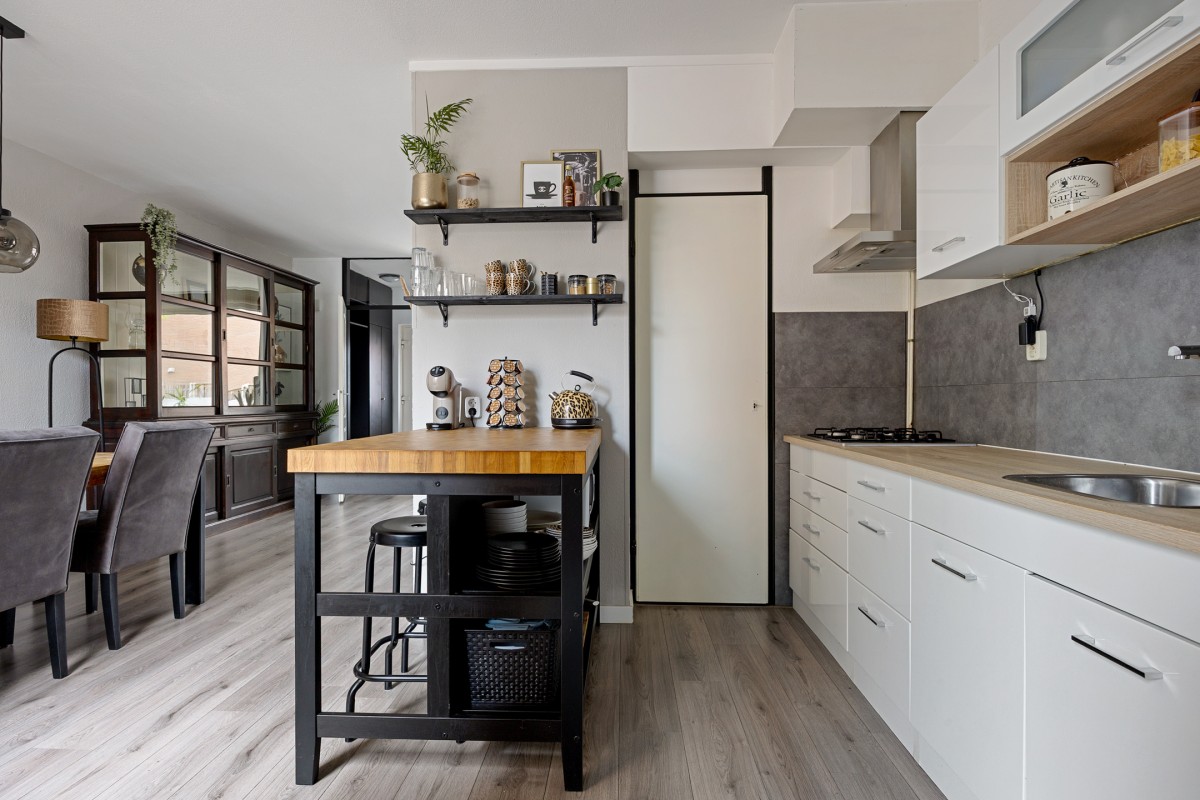De keuken is aan de achterzijde van de woning gelegen en is voorzien van een koelkast, combi-oven, 4-pits gaskookplaat en een afzuigkap. Hier vind je ook een ruime trapkast, ideaal als provisiekast.