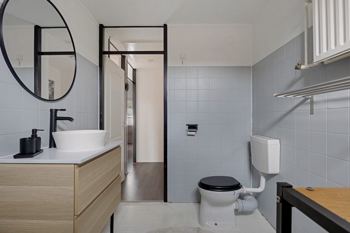 De badkamer is voorzien van een douche, toilet, wasmachineaansluiting en een wastafelmeubel.