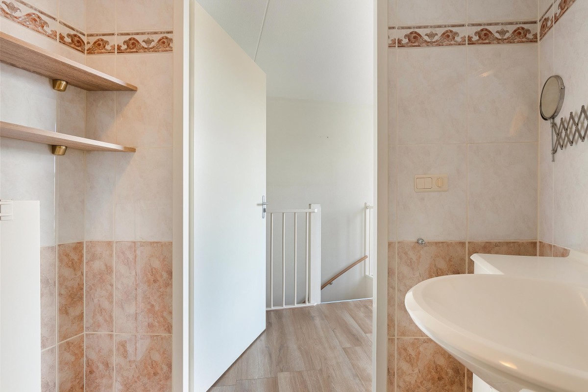 Overloop met deur naar het dakterras, 3 slaapkamers en de ruime badkamer. De badkamer is voorzien van een douche, wastafelmeubel en een toilet.