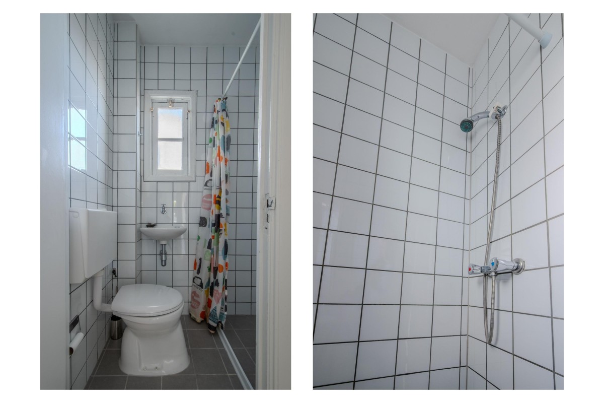 Third floor: The hallway provides access to the spacious open-plan living room with large windows on both the front and back, allowing for plenty of natural light. The continuous, stylish flooring gives the entire space a warm and uniform look. The efficiently designed kitchen offers ample work space. Both the kitchen and the living room have access to the spacious, west-facing balcony, perfect for afternoon and evening sun. The bathroom is equipped with a shower, sink, and toilet. The large bedroom is accessible from the living room.