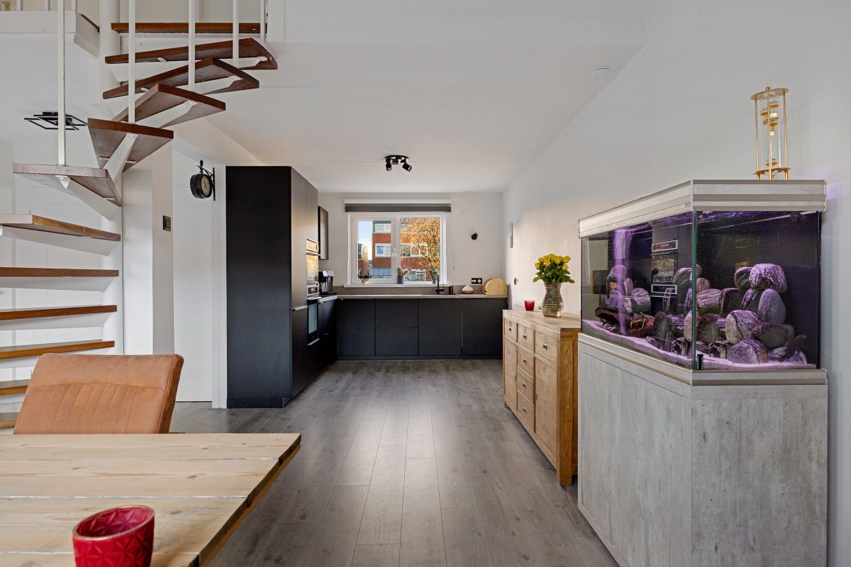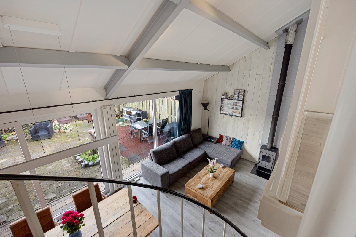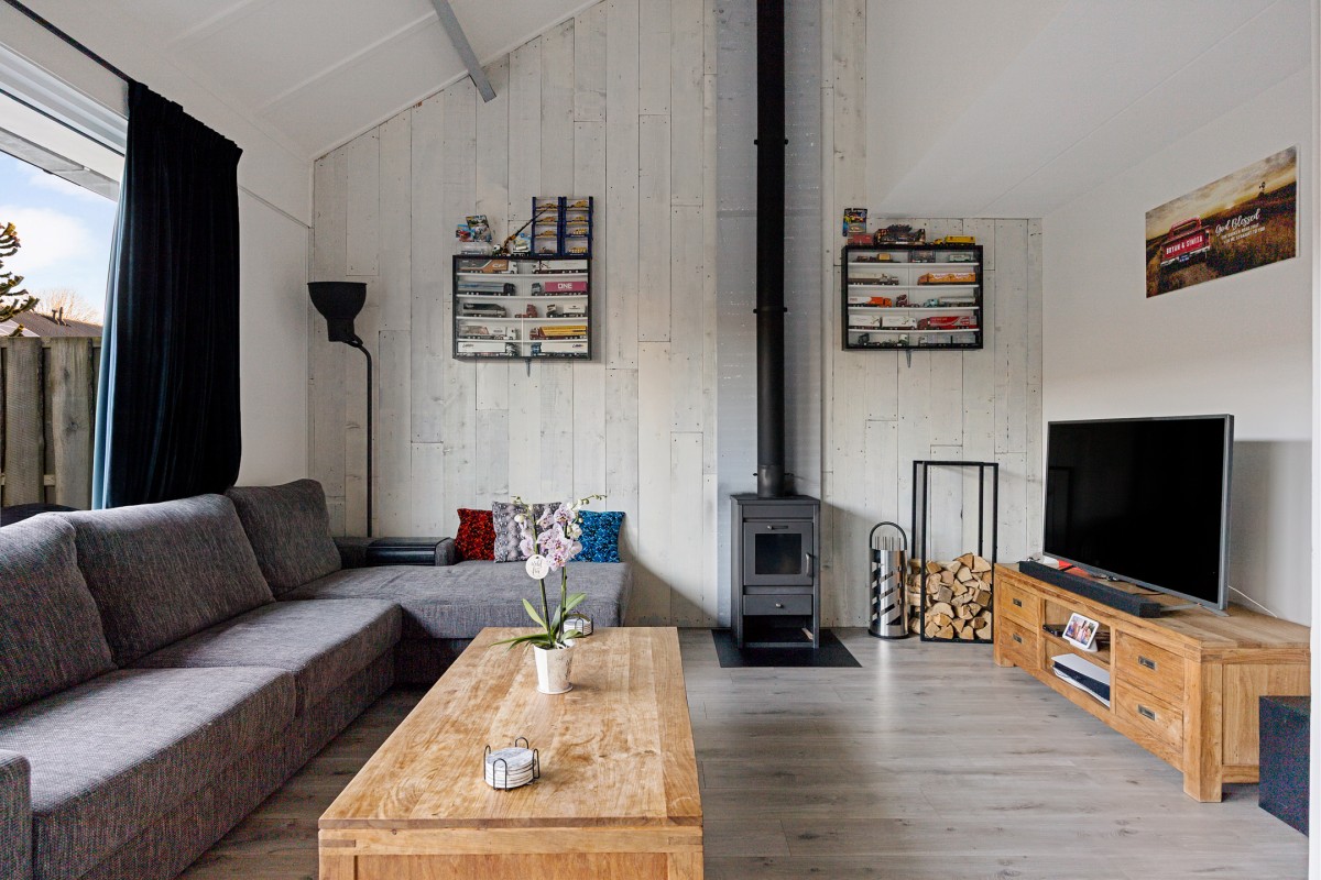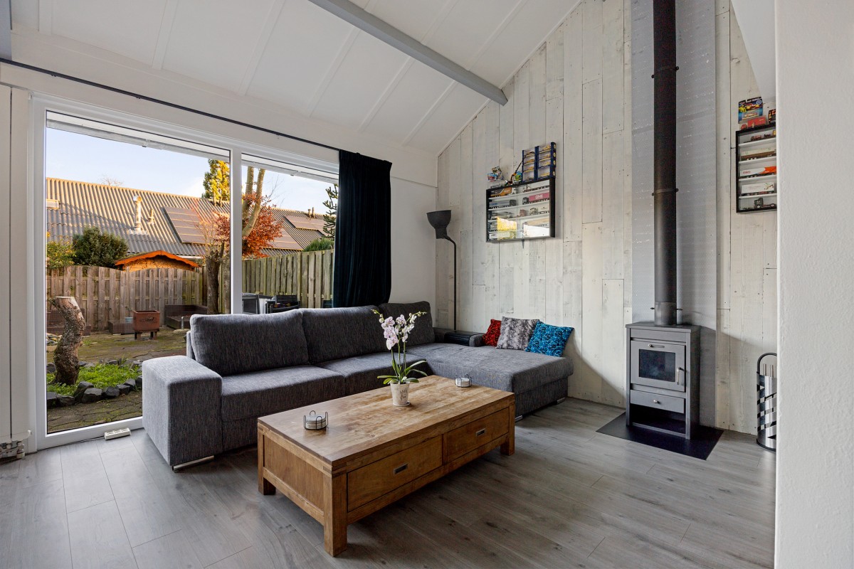 De ruime en lichte woonkamer van ca. 39 m² heeft een hoog plafond, wat bijdraagt aan het gevoel van ruimte. Dankzij de grote vaste pui en schuifpui komt er veel natuurlijk licht binnen. De sfeervolle houtkachel biedt niet alleen extra warmte, maar ook gezelligheid, zodat de woonkamer het hele jaar door een fijne plek is om te verblijven. Daarnaast is er een praktische bergkast, ideaal voor het opbergen van huishoudelijke spullen en het creëren van een opgeruimde leefruimte.