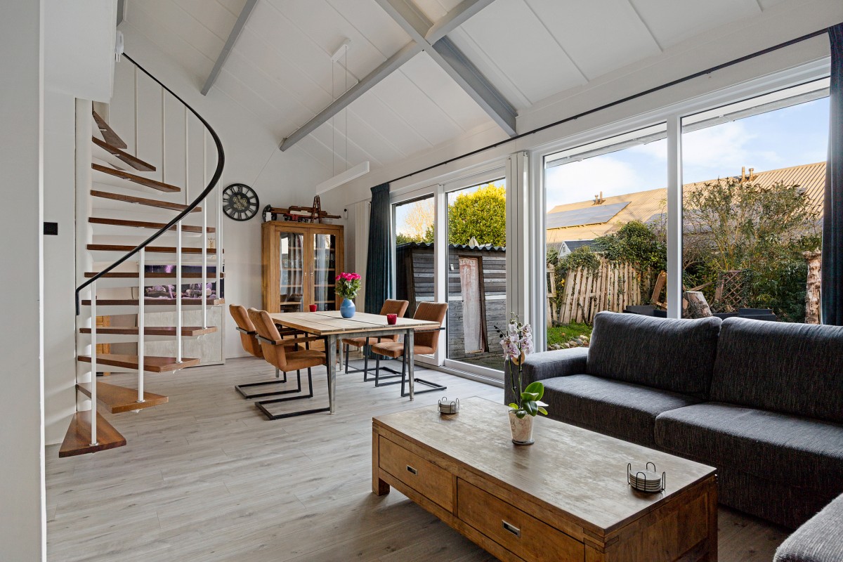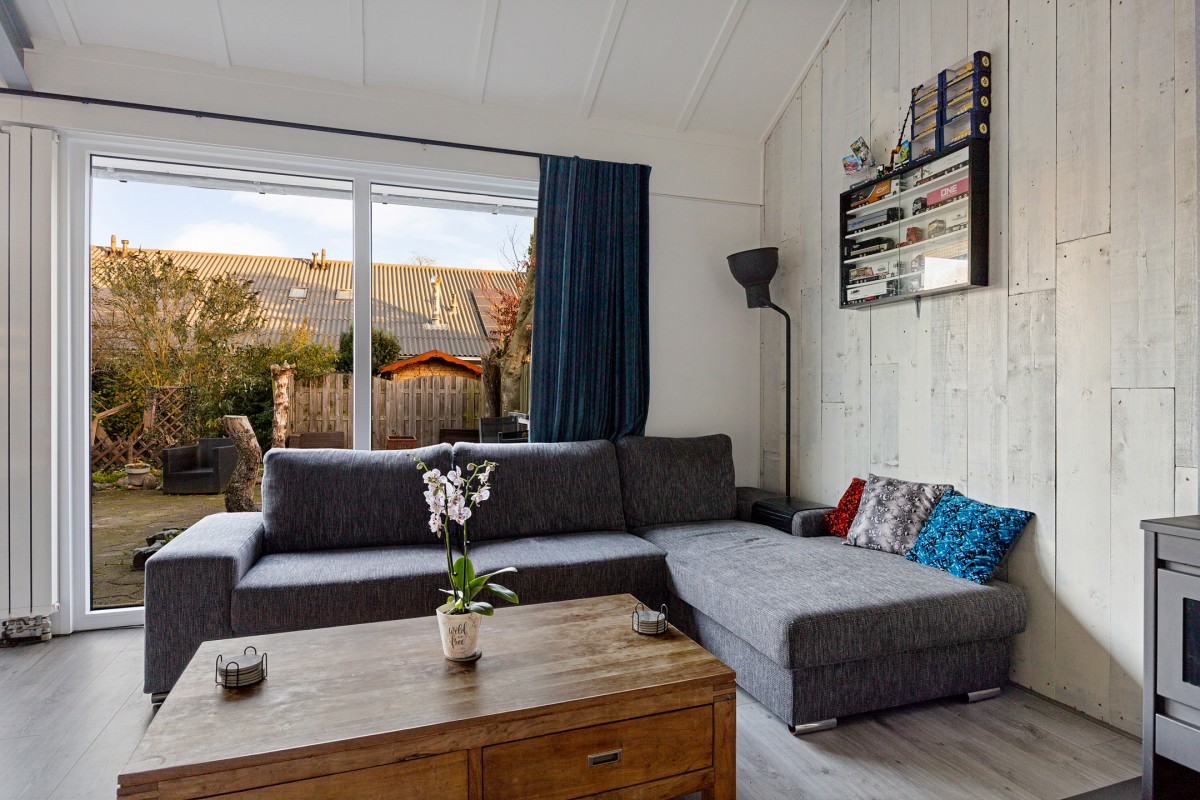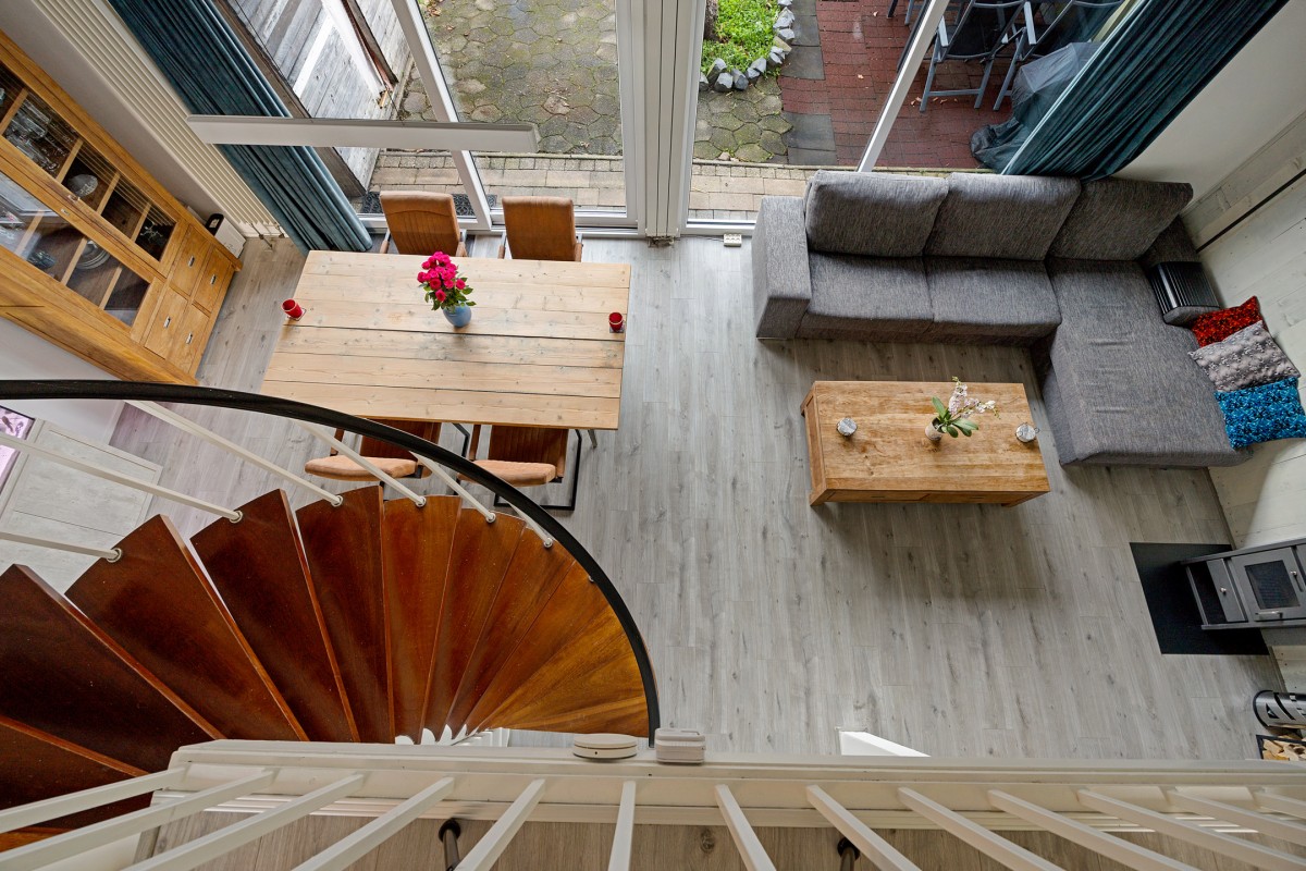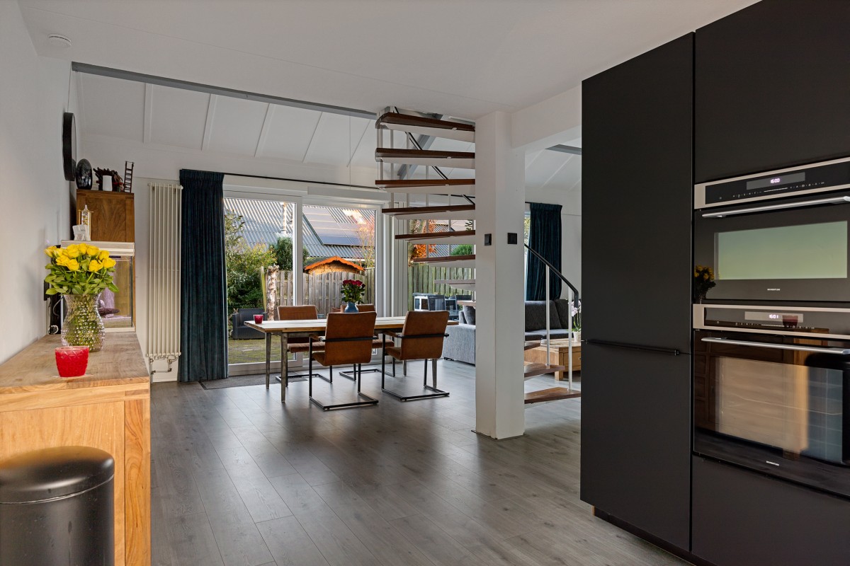 De ruime en lichte woonkamer van ca. 39 m² heeft een hoog plafond, wat bijdraagt aan het gevoel van ruimte. Dankzij de grote vaste pui en schuifpui komt er veel natuurlijk licht binnen. De sfeervolle houtkachel biedt niet alleen extra warmte, maar ook gezelligheid, zodat de woonkamer het hele jaar door een fijne plek is om te verblijven. Daarnaast is er een praktische bergkast, ideaal voor het opbergen van huishoudelijke spullen en het creëren van een opgeruimde leefruimte.