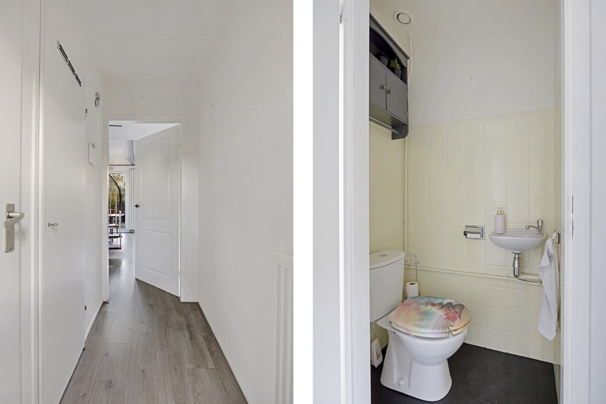 De entree geeft toegang tot de hal met de meterkast (nieuw systeem) en glasvezelaansluiting, het toilet met fonteintje en een deur naar de woonkamer.