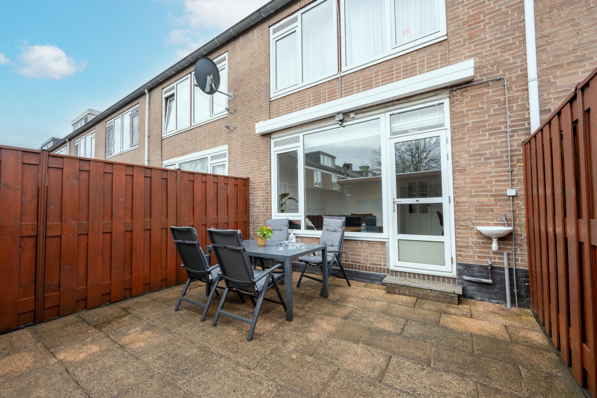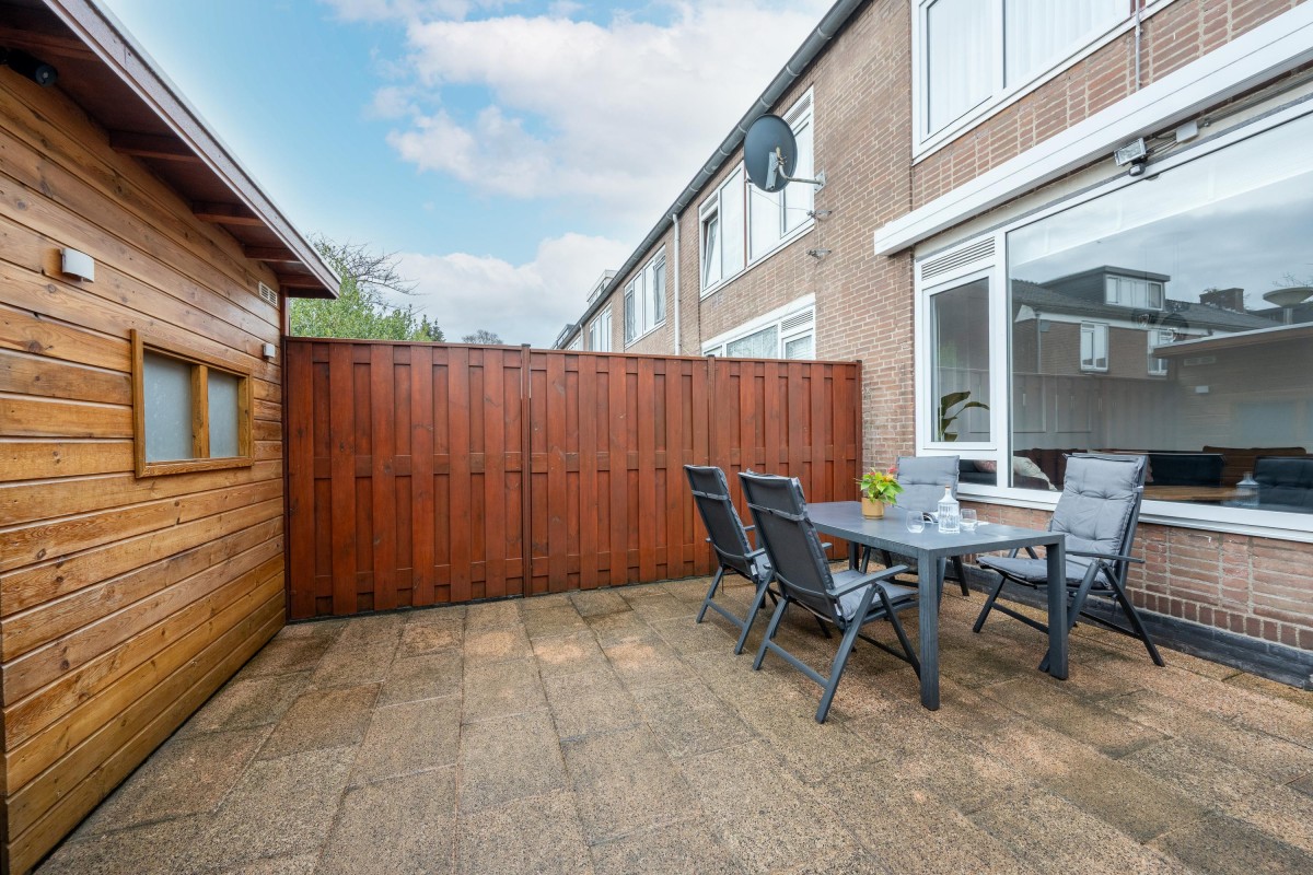De achtertuin is onderhoudsvriendelijk betegeld en biedt ruimte voor een lounge-set. Er is een houten schuur, een overkapping, elektrische zonwering voor extra comfort en een achterom. Ook de voortuin is mooi betegeld. Achter de tuin ligt een groen hofje met een grote speeltuin met schommels, klimtoestellen en een glijbaan. Ideaal voor de kinderen om te spelen.
