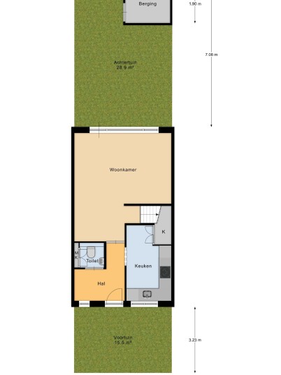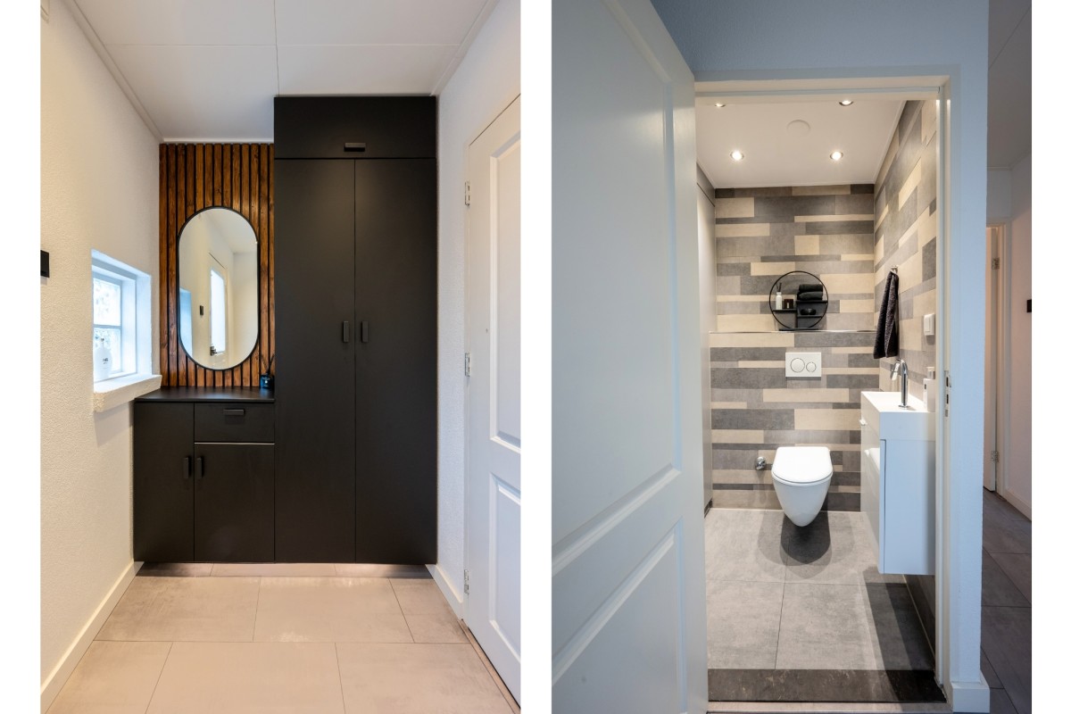 Entree, ruime hal met garderobe. Toilet en meterkast. De moderne keuken aan de voorzijde van de woning is voorzien van inbouwapparatuur, zoals vaatwasser, afzuigkap, oven, inbouwkoelkast en inductiekookplaat. De lichte woonkamer kijkt uit op de fraai aangelegde, zonnige achtertuin op het oosten, wat ideaal is om samen te genieten van lange zomerdagen. Onder de trap, naast de keuken, is een ruime berging. De woning is voorzien van kunststof kozijnen. De gehele benedenverdieping is voorzien van vloerverwarming.