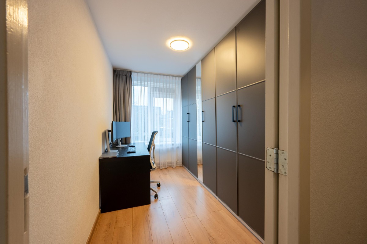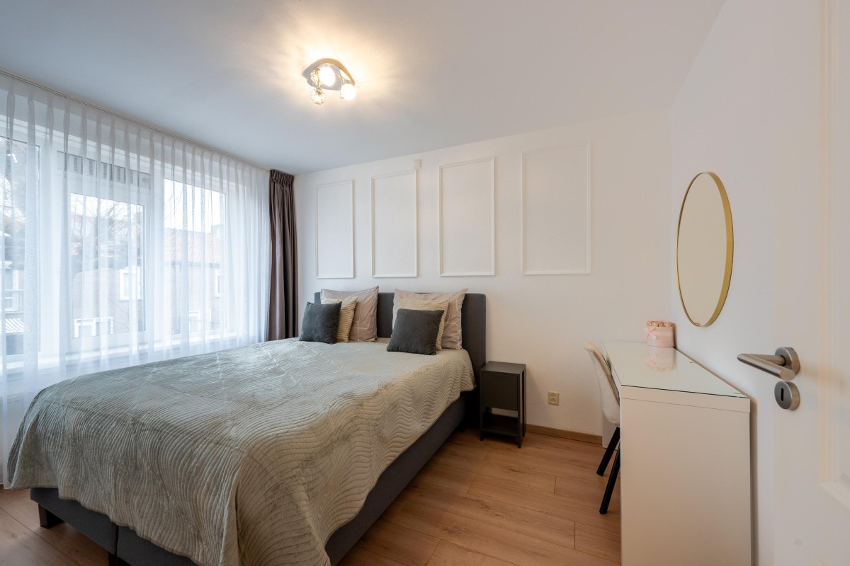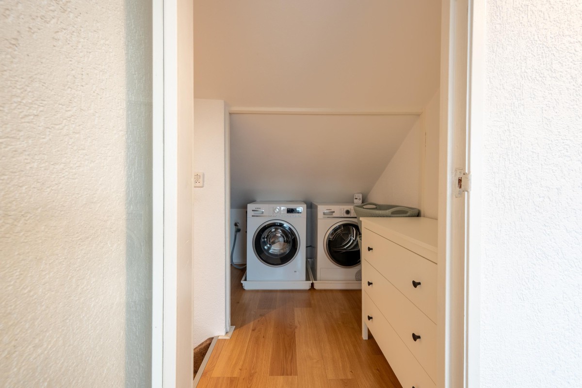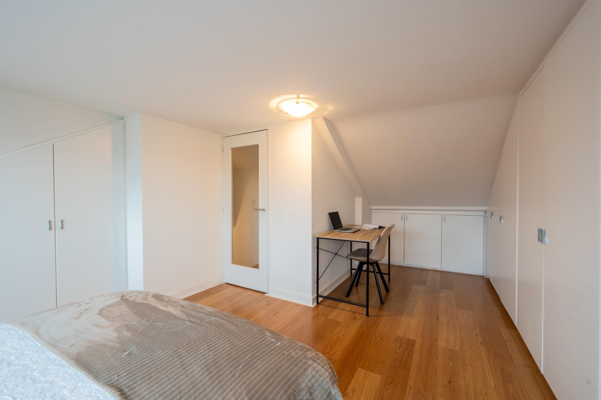 A fixed staircase leads to the upper floor. Here, you'll find the spacious master bedroom with a dormer at the rear. The large windows provide plenty of natural light. You will also find the laundry room with connections for a washing machine and dryer. The new Intergas CW5 boiler (2026) is hybrid-ready and can be connected to a heat pump. This floor features built-in wardrobes and practical storage space behind the knee walls. There is a permit to add a dormer at the front. See the additional floor plan as an example.