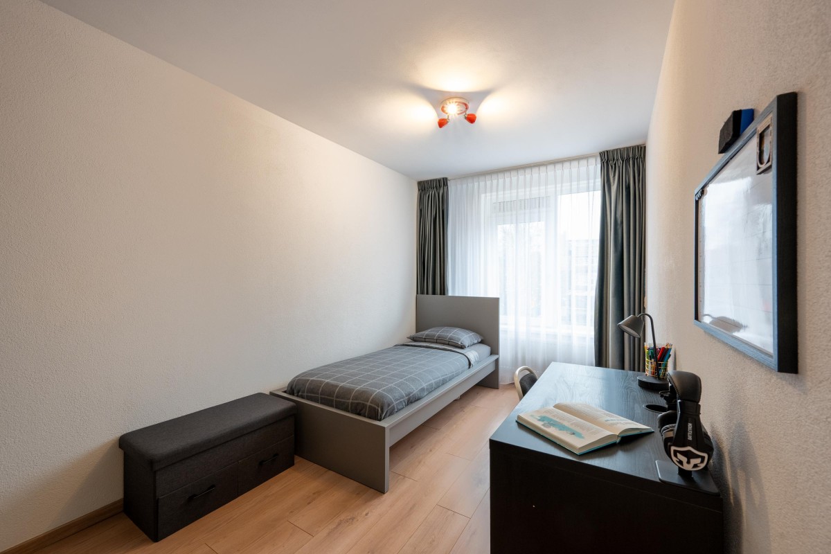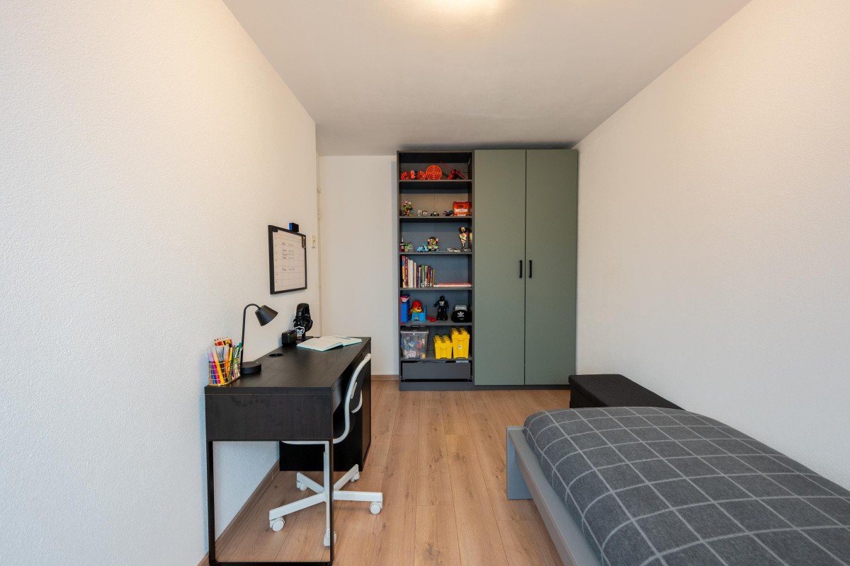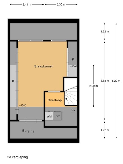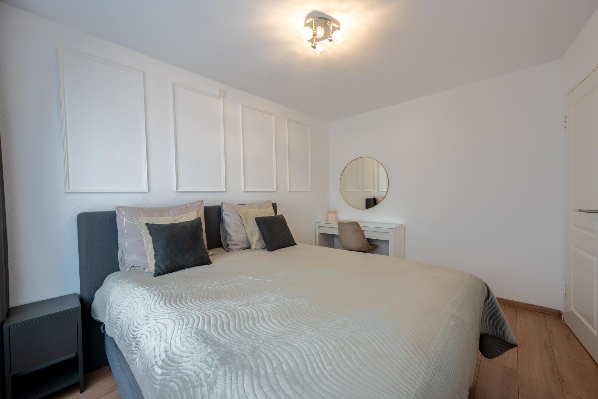 A fixed staircase leads to the upper floor. Here, you'll find the spacious master bedroom with a dormer at the rear. The large windows provide plenty of natural light. You will also find the laundry room with connections for a washing machine and dryer. The new Intergas CW5 boiler (2026) is hybrid-ready and can be connected to a heat pump. This floor features built-in wardrobes and practical storage space behind the knee walls. There is a permit to add a dormer at the front. See the additional floor plan as an example.