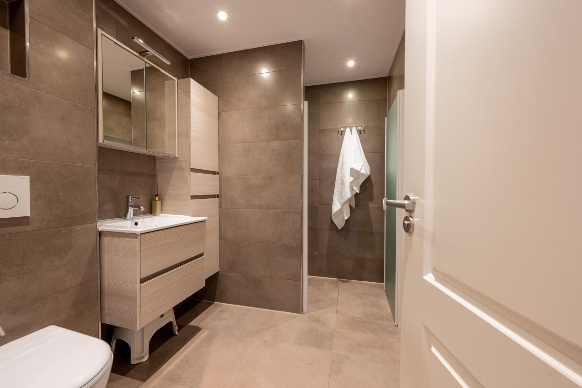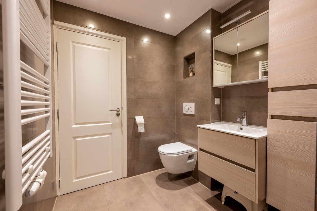 Landing with access to three well-sized bedrooms, ideal for a family, a guest room, or a home office. The stylish bathroom is equipped with a walk-in rain shower, a second wall-hung toilet, a vanity unit, and a towel radiator. Underfloor heating is also present here.
