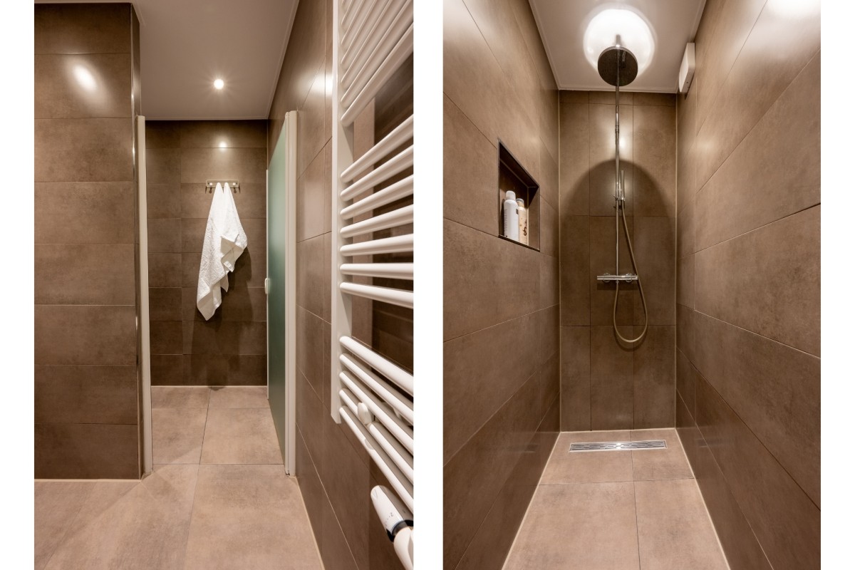 Overloop met toegang tot drie slaapkamers van goed formaat, ideaal voor een gezin, een logeerkamer of een thuiswerkplek. De stijlvolle badkamer is voorzien van een inloop-regendouche, een tweede hangtoilet, een wastafelmeubel en een handdoekradiator. Ook hier is vloerverwarming aanwezig.