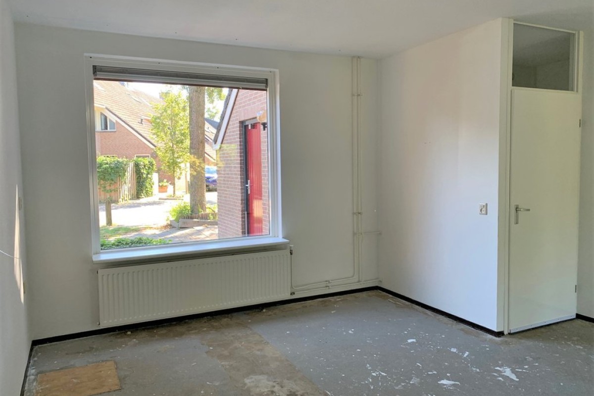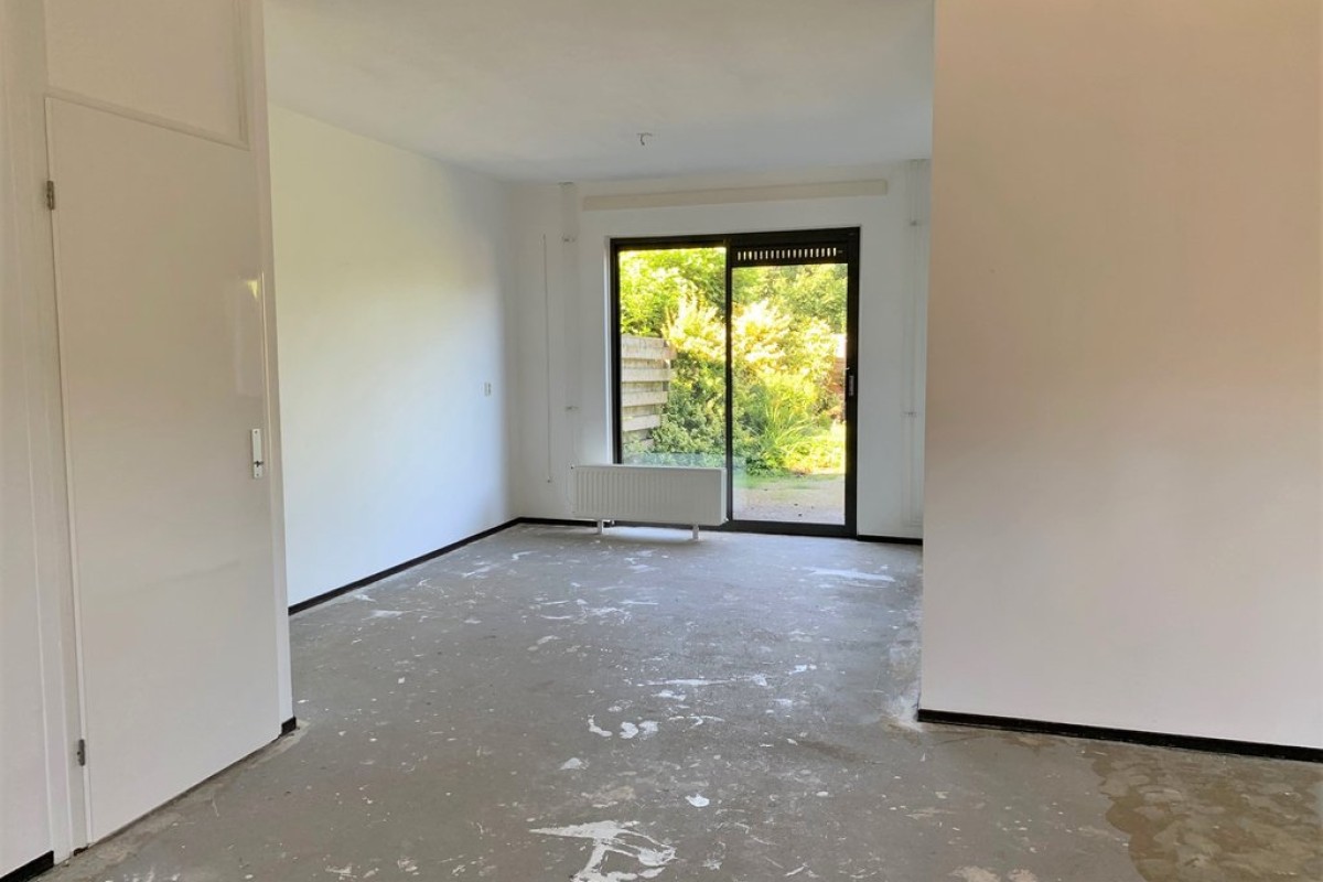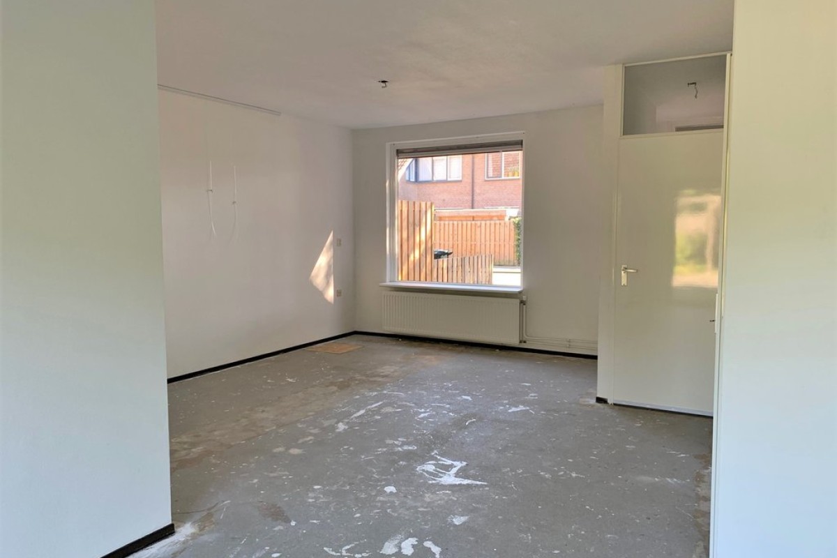 Entree, meterkast, toilet, Z-vormige woonkamer, aan de achterzijde bevindt zich de dichte keuken. De eetkamer aan de achterzijde beschikt over een schuifpui welke toegang geeft naar de diepe achtertuin met achterom.