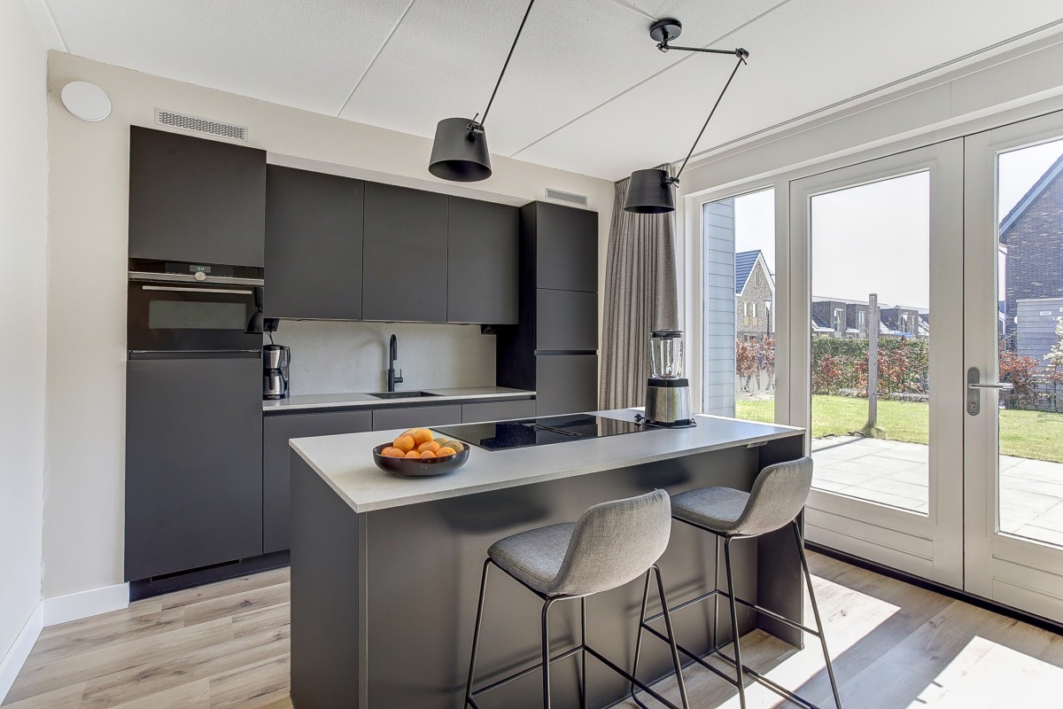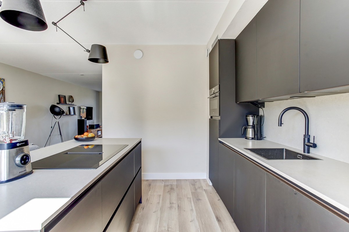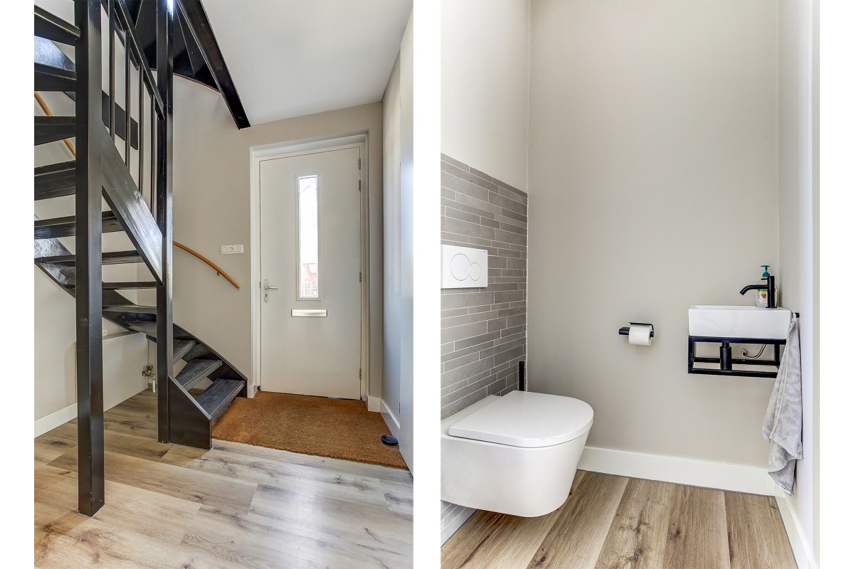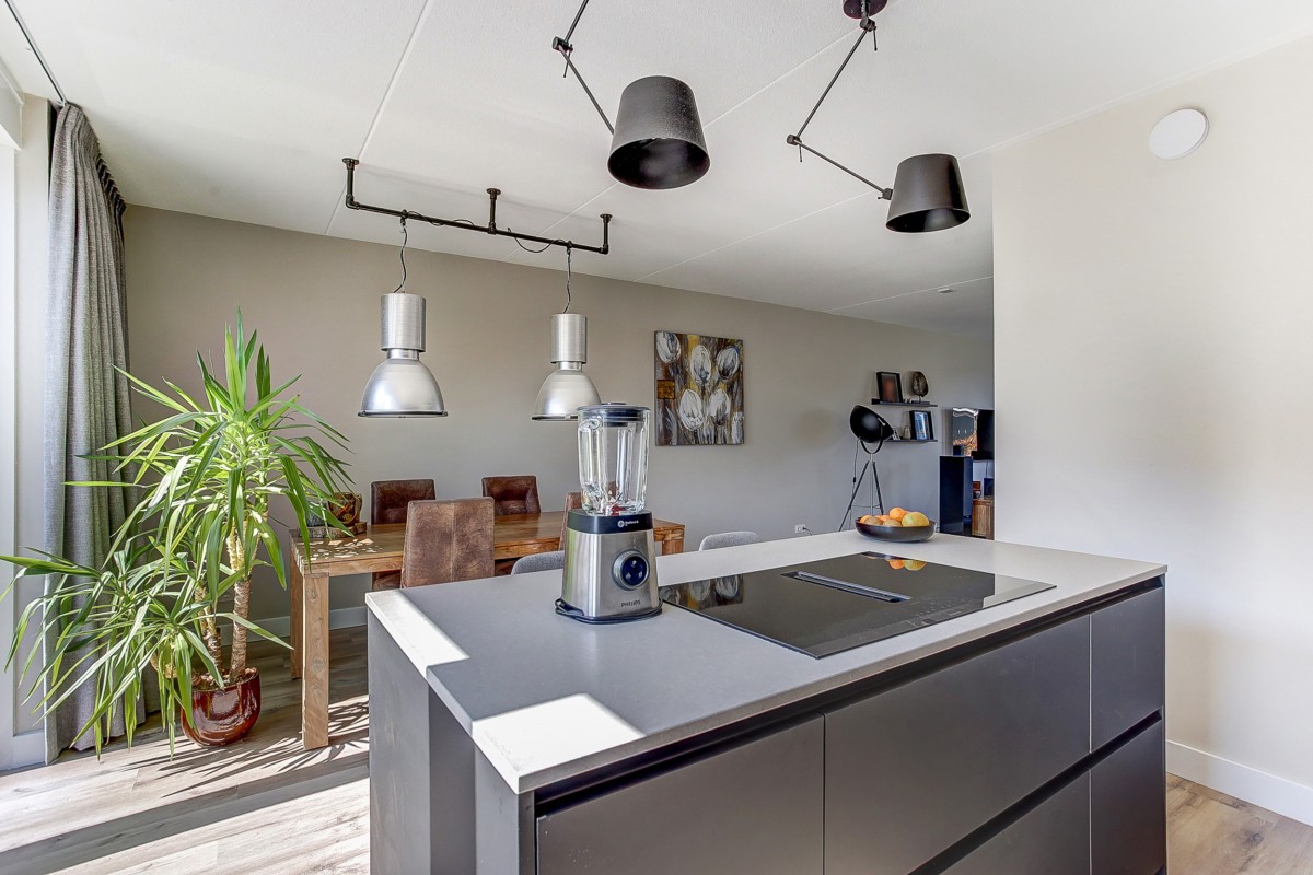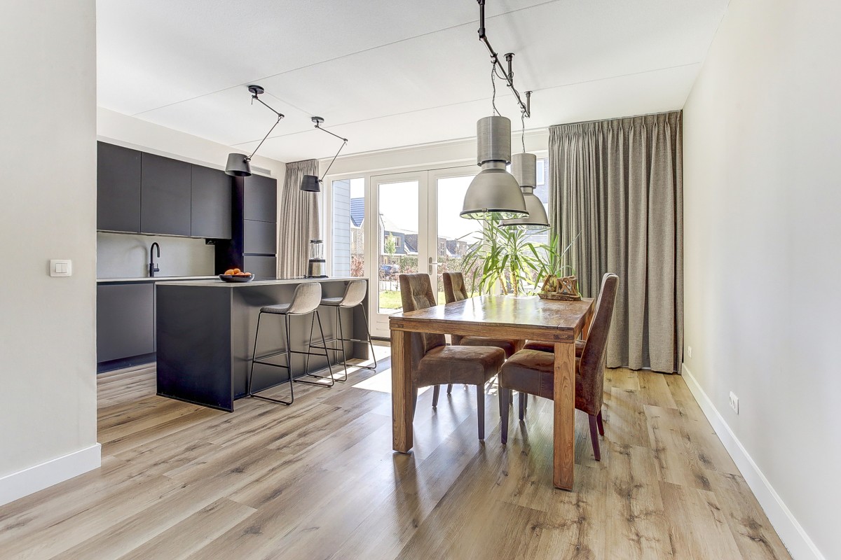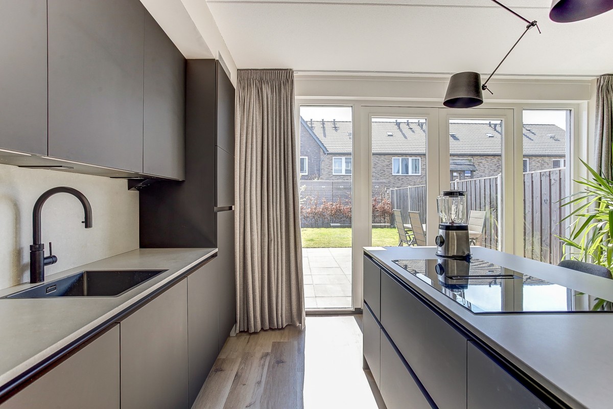 Begane grond: entree naar de ruime hal met uitgebreide meterkast voor o.a. een laadpaal, zonnepanelen en warmtepomp, een garderobe en een moderne toiletruimte met hangcloset en fonteintje. Een loopdeur geeft toegang tot de woonkamer welke uitzicht over de straat en groenvoorziening geeft. Aan de achterzijde van de woning is ruime eethoek gesitueerd met aansluitend de moderne keuken. De keuken beschikt over een kastenwand en kookeiland voorzien van veel kastruimte en een groot werkblad. Vanzelfsprekend is de moderne keuken van alle gemakken voorzien, zoals een ingebouwde koelkast, vrieskast, stoom-oven, vaatwasser, combimagnetron, Quooker en inductiekookplaat met downdraft afzuiging.
