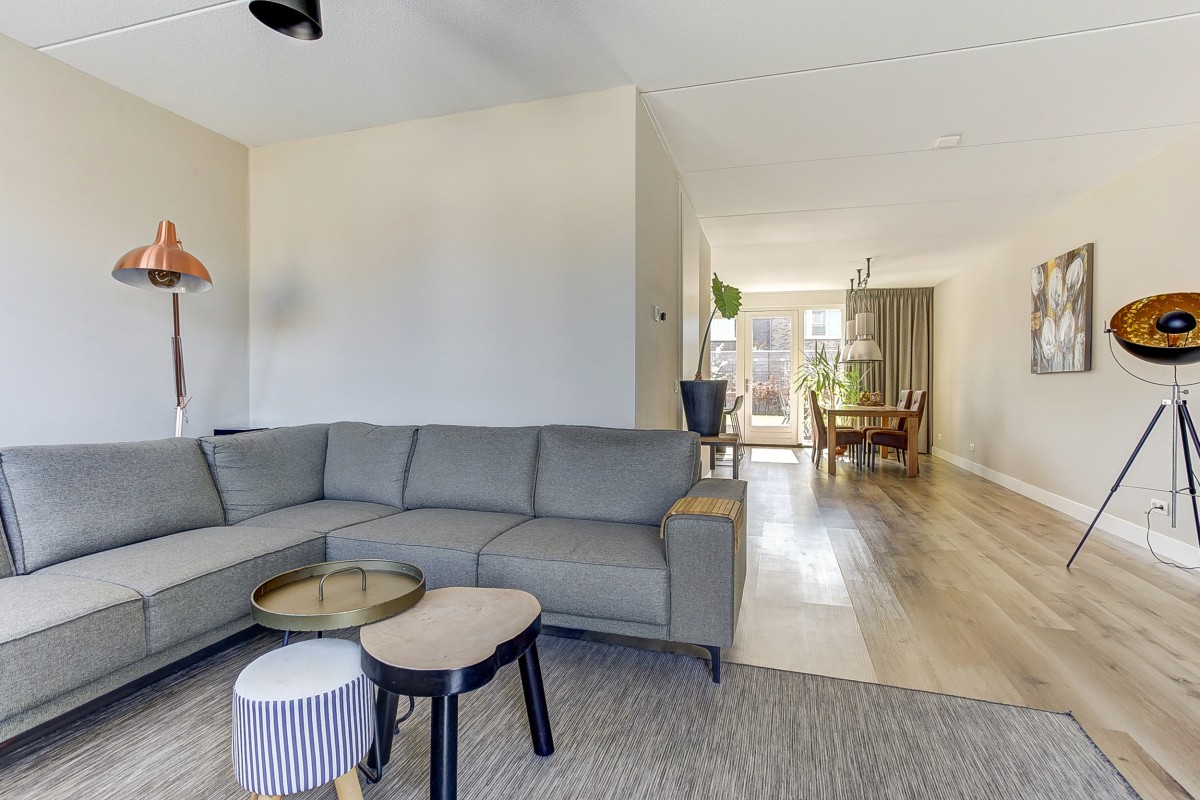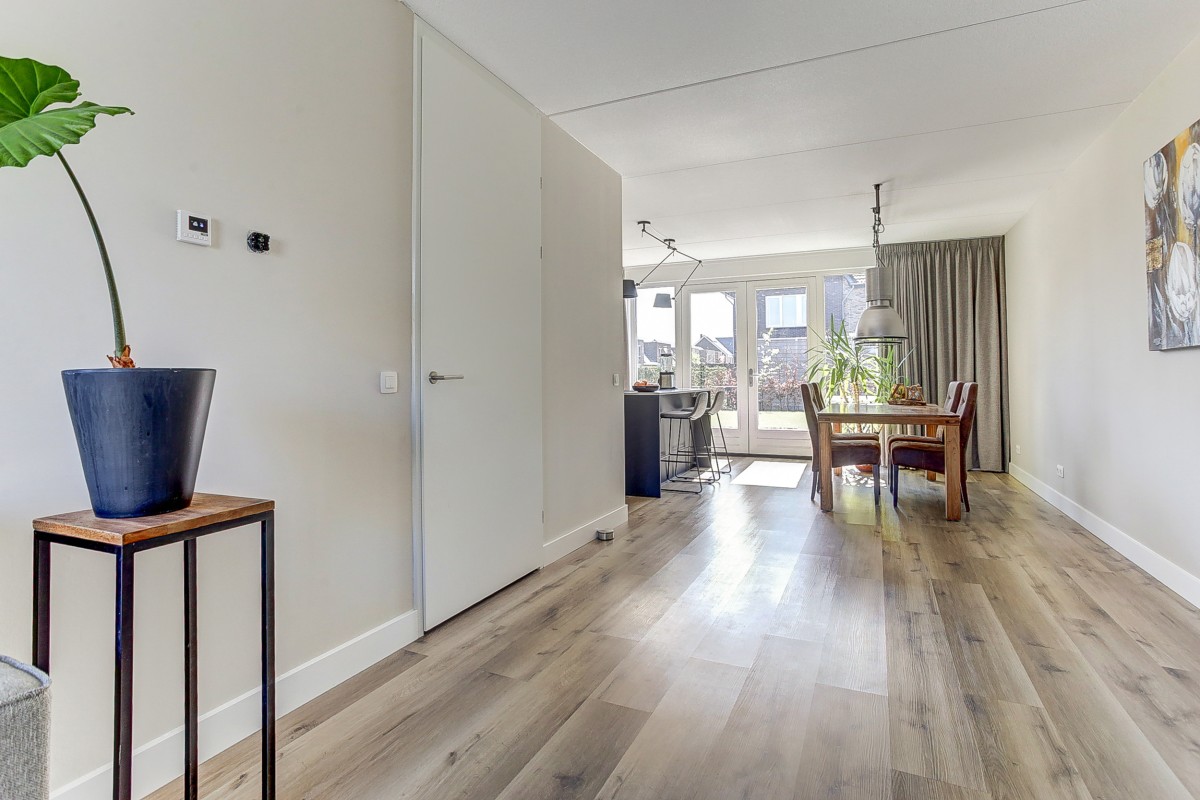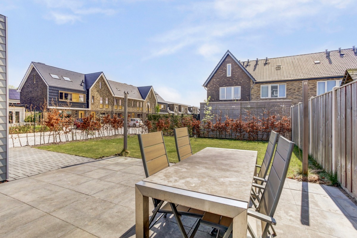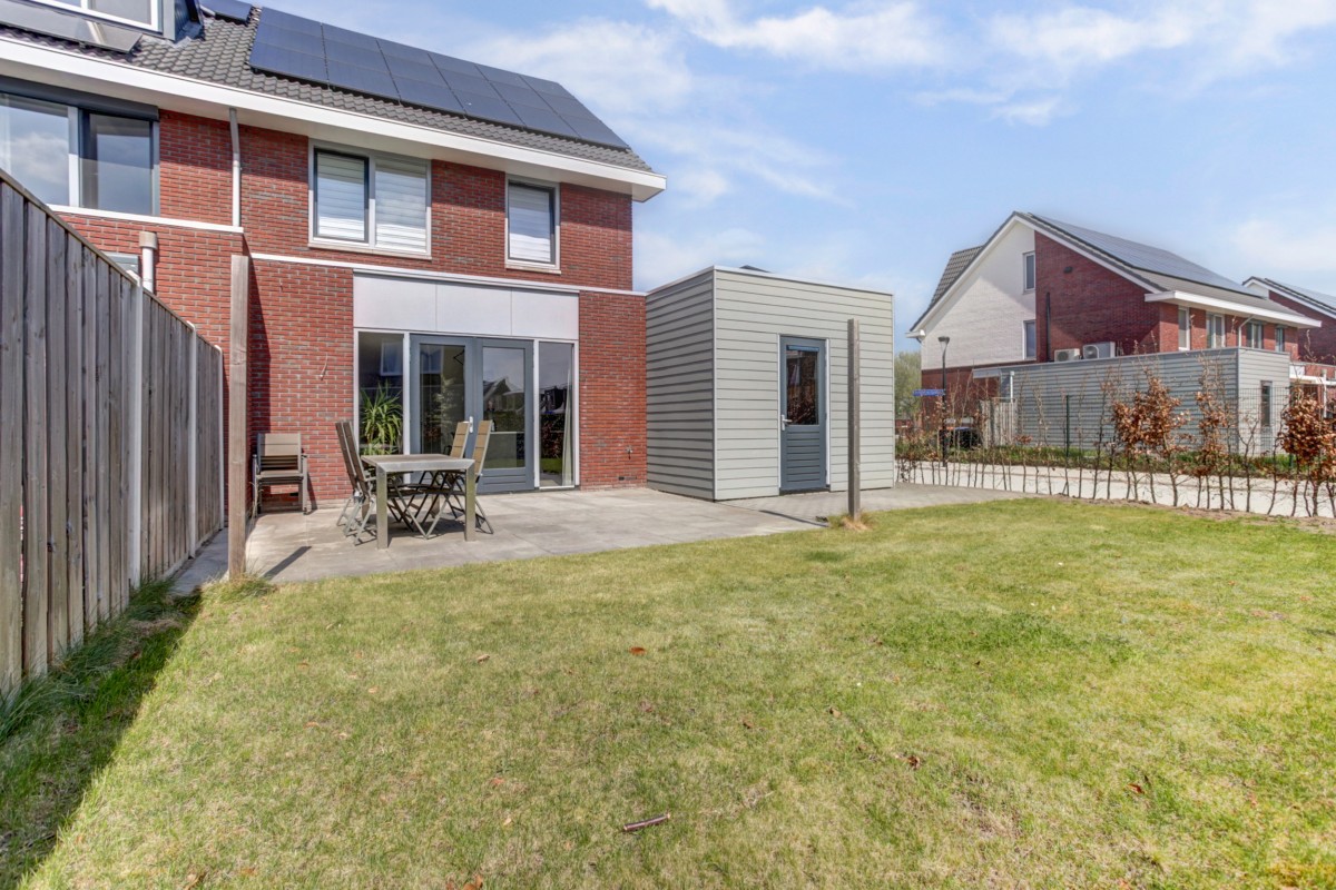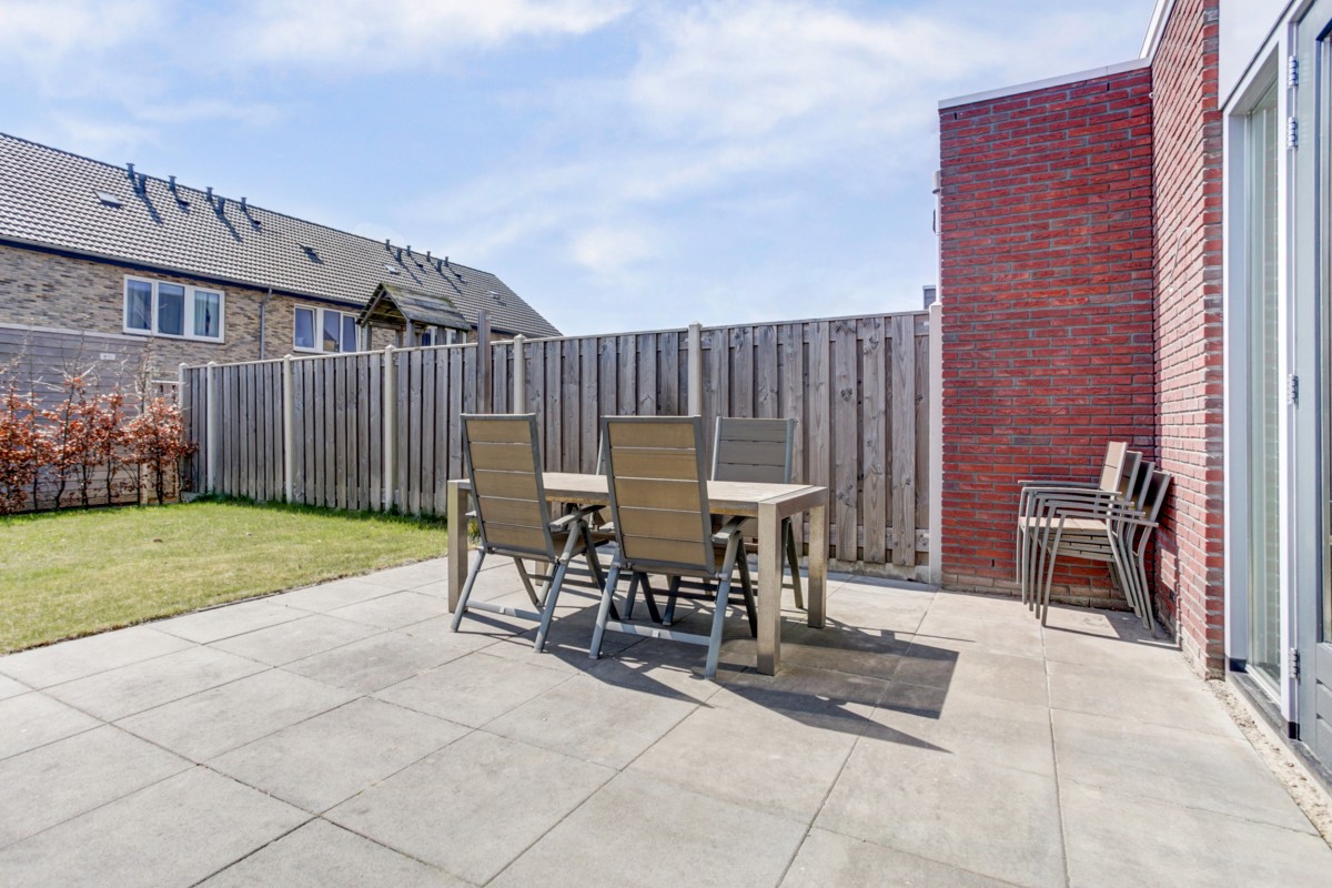 Vanuit de eethoek geven openslaande deuren toegang tot het zonneterras. Vanuit de tuin alsmede vanuit de oprit is de aangebouwde geïsoleerde berging met betonvloer bereikbaar. De tuin is op het zuiden gelegen, zeer ruim van opzet en voorzien van een gazon, hagen en een groot zonneterras. De begane grondvloer is verwarmd middels vloerverwarming gecombineerd met een moderne laminaatvloer.