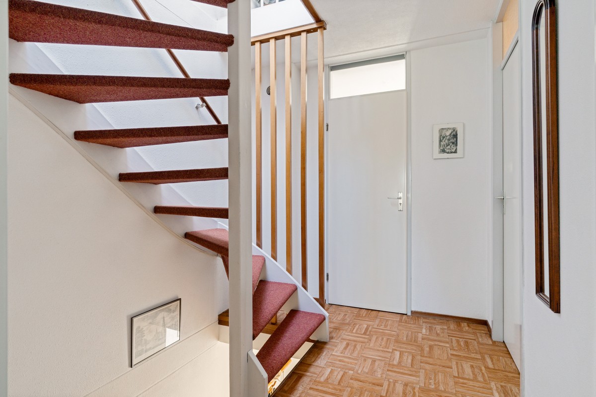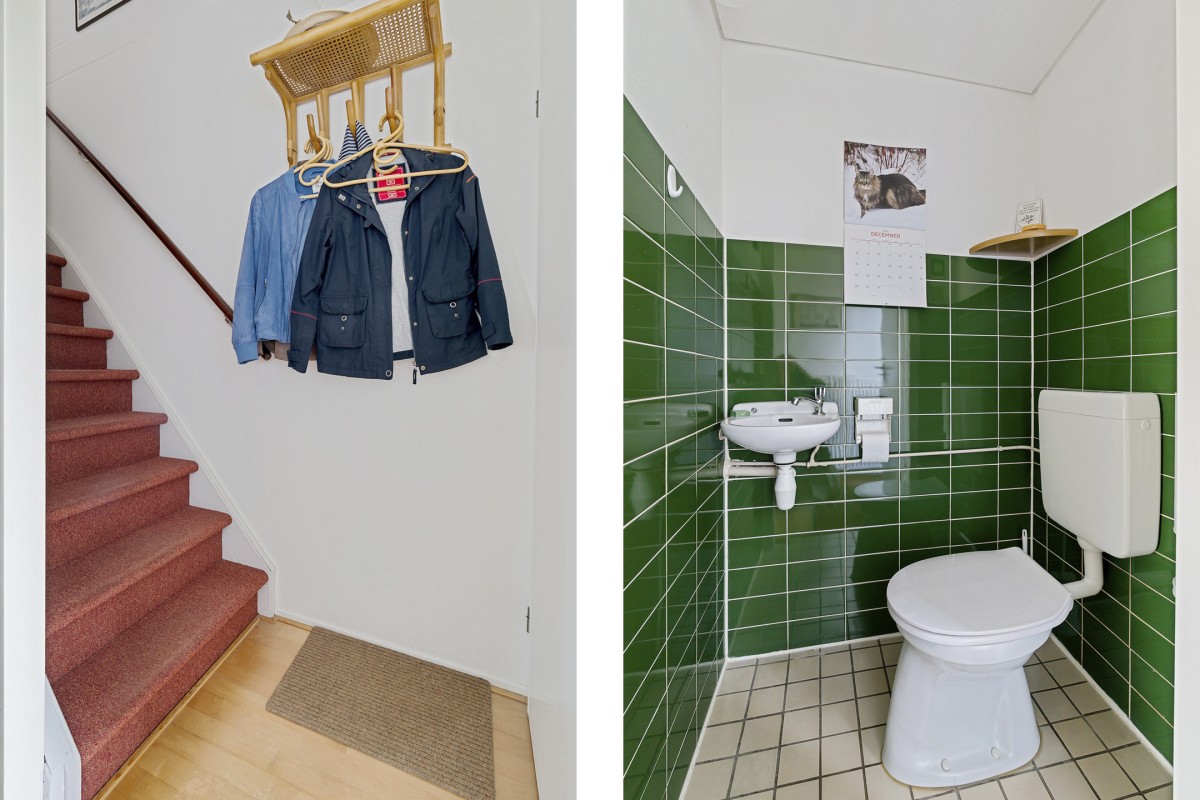 Entree, hal met toegang tot het toilet met fonteintje, vernieuwde meterkast met glasvezelaansluiting, trap naar de verdieping en deur naar de woonkamer.