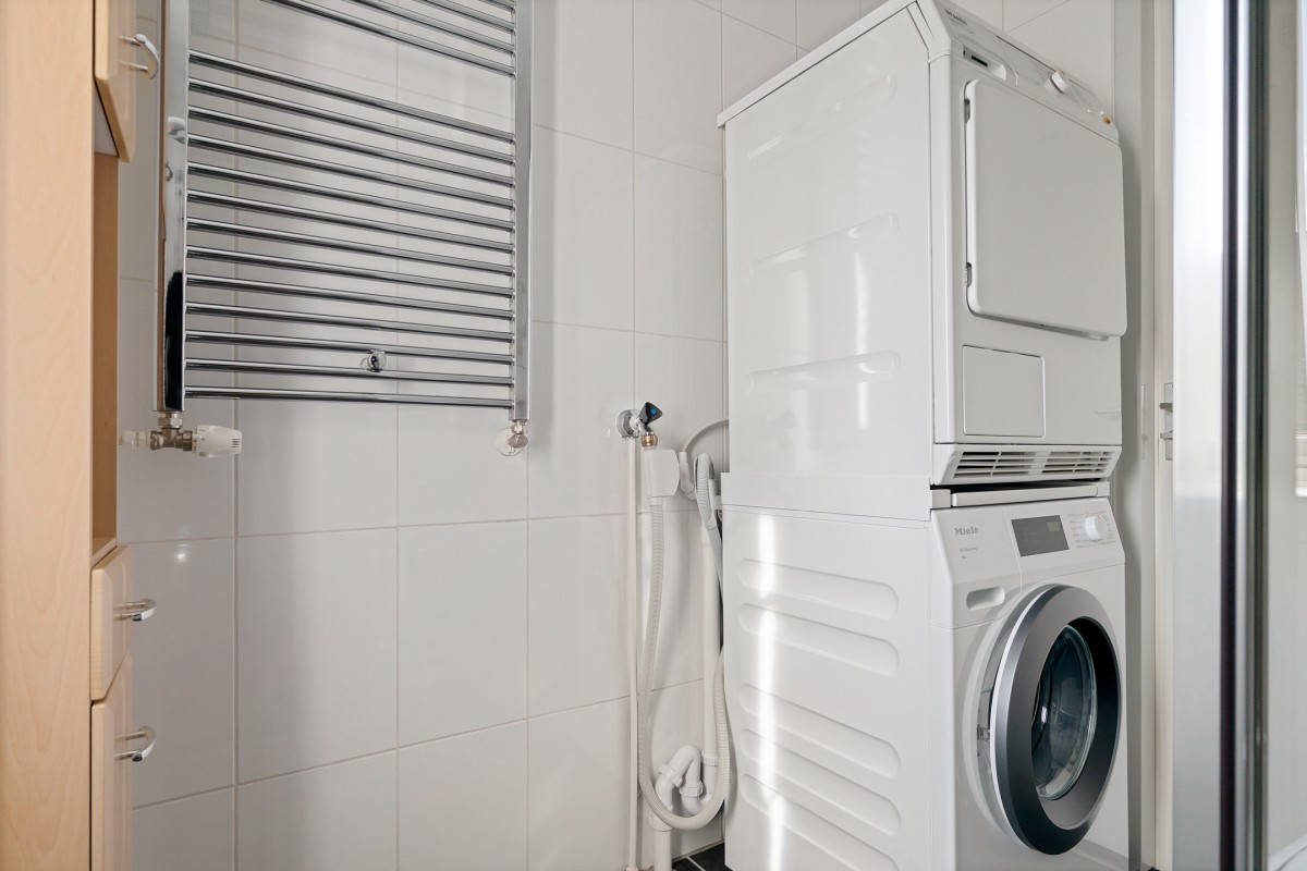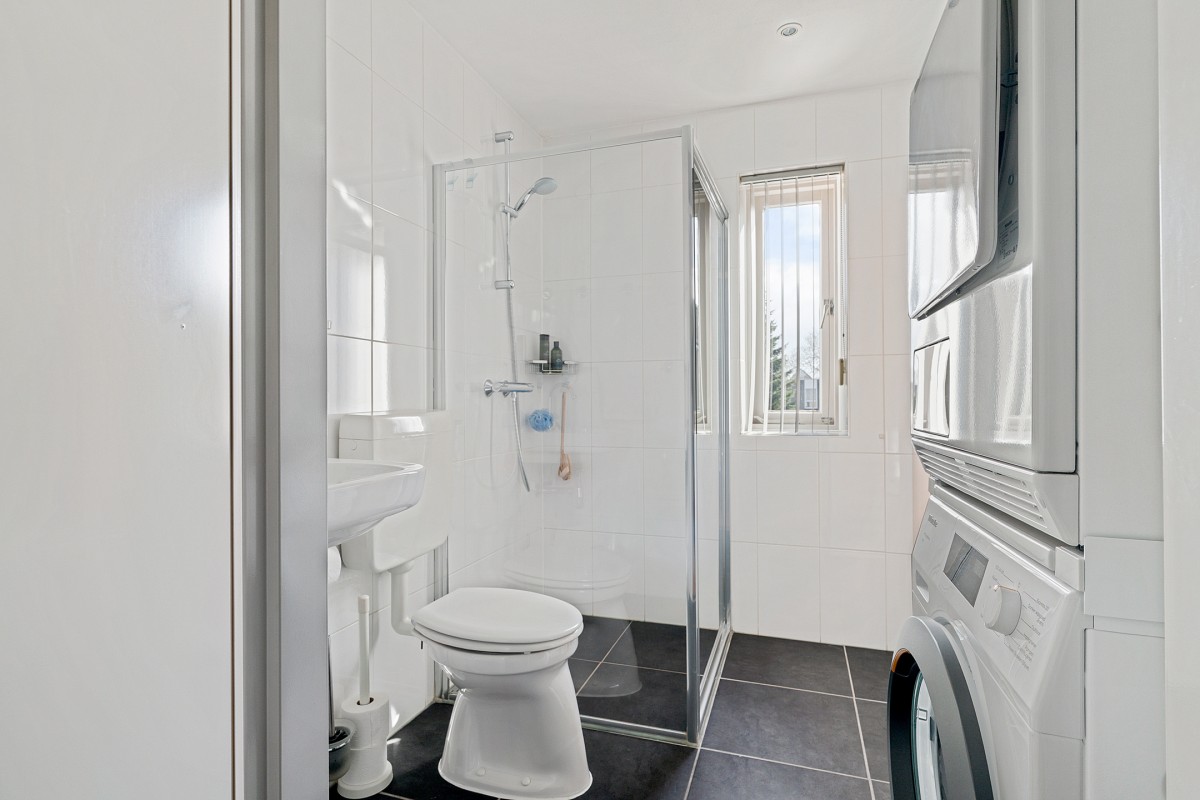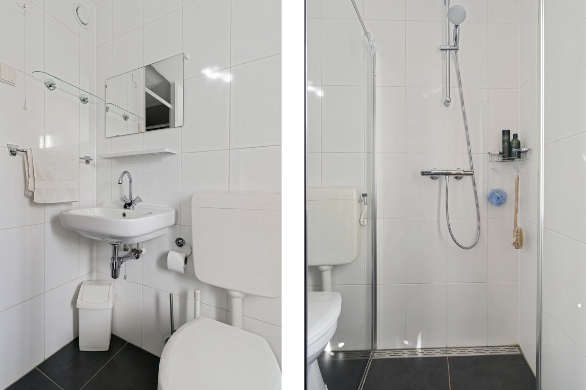 De badkamer is voorzien van een douche, toilet, wastafel en de aansluiting voor de wasmachine.