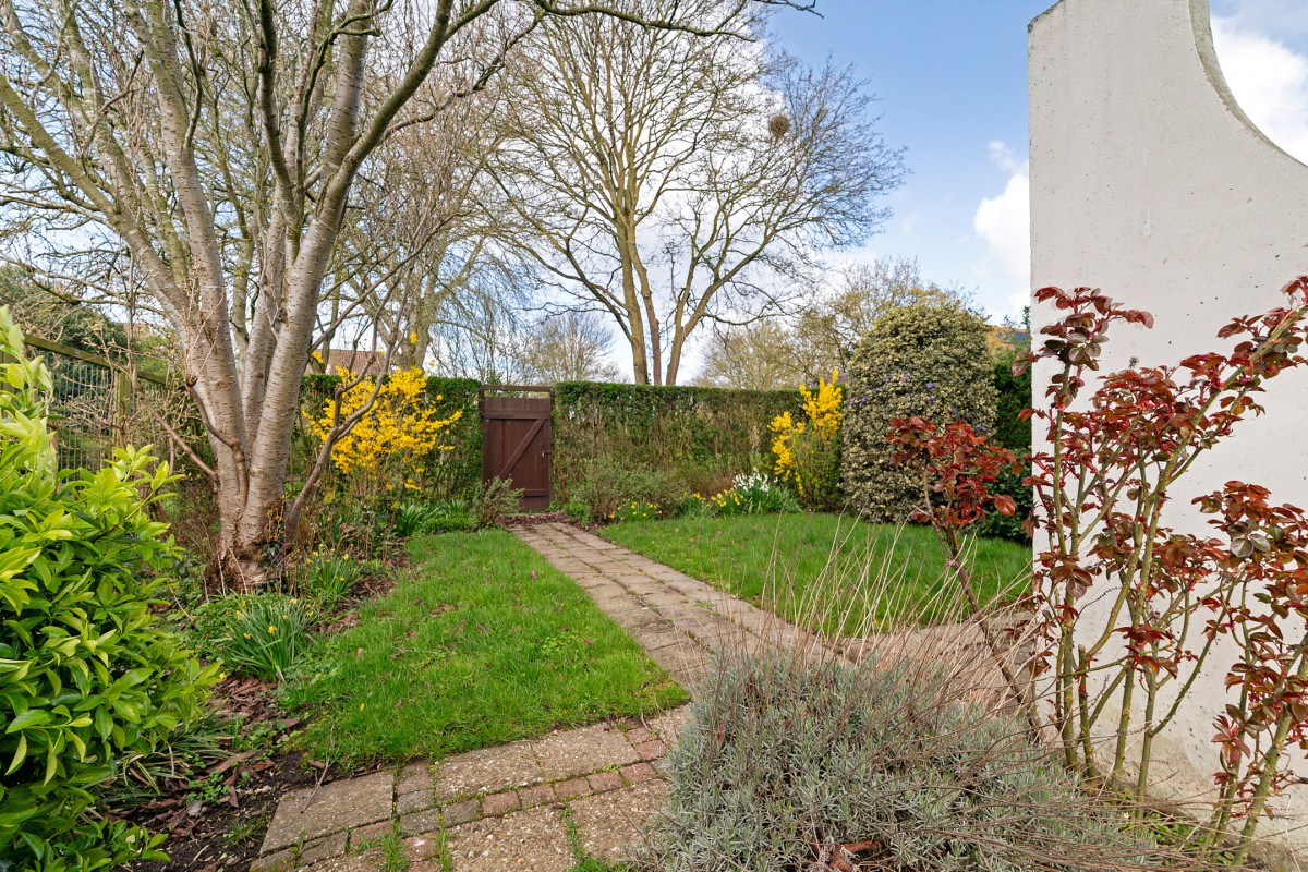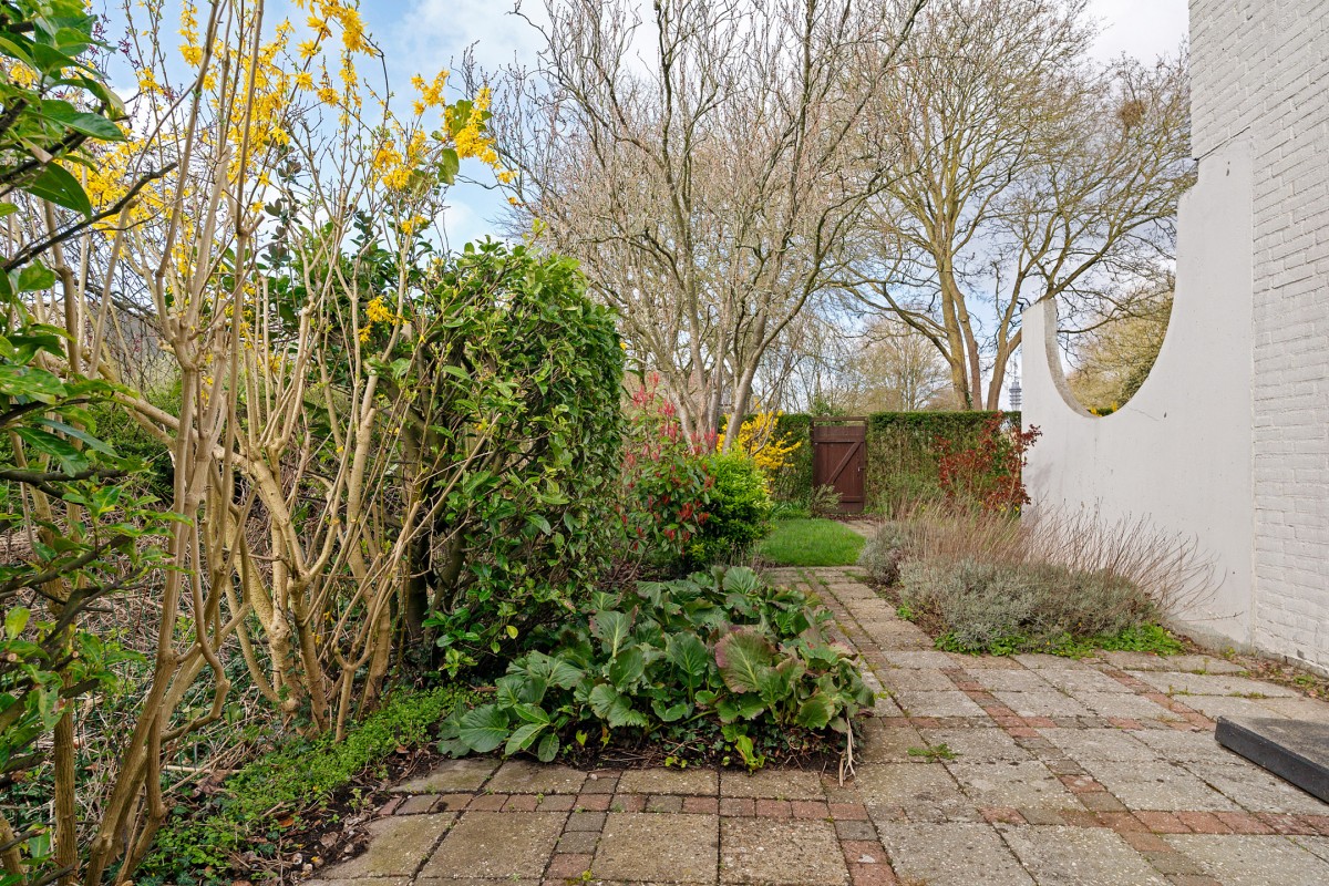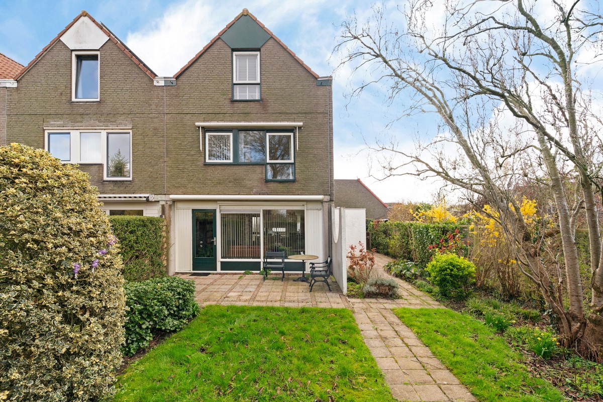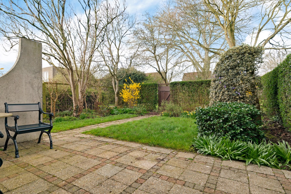 De achtertuin met achterom is gelegen op het westen. Deze "groene" tuin is voorzien van een haag, gras, diverse bomen, planten en bestrating.