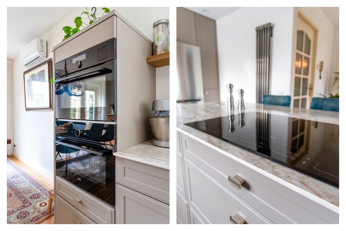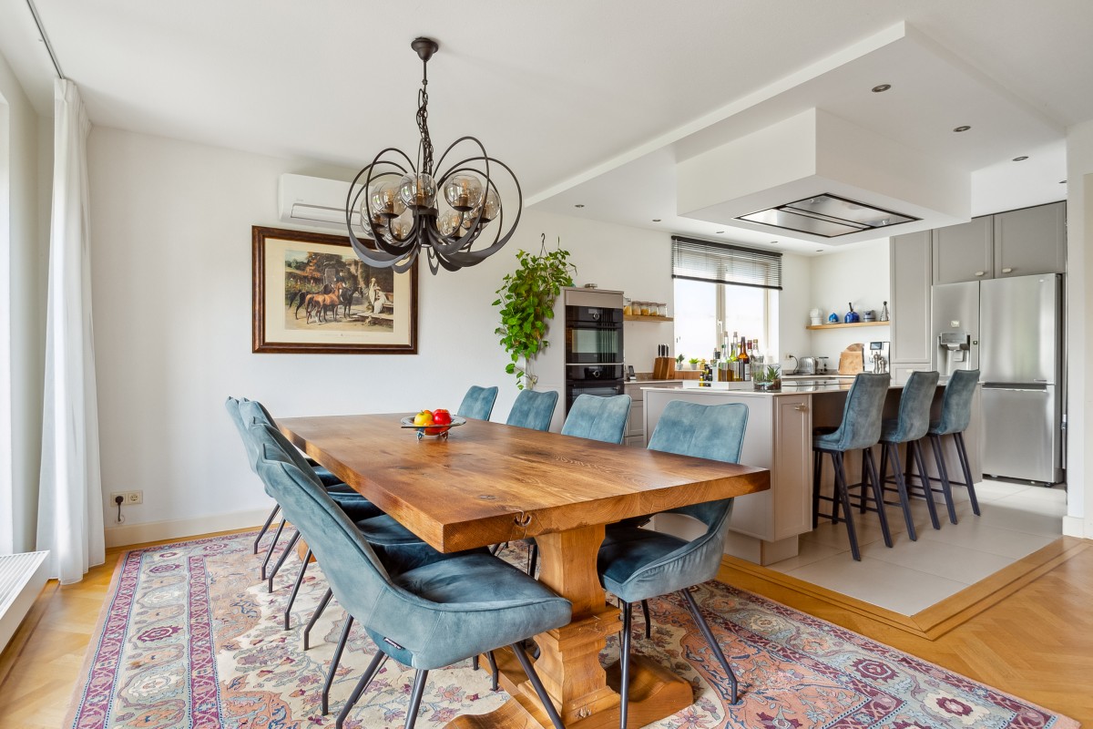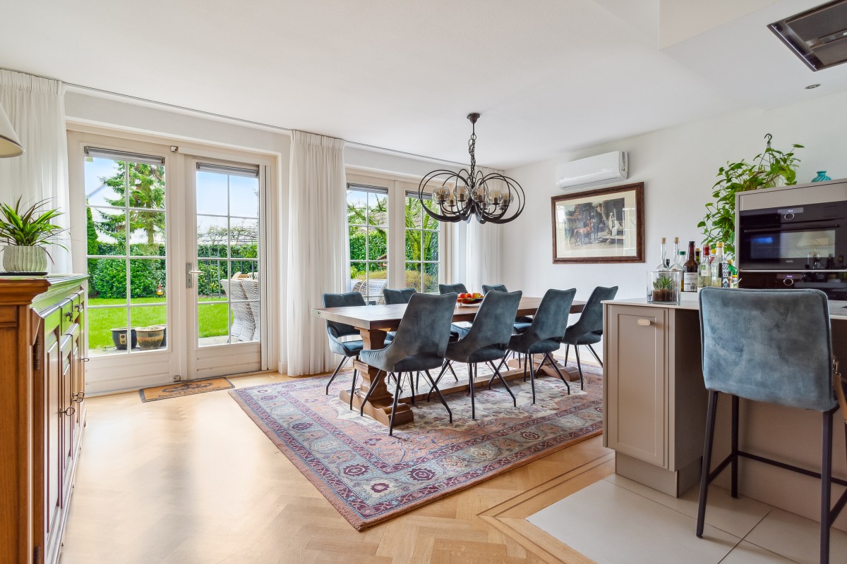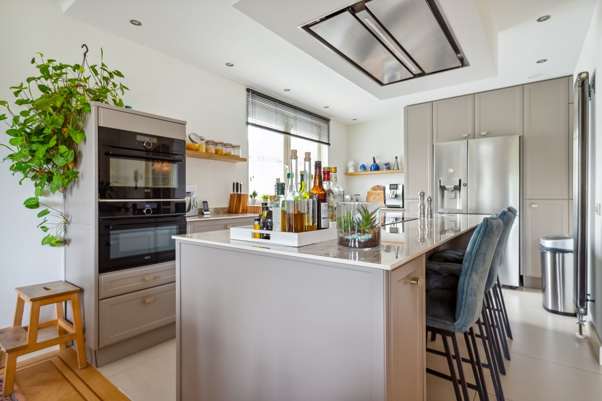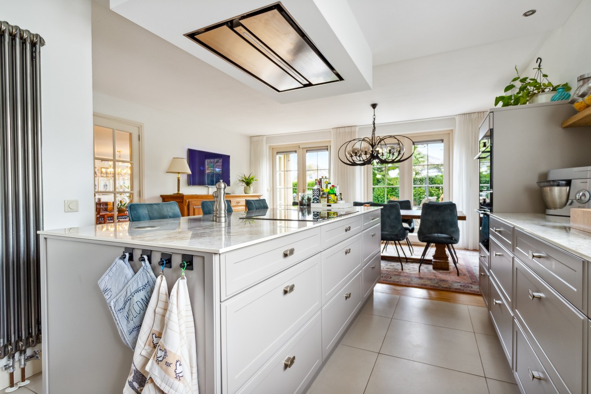 De woonkeuken is zowel via de hal als de woonkamer bereikbaar en biedt voldoende ruimte voor een groot gezelschap. Terwijl je een maaltijd bereidt, kunnen je gasten gezellig aan de ruime eettafel borrelen. De keuken is uitgerust met een groot kookeiland, Amerikaanse koelkast, vaatwasser, 5-pits inductiekookplaat (geschakeld met de afzuigkap), combi-stoomoven en combi-magnetron. De keuken heeft een plavuizen vloer met vloerverwarming.