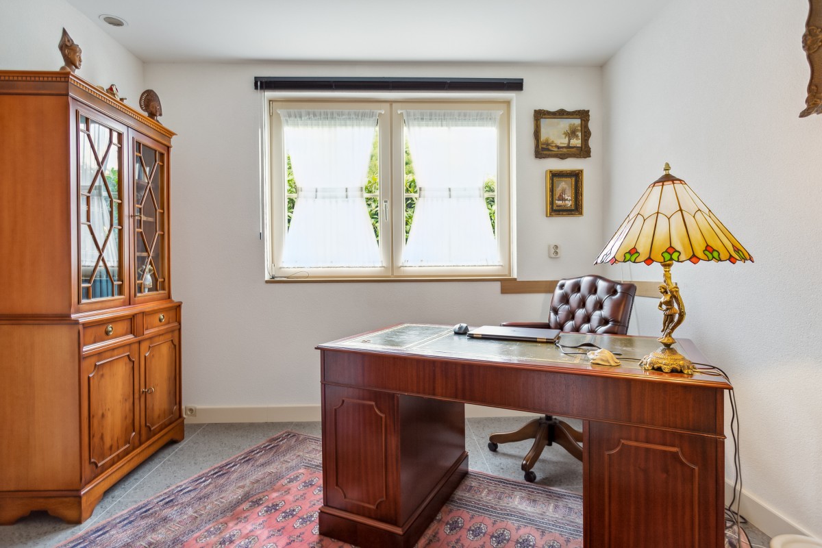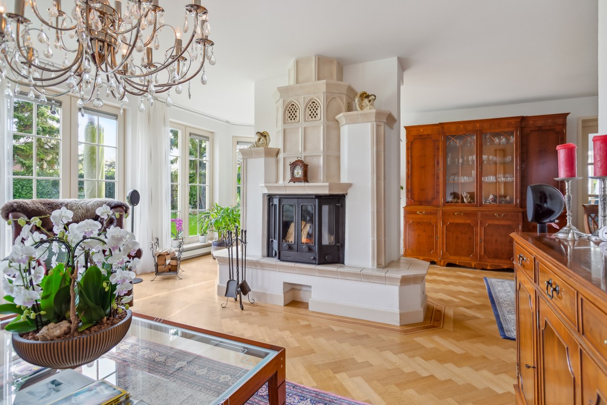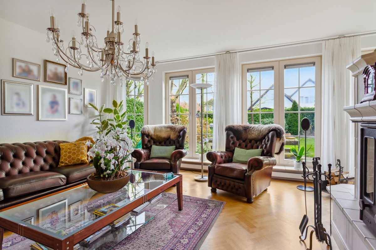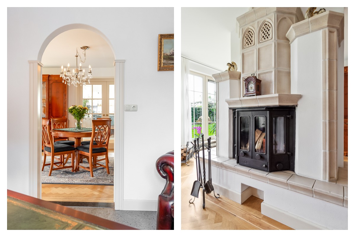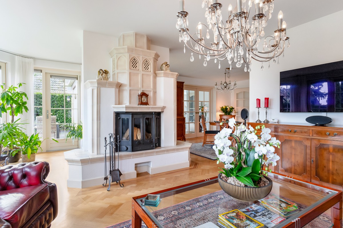 De woonkamer is heerlijk licht door de vele raampartijen. Via een deur is er toegang tot de prachtige tuin. De ruime woonkamer met genoeg ruimte voor een tweede eettafel, is voorzien van een massief houten visgraatvloer met band en bies. De tegelkachel houdt je in de winter warm en is tegelijkertijd een sfeervolle toevoeging. Naast de woonkamer bevindt zich een studeerkamer/werkkamer, voorzien van plavuizen met vloerverwarming.