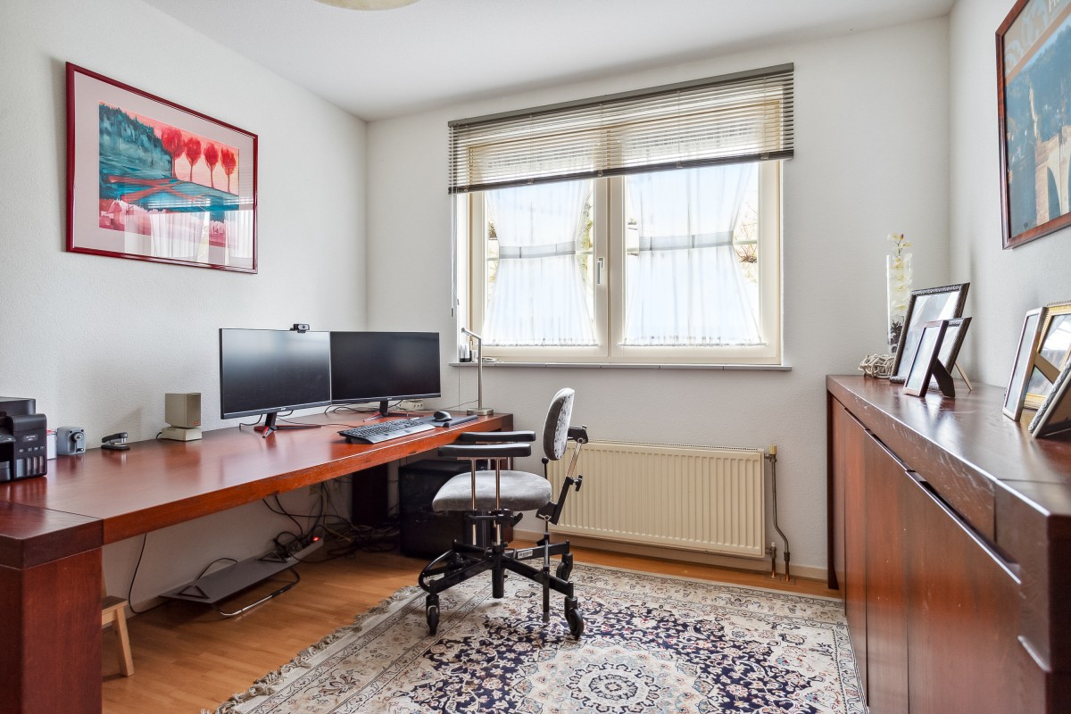Op de begane grond bevindt zich tevens een werkkamer (die ook als slaapkamer kan dienen) en een badkamer met toilet, wastafelmeubel, douche en vloerverwarming.