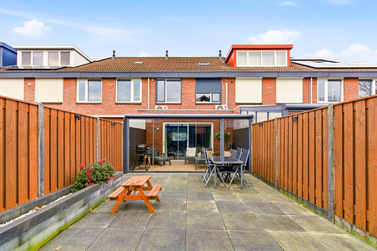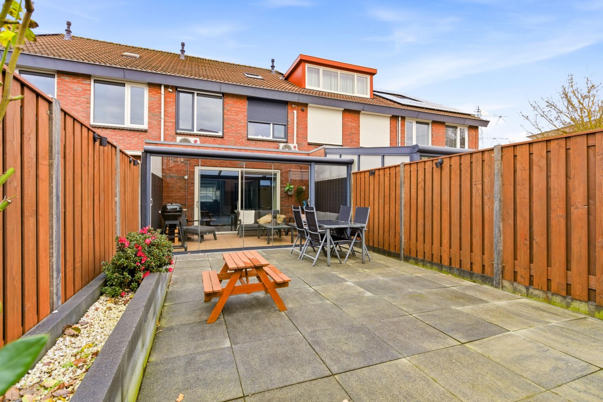 De achtertuin ligt op het zuidwesten en biedt volop ruimte voor een grote, lounge-set en zelfs een trampoline! Onder de terrasoverkapping met glazen schuifdeuren kan je ook 's avonds heerlijk buiten zitten of van de warme winterzon genieten.