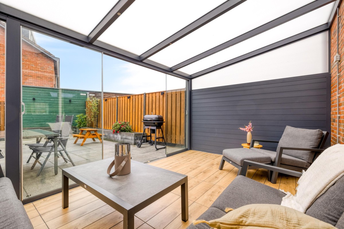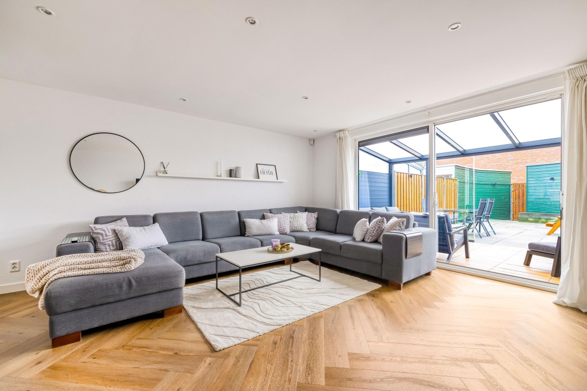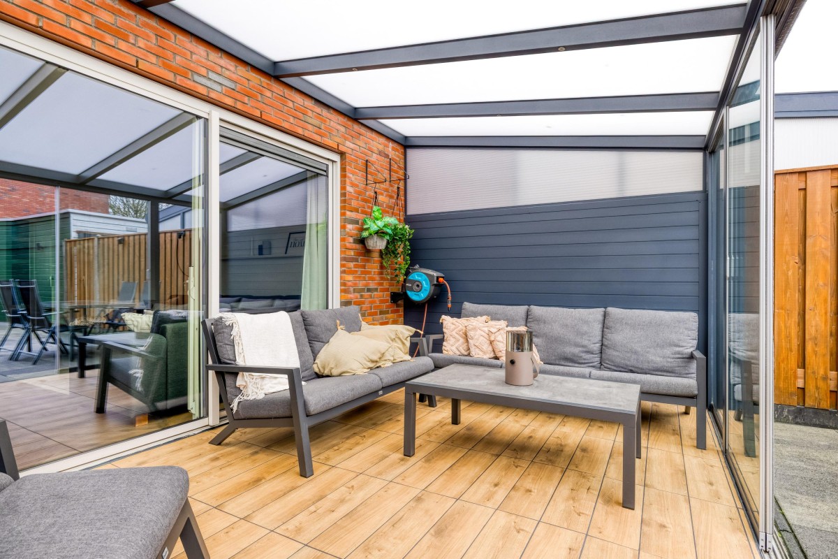 De lichte, tuingerichte woonkamer heeft een ruime schuifpui die binnen en buiten met elkaar verbindt. Geniet van de luxe terrasoverkapping met glazen schuifwand en verlichting, perfect voor elke seizoen!